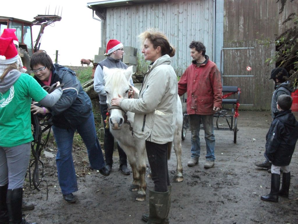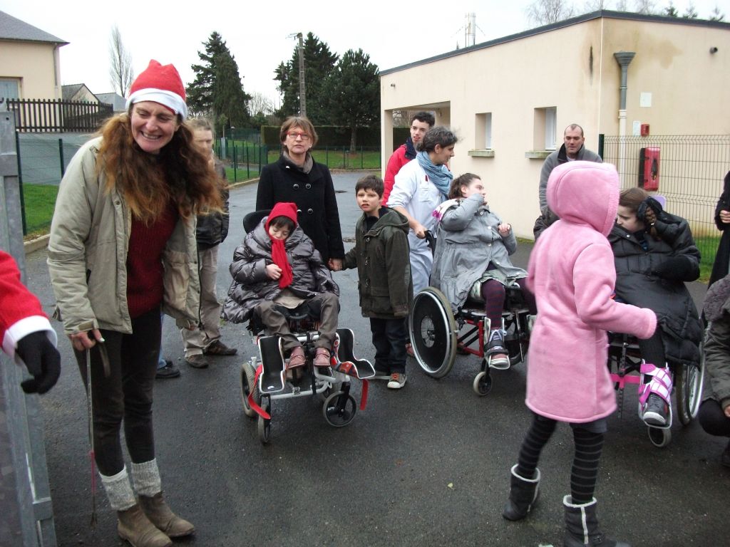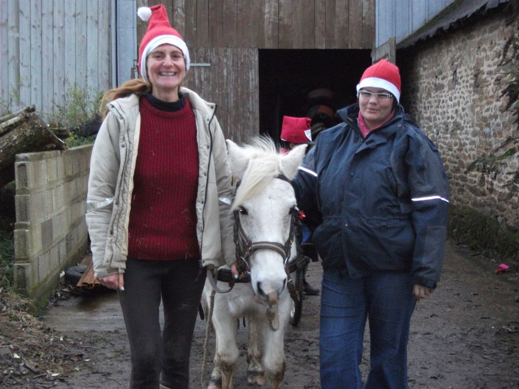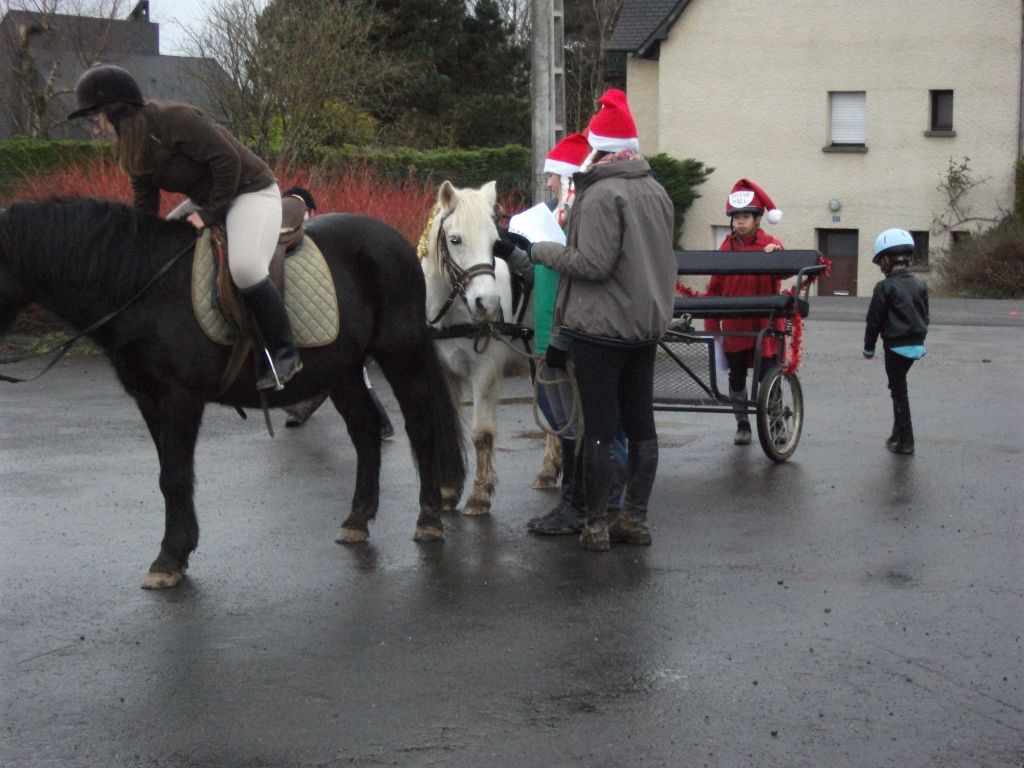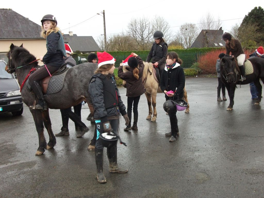 Tout ce petit monde s'est dirigé vers l'IME pour aller rendre visite aux résidents tout d'abord puis vers la Maison de Retraite dans un second temps. Les enfants avaient préparé gâteaux, crêpes ... qu'ils ont distribués aux résidents. Jean-François, notre talentueux cavalier-chanteur a animé ce moment unique. Tout le monde avait le sourire. Petit désagrément : la pluie s'est mêlée à la balade, la petite Salomé et Moranne ont tenu à monter malgré le temps ( forte motivation !), et nous avons tous finis traversés par l'eau glacée ... Heureusement, Olivier nous a préparé un bon feu à la maison, les enfants ont enfilé une nouvelle tenue sèche. Nous avons passé un super moment ensemble. Cette rencontre entre les cavaliers ( section sportive, licenciés ) et résidents était un voeu cher qui s'est réalisé grâce à la motivation de tous : enfants et parents, alors un grand merci ! Merci aussi aux bénévoles qui savent donner de leur temps : Père Noël, les encadrants et Anne notre photographe. Merci aussi aux journalistes d'être venus !