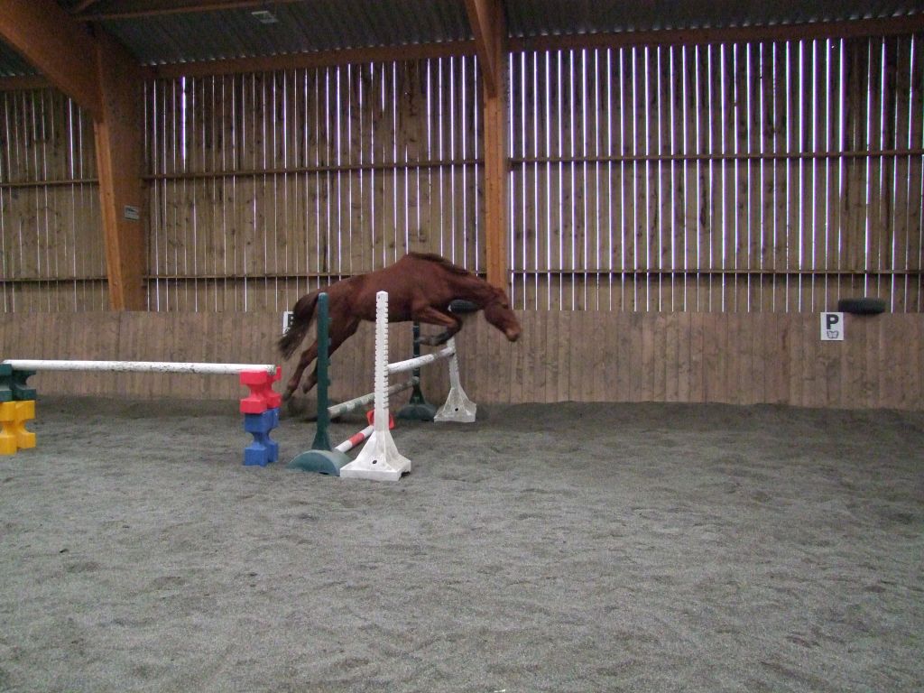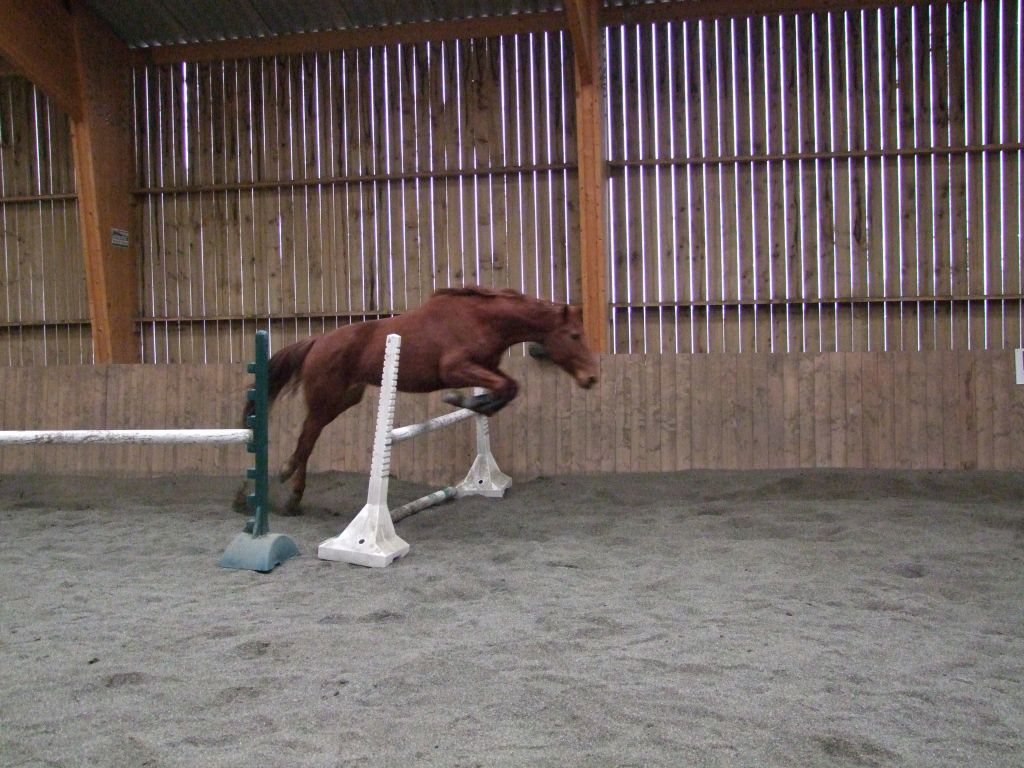 Après son débourrage de décembre, notre grande jument alezane continue son périple; Elle a réussi brillamment son intégration avec les plus grands sous ma selle puis sous celle de Sébastien samedi dernier; on a pu apprécier son sérieux au boulot, et sa volonté de bien faire. Et puis, dimanche, nous avons pris le temps de la faire sauter en liberté, nouveau test réussi. Pas de vice, toujours bonne élève au travail avec même un peu de joie ! les barres n'ont pas l'air de l'intimider, elle monte bien le garrot et plie plutôt bien ses genoux. Petite anecdote : j'avais laissé un morceau de pain sur une chaise pour la récompenser, et bien la demoiselle, après un des derniers sauts a jugé qu'elle avait bien fait et s'est récompensée toute seule en prenant le pain délicatement.