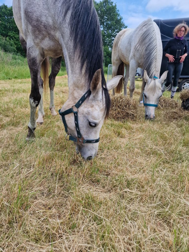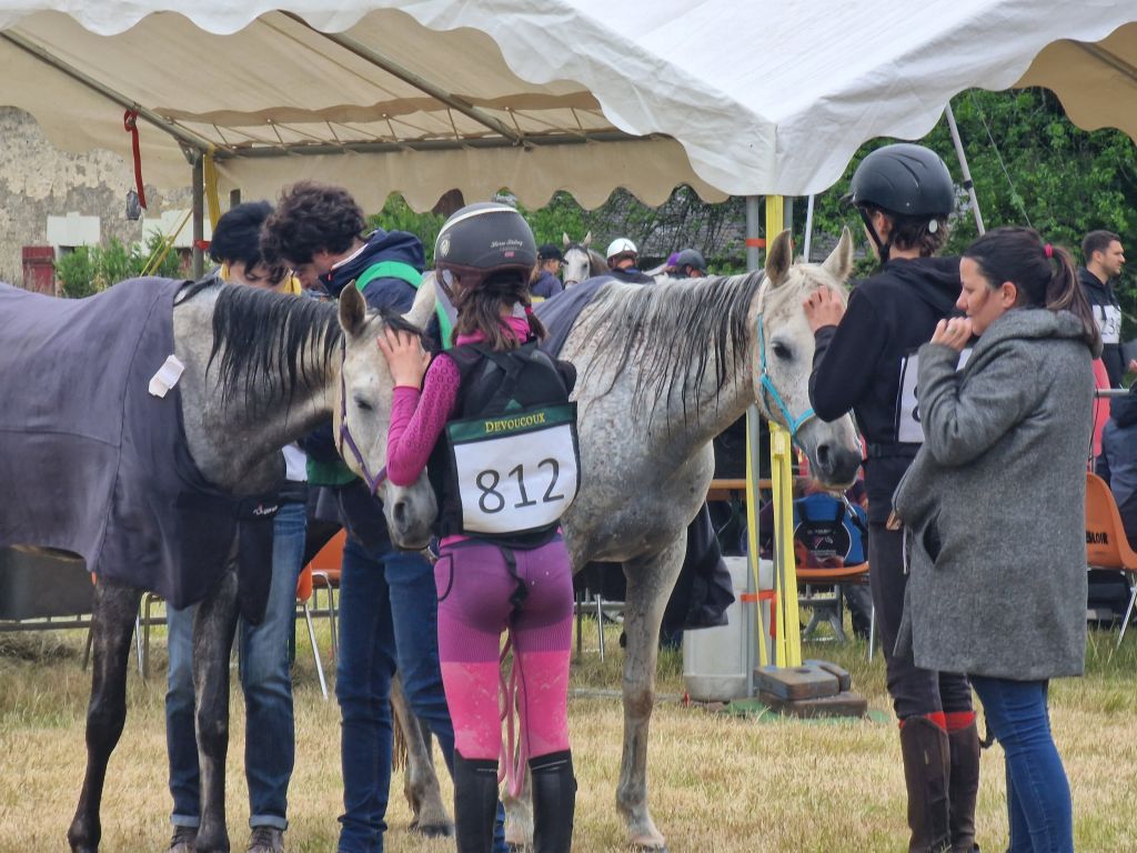 Les cavaliers, pas vraiment fatigués, s'occupent de leur monture : réhydratation, relance du transit, soin des membres... Les juments vont bien, à peine fatiguées... c'est de bon augure pour la suite.