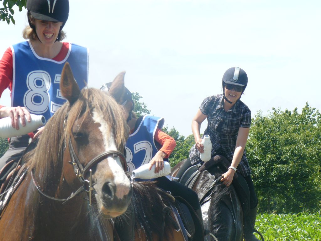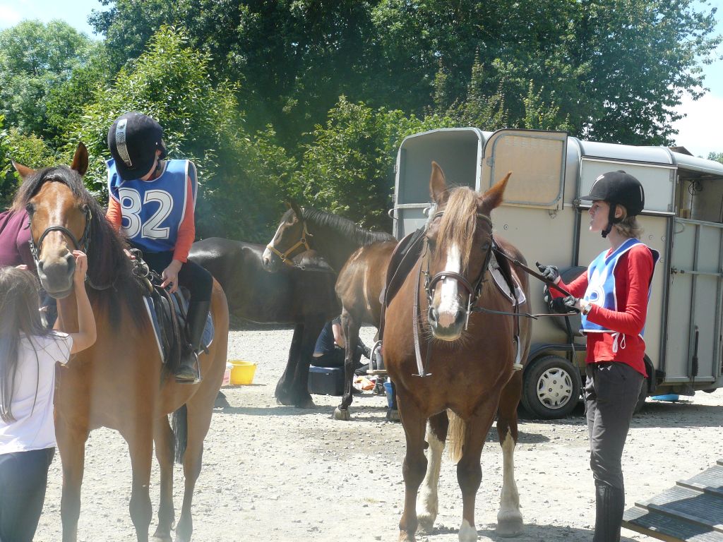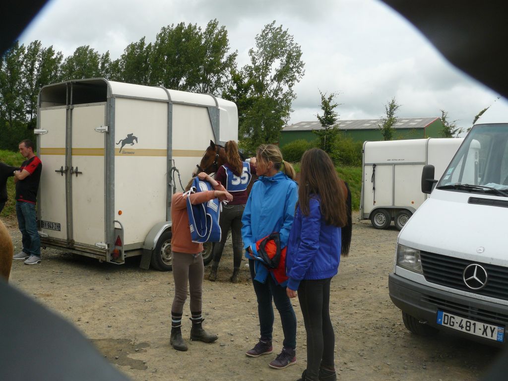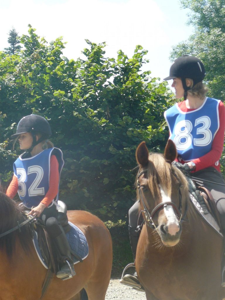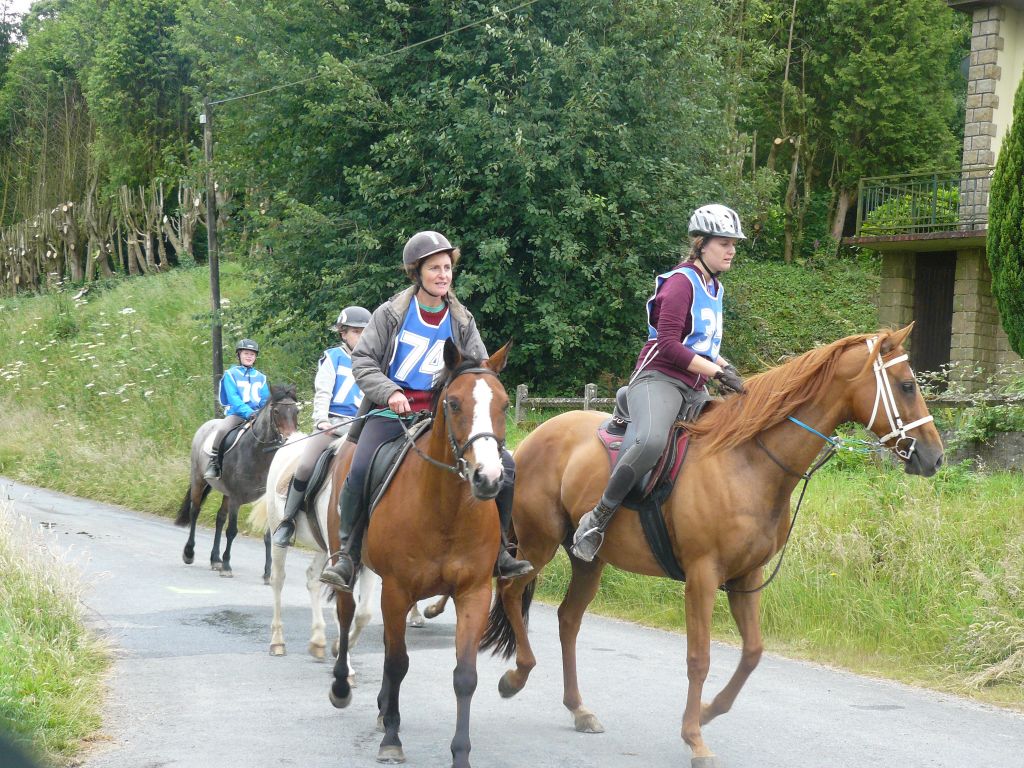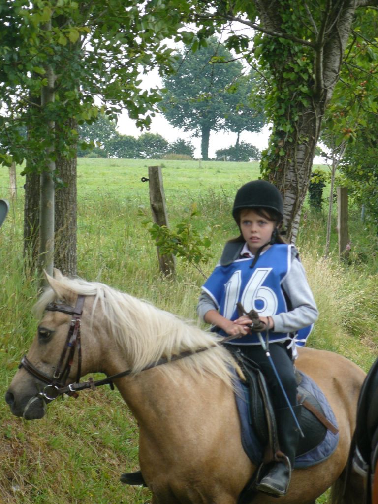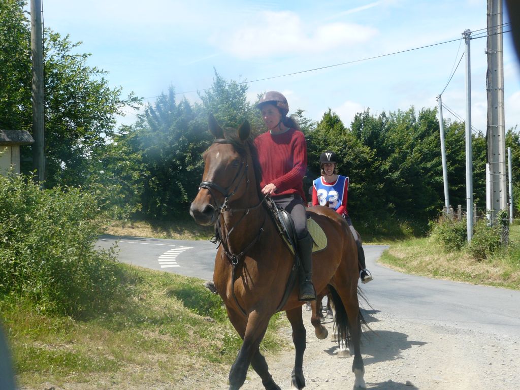 Autant d'aventures en si peu de temps, cela faisait bien longtemps ! l'organisation était chaude mais pourtant faisable; nous devions partir entre 9h30 et 10h sur la course pour que je puisse accompagner Hélo sur une deuxième boucle pour la première 40 de Féfé, sans oublier Thaïs ensuite sur la 10 kms. Après un petit caprice de Bob le camion, nous sommes partis en retard donc départ sur la course à 10h15, pas trop mal. Nous voilà à cheval avec nos tous jeunes cavaliers : Moranne avec Katia, Léo et Jet, Maeva et Léo, Hélo à mes côtés avec Féfé qui devient de plus en plus cool à l'embarquement. Beau début de course pourtant avec une bonne avance de prise, mais premier incident : Féfé se déferre à l'antérieur gauche; obligés bien sûr de faire attention aux cailloux ... le sort s'acharne sur nous puisque au beau milieu d'une galopade dans un champ de maïs, mon étrivière casse ! le temps de retrouver mon étrier, de réfléchir à une solution, le chrono lui ne nous attendait pas. Quelques kms plus tard, mon étrivière recassait... Marie-Christine finit par nous localiser avec une nouvelle étrivière après qu'hélo se soit débarrassée d'une partie de sa martingale en guise d'étrivière. A 10 kms, nous étions descendus à 9kms/h environ, il fallait remonter; heureusement, les terrains galopants nous ont aidés à rattraper une partie de notre retard, les jeunes cavaliers tenaient bon ! bref, la ligne d'arrivée fut franchie à 11,23 kms/h, 7 mn de retard seulement ! Côté cardio : Katia termine à 43, Léo 48, Jet 57, Mister 49, et Féfé était à 44. Nous étions 7 engagés, malheureusement 2 engagements terrain se sont rajoutés et ont évité la 2nde place à Moranne et Katia qui terminent 4ème sur 9, Maeva et léo 6ème, Mister 7ème, Léo et Jet 8ème. Bilan : garder son maréchal avec soi, prendre une étrivière de rechange, mais quel groupe solidaire !