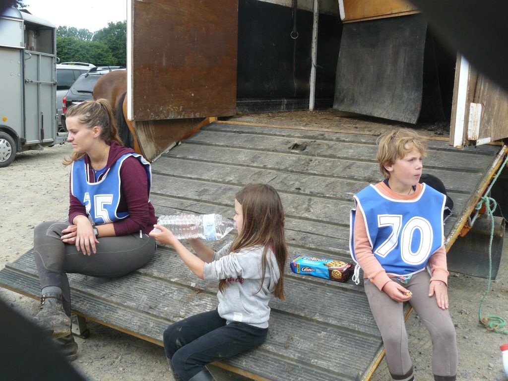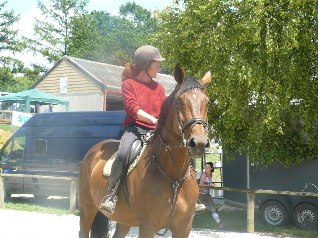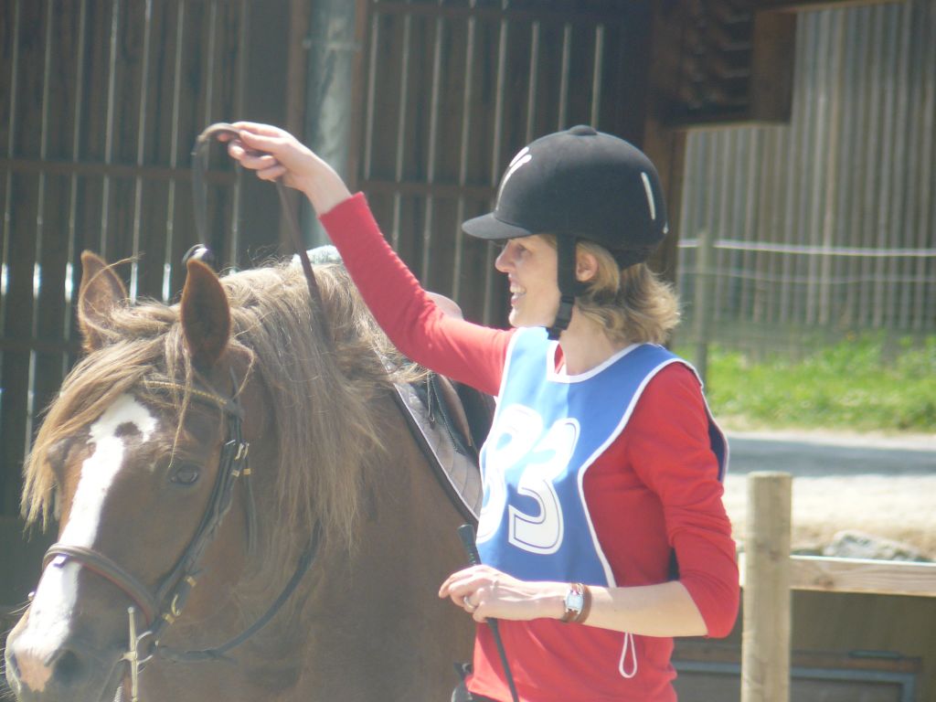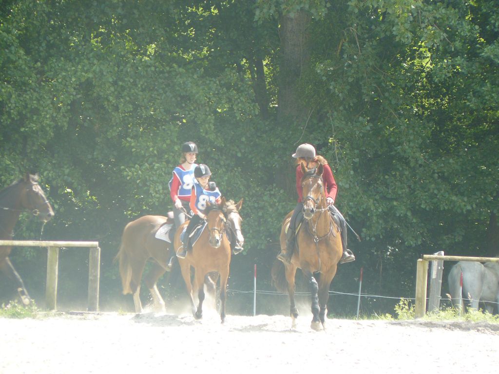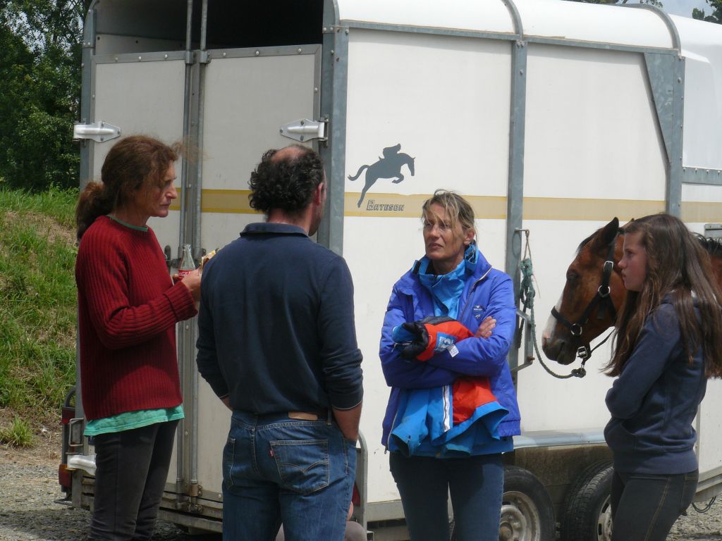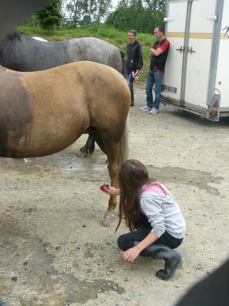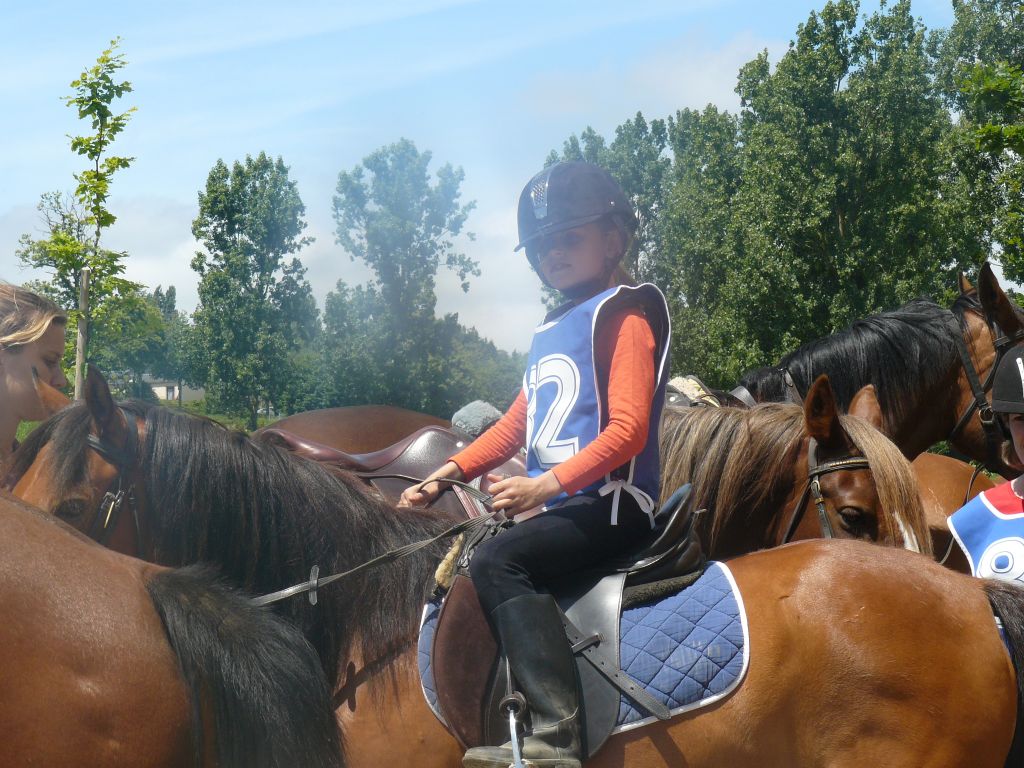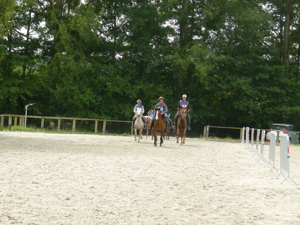 Autant d'aventures en si peu de temps, cela faisait bien longtemps ! l'organisation était chaude mais pourtant faisable; nous devions partir entre 9h30 et 10h sur la course pour que je puisse accompagner Hélo sur une deuxième boucle pour la première 40 de Féfé, sans oublier Thaïs ensuite sur la 10 kms. Après un petit caprice de Bob le camion, nous sommes partis en retard donc départ sur la course à 10h15, pas trop mal. Nous voilà à cheval avec nos tous jeunes cavaliers : Moranne avec Katia, Léo et Jet, Maeva et Léo, Hélo à mes côtés avec Féfé qui devient de plus en plus cool à l'embarquement. Beau début de course pourtant avec une bonne avance de prise, mais premier incident : Féfé se déferre à l'antérieur gauche; obligés bien sûr de faire attention aux cailloux ... le sort s'acharne sur nous puisque au beau milieu d'une galopade dans un champ de maïs, mon étrivière casse ! le temps de retrouver mon étrier, de réfléchir à une solution, le chrono lui ne nous attendait pas. Quelques kms plus tard, mon étrivière recassait... Marie-Christine finit par nous localiser avec une nouvelle étrivière après qu'hélo se soit débarrassée d'une partie de sa martingale en guise d'étrivière. A 10 kms, nous étions descendus à 9kms/h environ, il fallait remonter; heureusement, les terrains galopants nous ont aidés à rattraper une partie de notre retard, les jeunes cavaliers tenaient bon ! bref, la ligne d'arrivée fut franchie à 11,23 kms/h, 7 mn de retard seulement ! Côté cardio : Katia termine à 43, Léo 48, Jet 57, Mister 49, et Féfé était à 44. Nous étions 7 engagés, malheureusement 2 engagements terrain se sont rajoutés et ont évité la 2nde place à Moranne et Katia qui terminent 4ème sur 9, Maeva et léo 6ème, Mister 7ème, Léo et Jet 8ème. Bilan : garder son maréchal avec soi, prendre une étrivière de rechange, mais quel groupe solidaire !