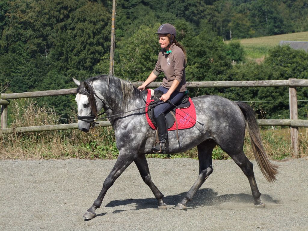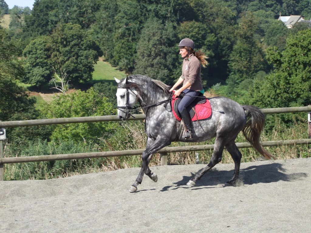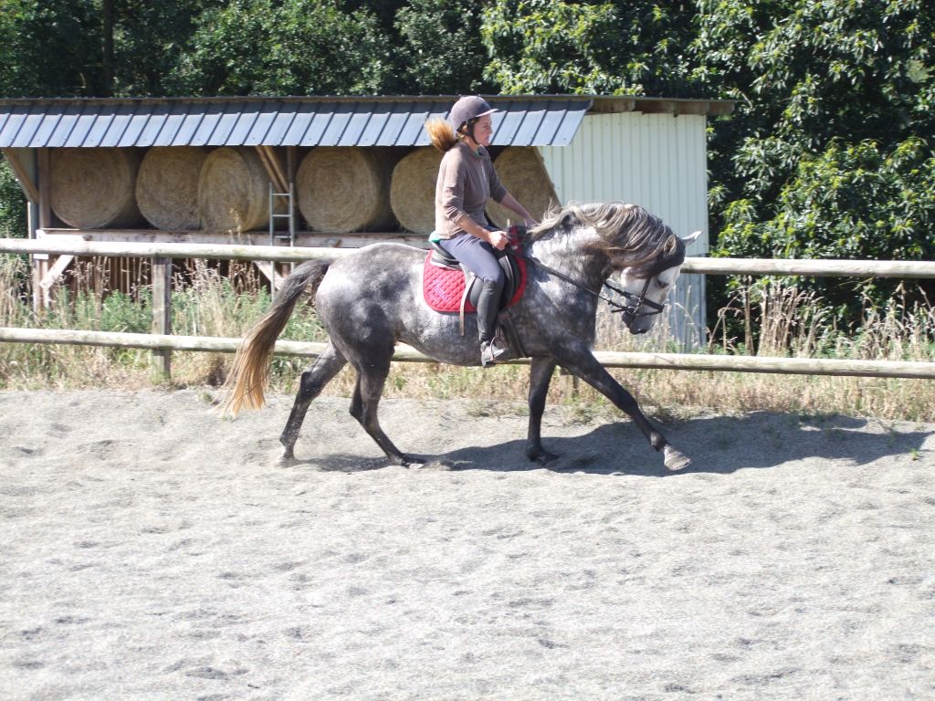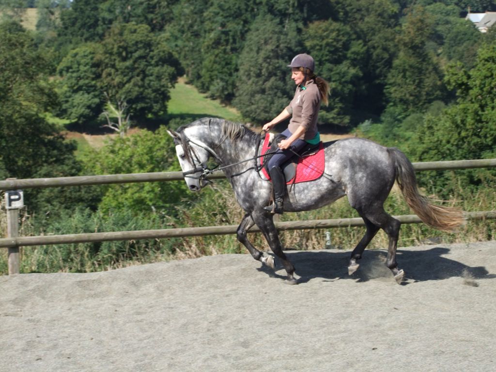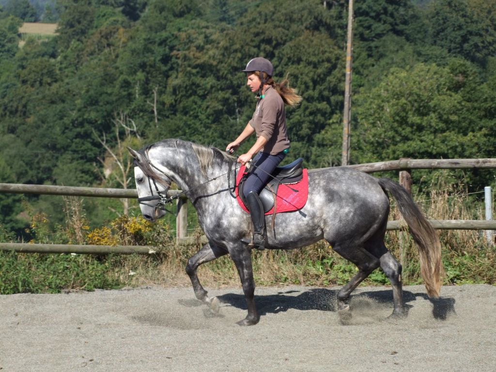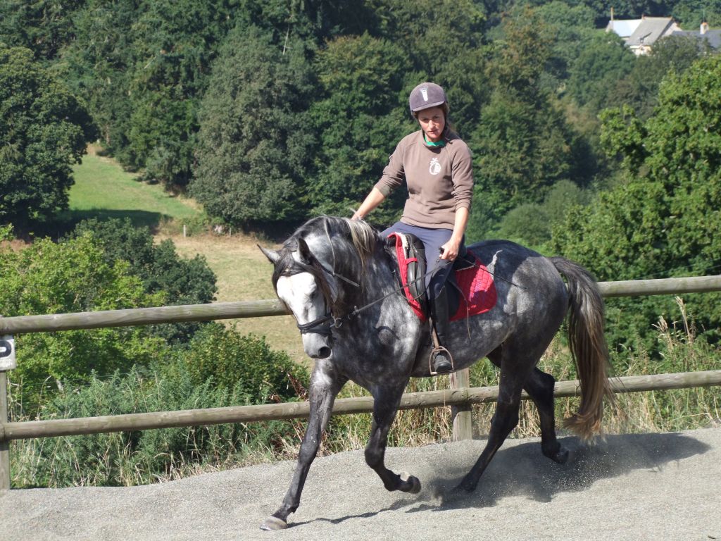 Sous le soleil de cette belle matinée, on voit donc nos deux complices en pleine reprise ! Termi nous a surpris : concentré, à l'écoute, très souvent en place (même un peu encapuchonné en fin de séance... dur la fin des vacances !). A peu près symétrique, il a conservé une incurvation correcte, une allure régulière, et un calme inhabituel ! Serait ce l'âge mûr ?
