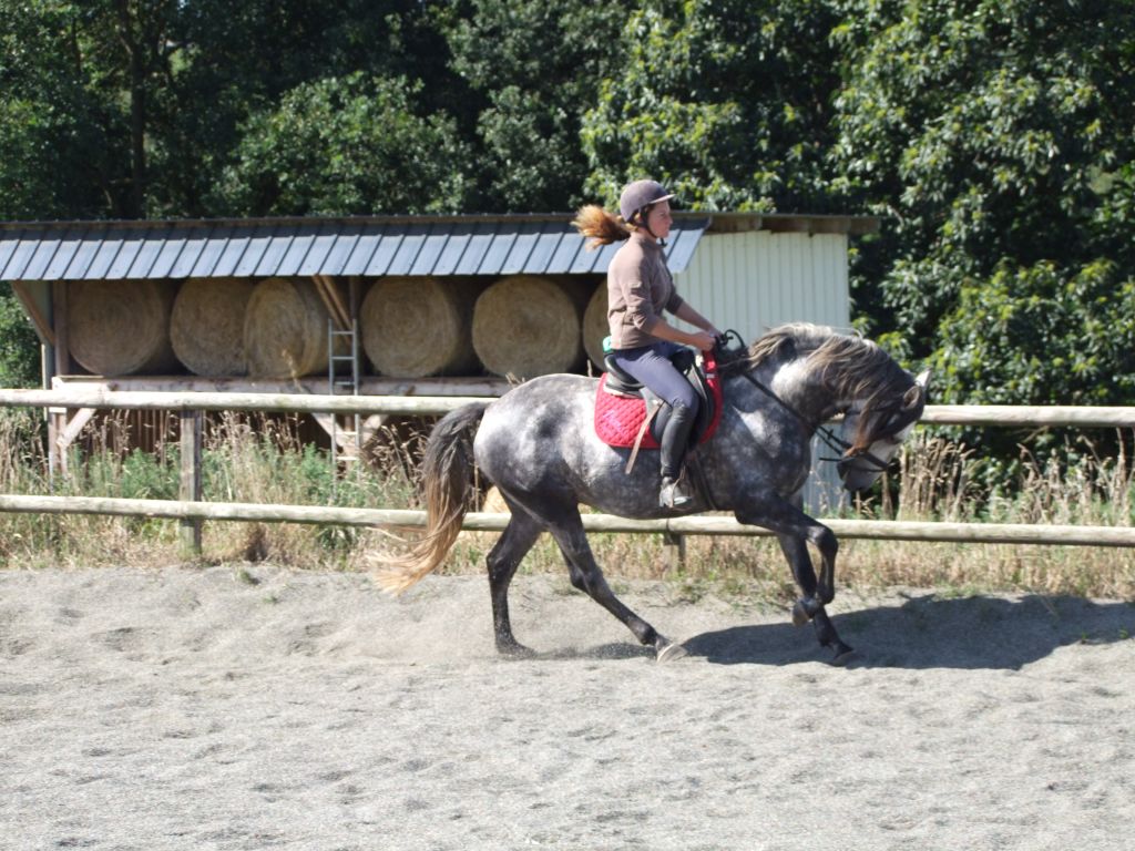C'est parti ! d'abord une petite longe. Au premier abord, on croit détecter une petite irrégularité du postérieur droit (?). Mais très vite, Termi montre une bonne volonté sur le cercle : petit trot régulier, incurvation correcte, amplitude moyenne, montée et descente dans les allures aux ordres... Pas mal !! Et en plus aux deux mains !