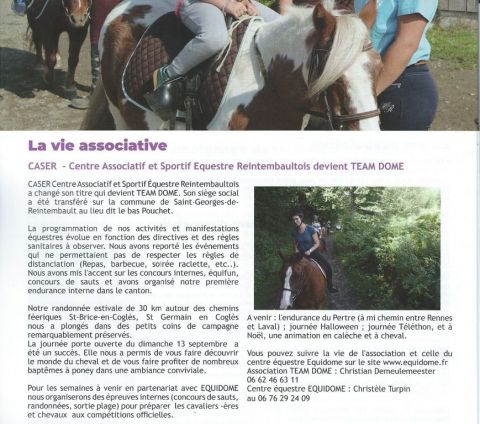 CASER Centre Associatif et Sportif Équestre Reintembaultois a changé son titre qui devient TEAM DOME. Son siège social a été transféré sur la commune de Saint-Georges-de-Reintembault au lieu dit le bas Pouchet.
