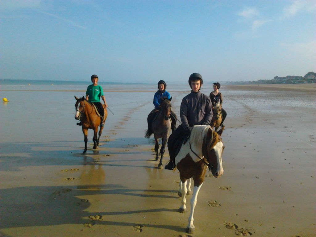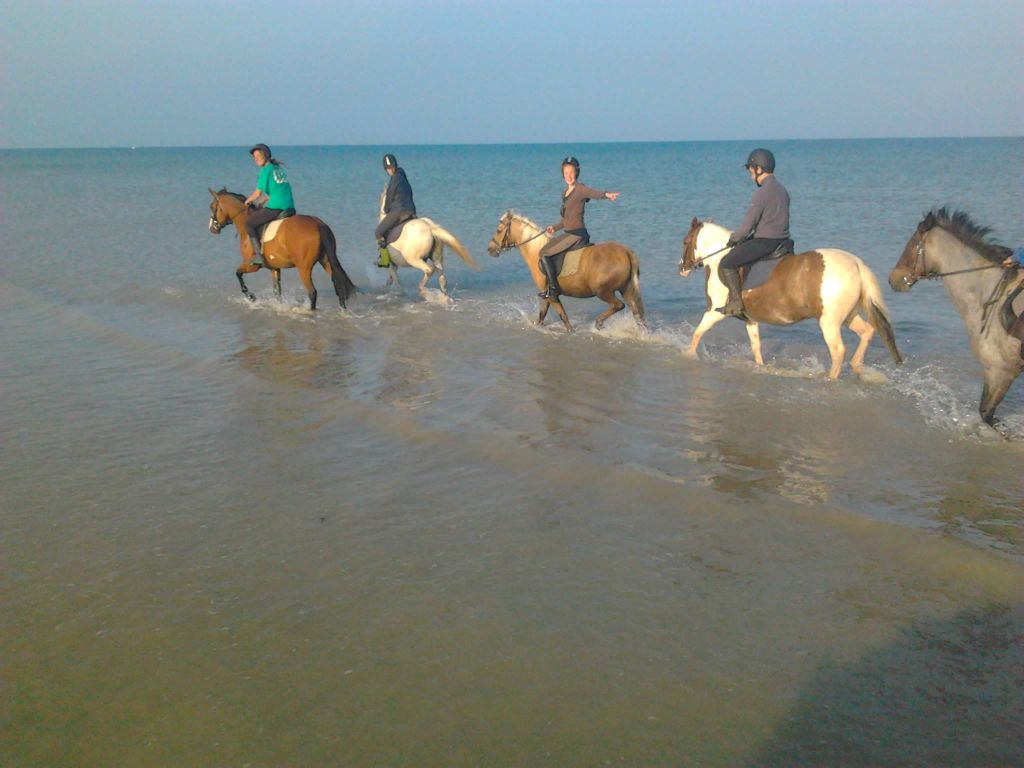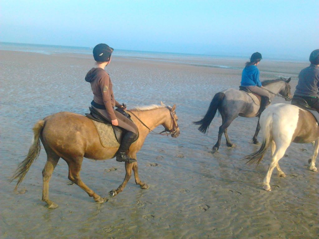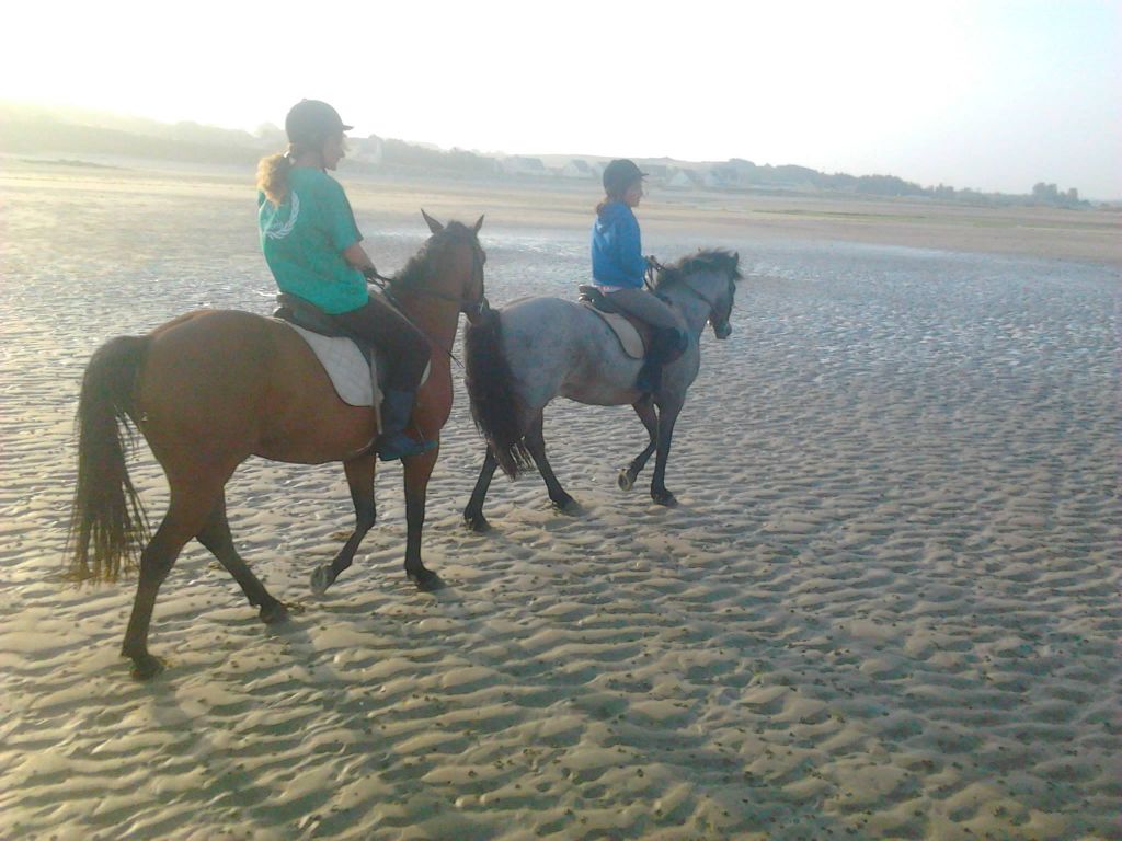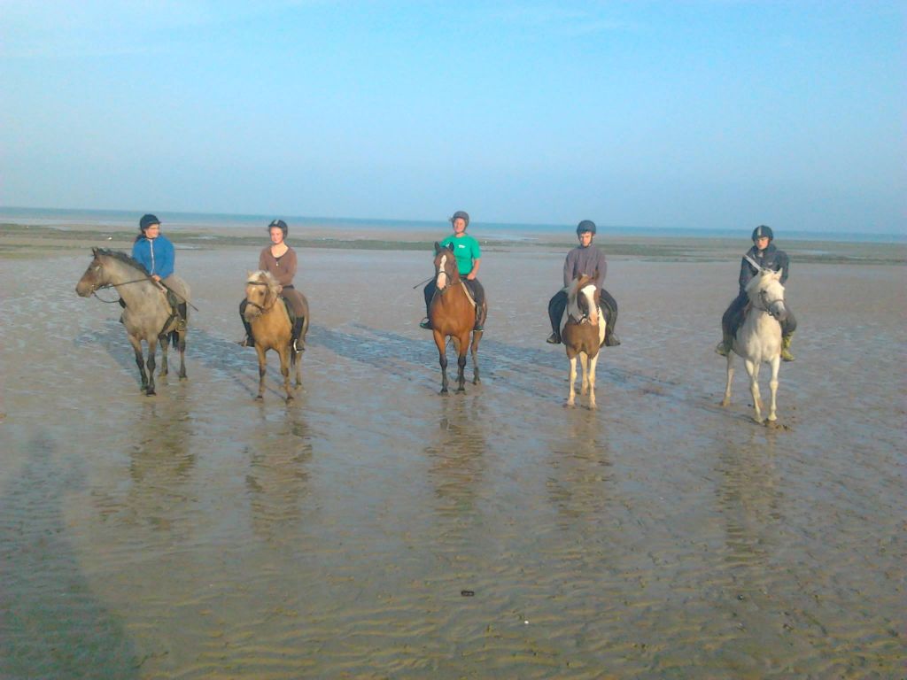 Allez, une petite photo de groupe et on rentre. Encore un petit galop à fond, un trotting les pieds dans l'eau (Sissi en mode Moïse ! ... mais faute de mer Rouge, ce sera la Manche. ) et on sort du sable avant le gong de 9h. Au final, tous quelque peu trempés, du boulot pour laver les poneys et le matériel, mais bien réveillés et le sourire jusqu'à là !