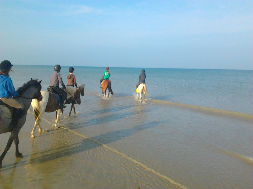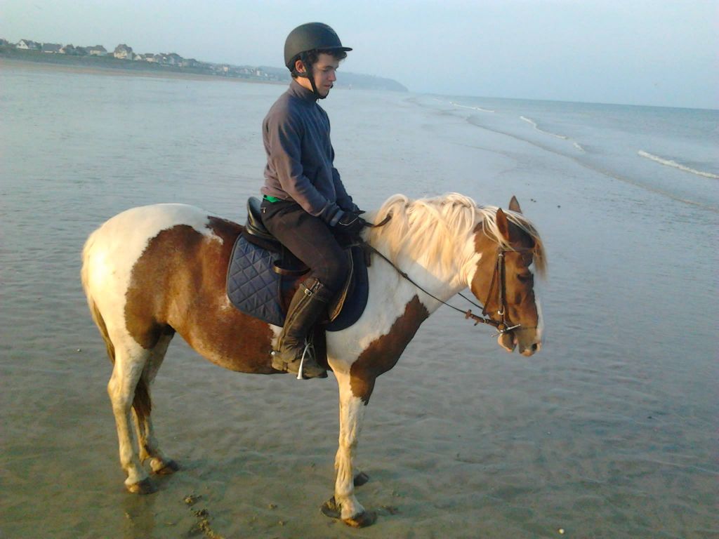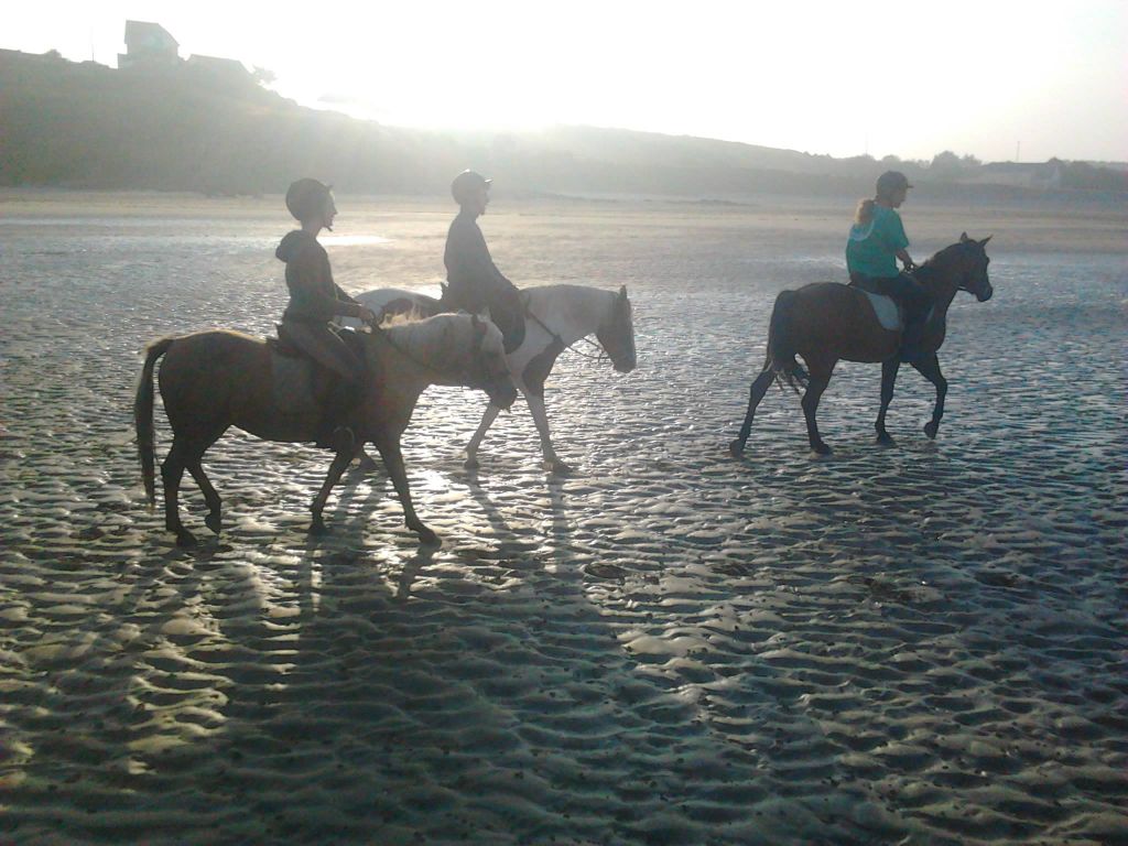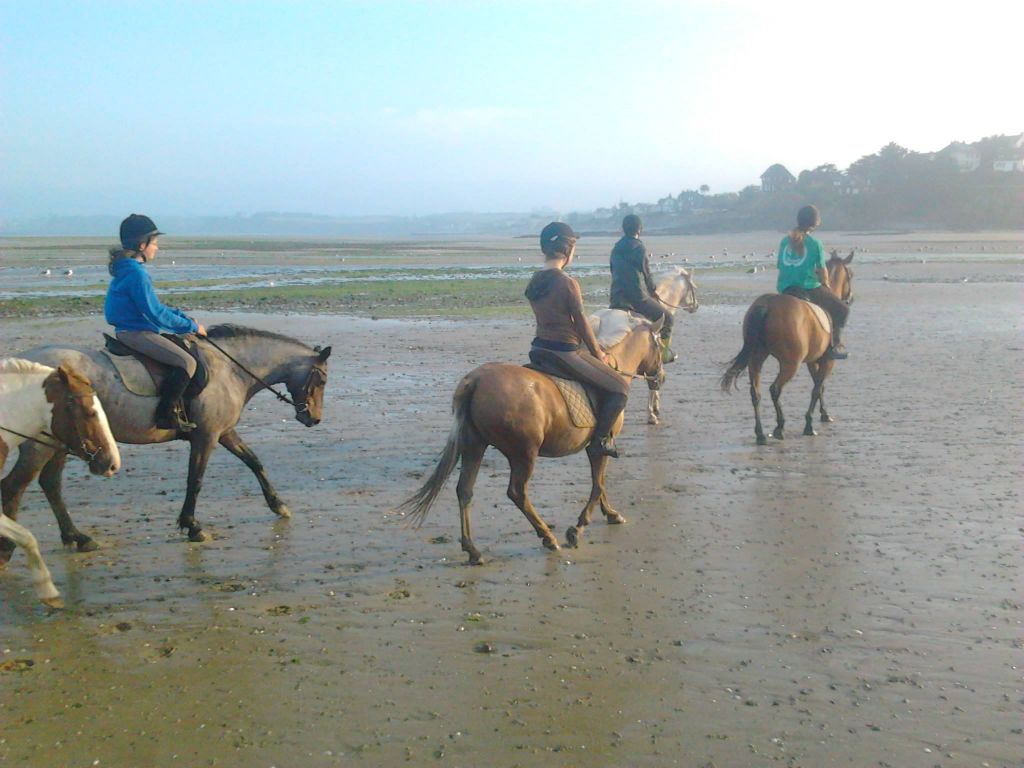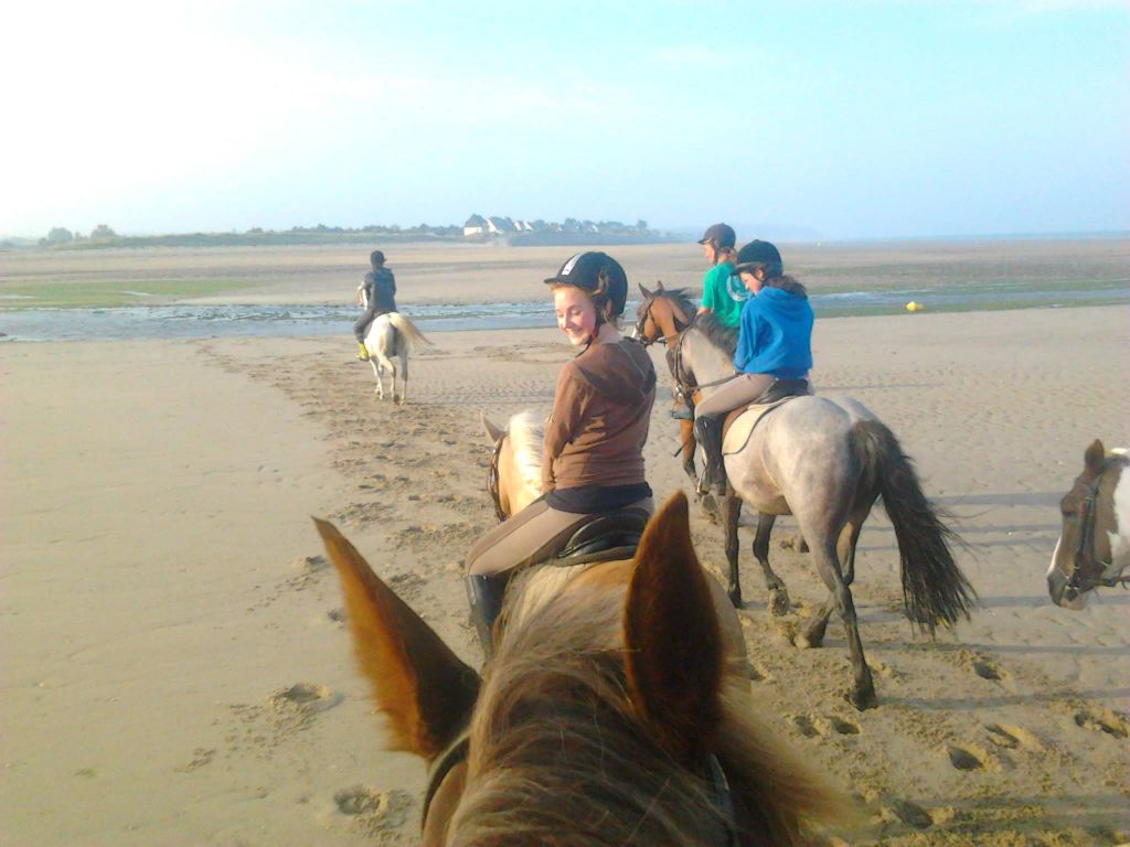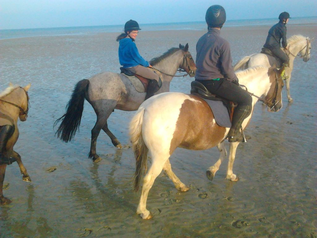 Allez, une petite photo de groupe et on rentre. Encore un petit galop à fond, un trotting les pieds dans l'eau (Sissi en mode Moïse ! ... mais faute de mer Rouge, ce sera la Manche. ) et on sort du sable avant le gong de 9h. Au final, tous quelque peu trempés, du boulot pour laver les poneys et le matériel, mais bien réveillés et le sourire jusqu'à là !