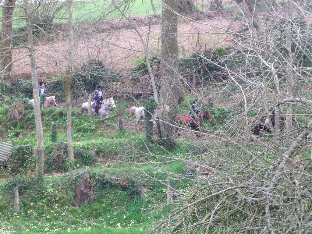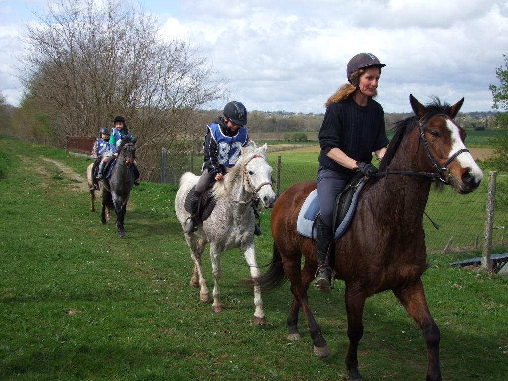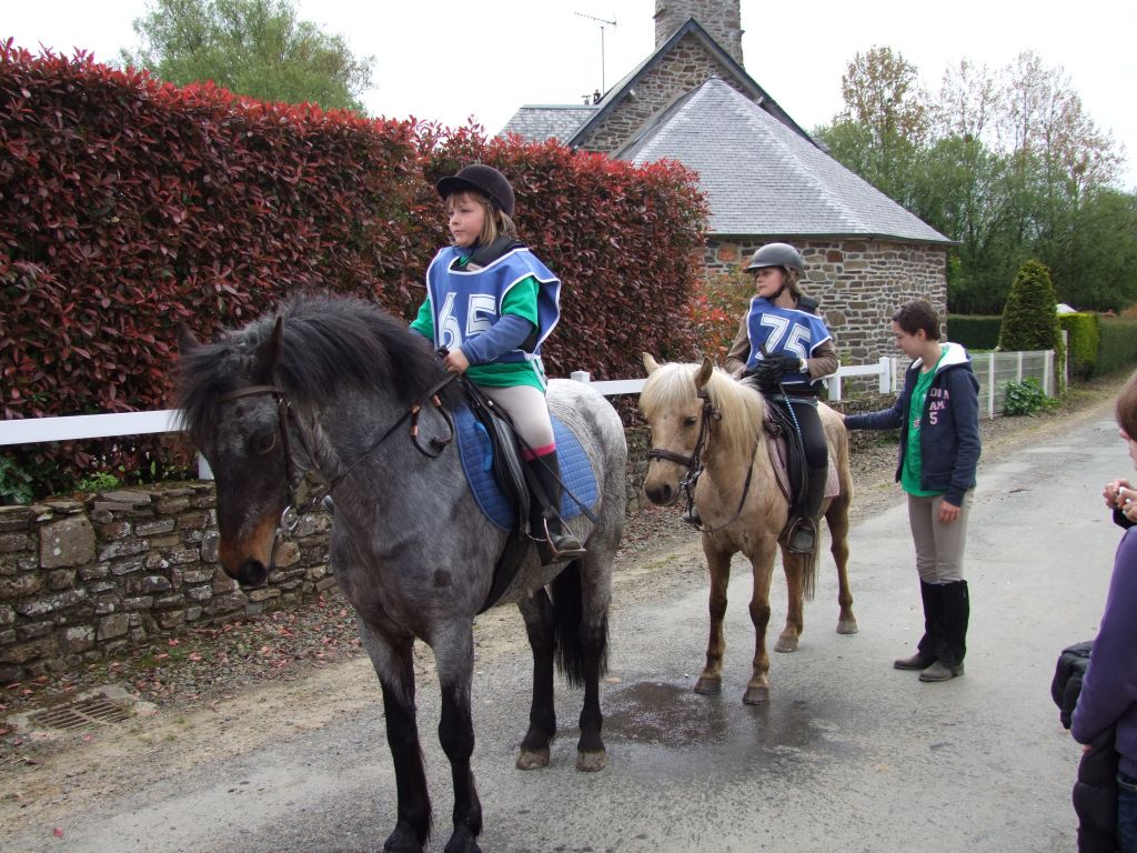 Grosse journée mais quel plaisir : un délicieux parcours s'offrait à nos yeux : un tour dans les pommiers d'abord, puis une succession de longs chemins creux qui n'étaient pas sans me rappeler mes galopades du lundi en tant qu'élève monitrice; bref, 7 années se sont passées depuis et me voilà avec mes grands et petits cavaliers. Le parcours était magnifique certes mais la sécurité a été testée à plusieurs reprises avec des passages dans beaucoup d'endroits ouverts: de grands champs où on était bien tenté de mettre le pied sur l'accélérateur. Départ un peu chaud avec mon groupe de 7, Pif pris d'un soudain élan de gaieté dans les pommiers commence à secouer activement Maëlenn qui heureusement a bien géré. Autre moment de solitude avec un balisage mal orienté qui nous envoie tous les 8 dans un immense champ de Ray grass et ses bou... de vaches. Cavaliers dans l'ensemble très attentifs, quelques petites difficultés avec les distances de sécurité mais tous bien en selle avec des chevaux et poneys connaissant leur travail. Vitesse moyenne : 11.25.