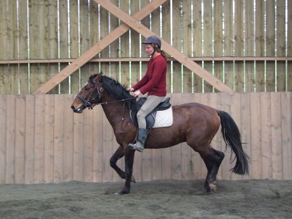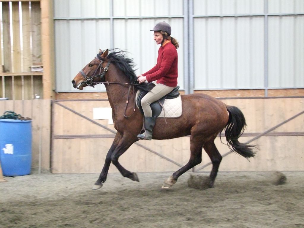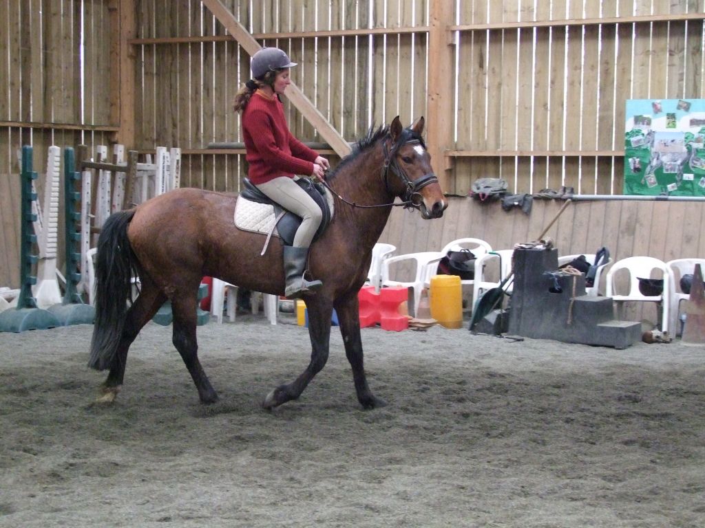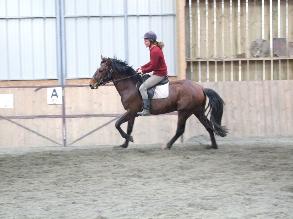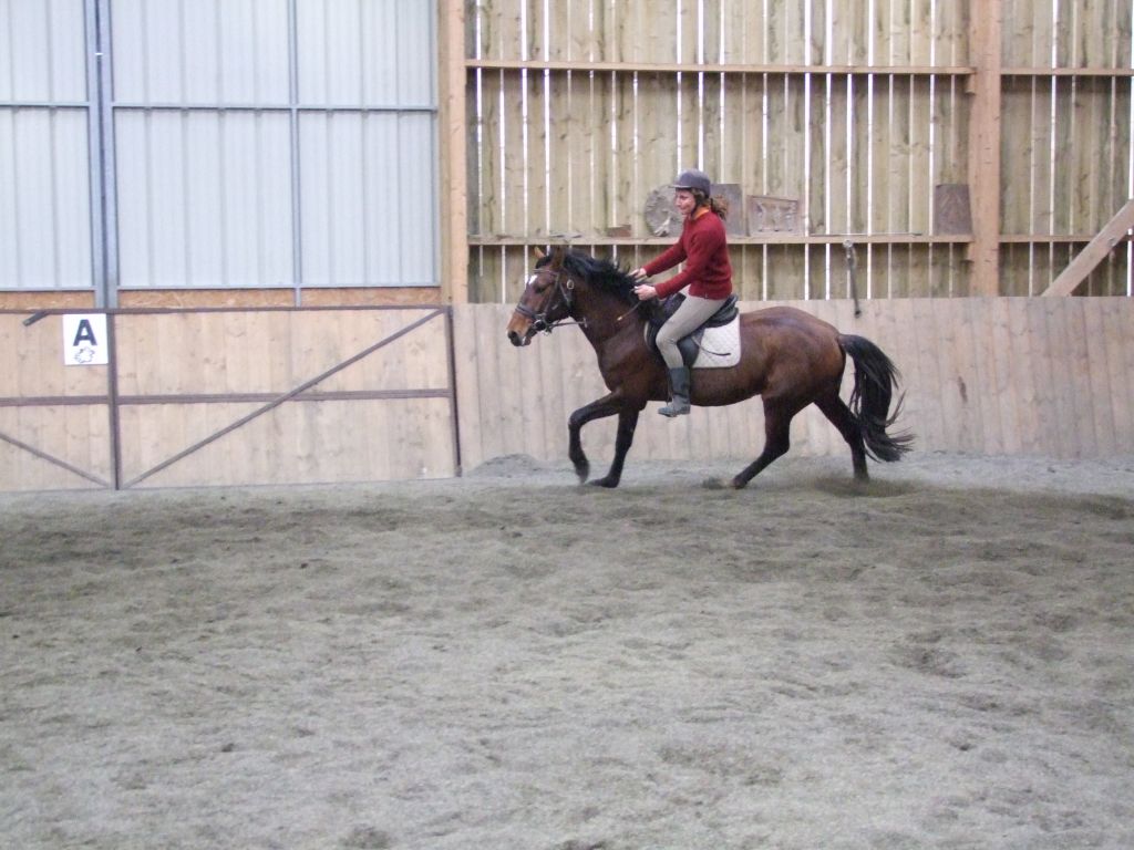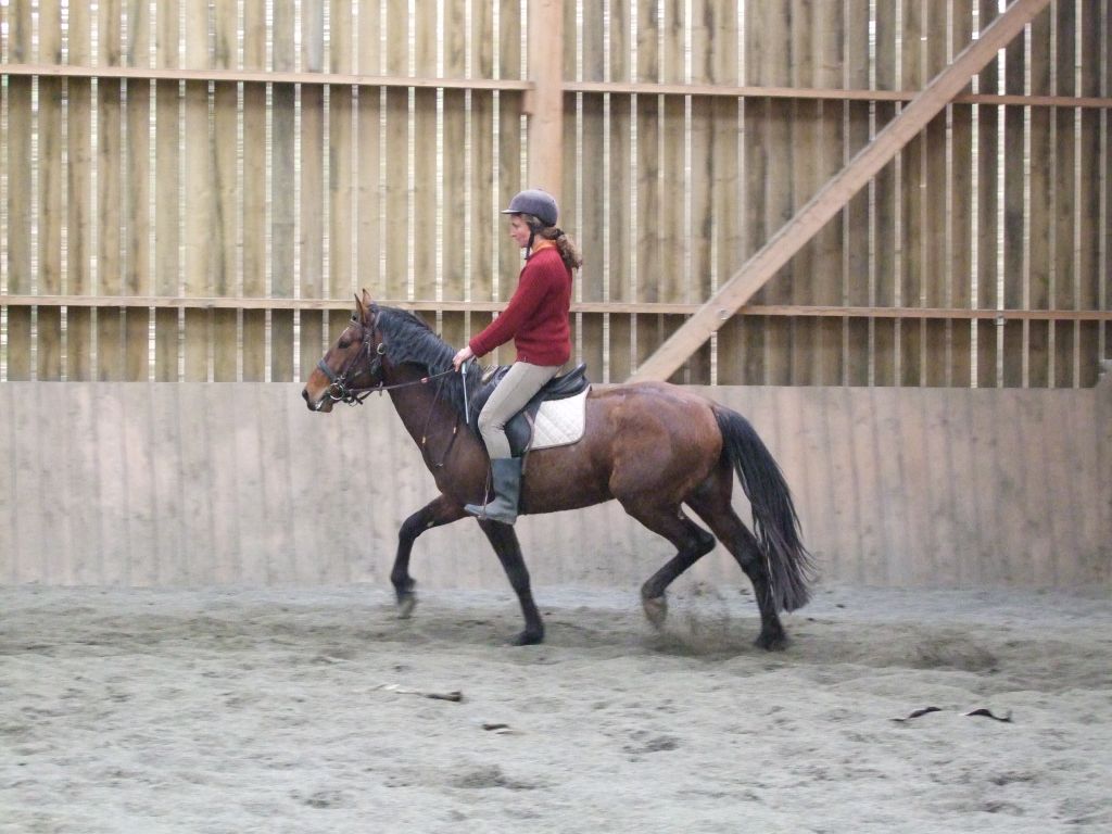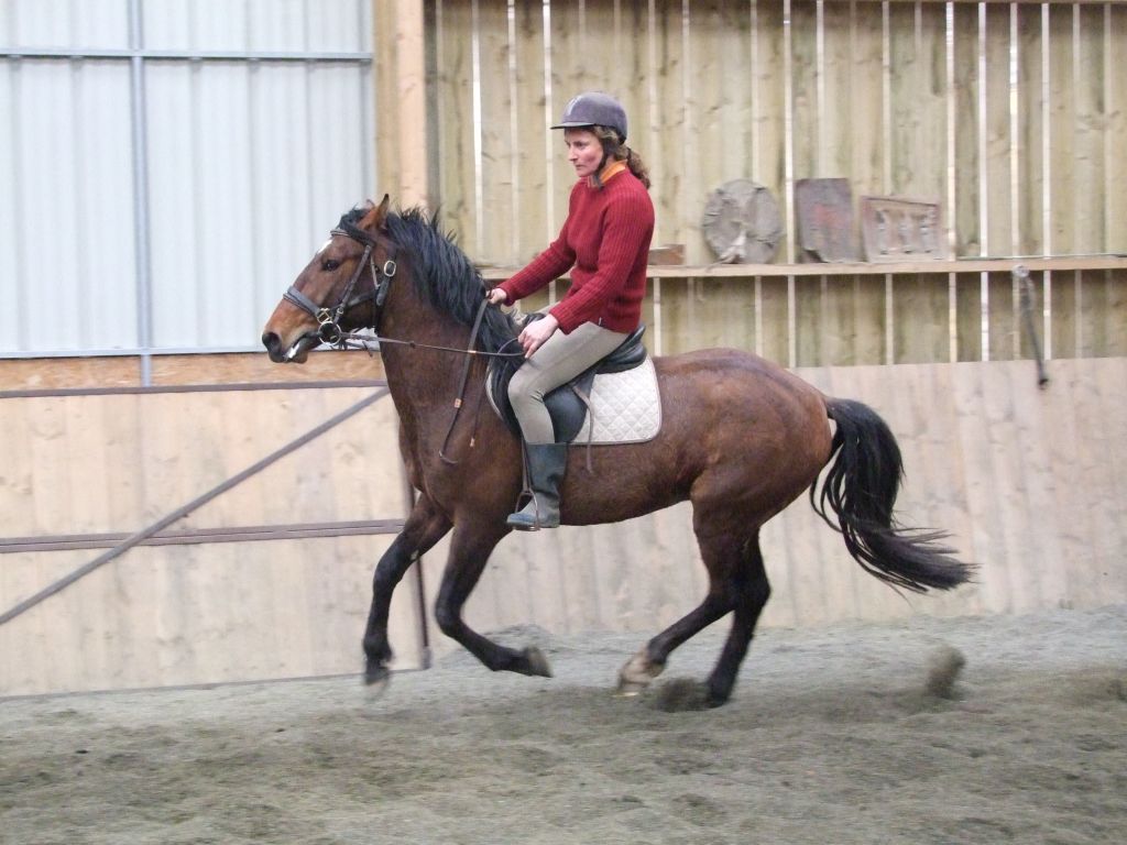 Oui Mélanie, pour la deuxième séance montée, on peut dire qu'il a compris les bases. Très réactif à la jambe, des difficultés à s'arrêter comme Maman mais il se dirige à présent très bien avec beaucoup d'activité. C'est un petit cheval chaud mais pour l'instant il reste délicat en bouche. Il est très appliqué au travail et concentré malgré le fait qu'il soit entier ! Avec du travail, il va devenir intéressant, il me rappelle Mister avec une bouche plus moëlleuse.