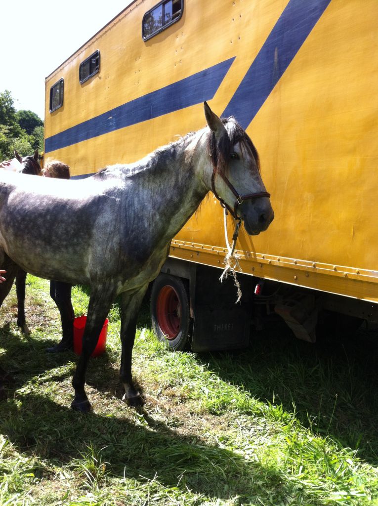Course terminé, prêts à embarquer tout ce petit monde. On commence gentiment en attendant Olivier. Puis c'est le tour de Féfé ! Jument calme, tout se présente bien. Au bout de 30 mn, elle se décide. Au moment de sauter sur le pont, elle se décale bien à droite, perd l'équilibre et tombe brutalement. Un rapide coup d'oeil nous permet de voir une blessure à l'antérieur droit. Pas de chance, sur une veine donc pas mal de sang mais que des lésions cutanées. On court chercher un véto ( c'est pratique en endurance, ils sont sur place ), une rapide analyse de sa part confirme la non gravité de la plaie. Quelques points de suture et voilà Féfé repartie à peine boiteuse. Un grand merci à M Fouqué pour son travail sur la jument car à l'heure actuelle, la plaie est en bonne voie de cicatrisation sans gonflement.