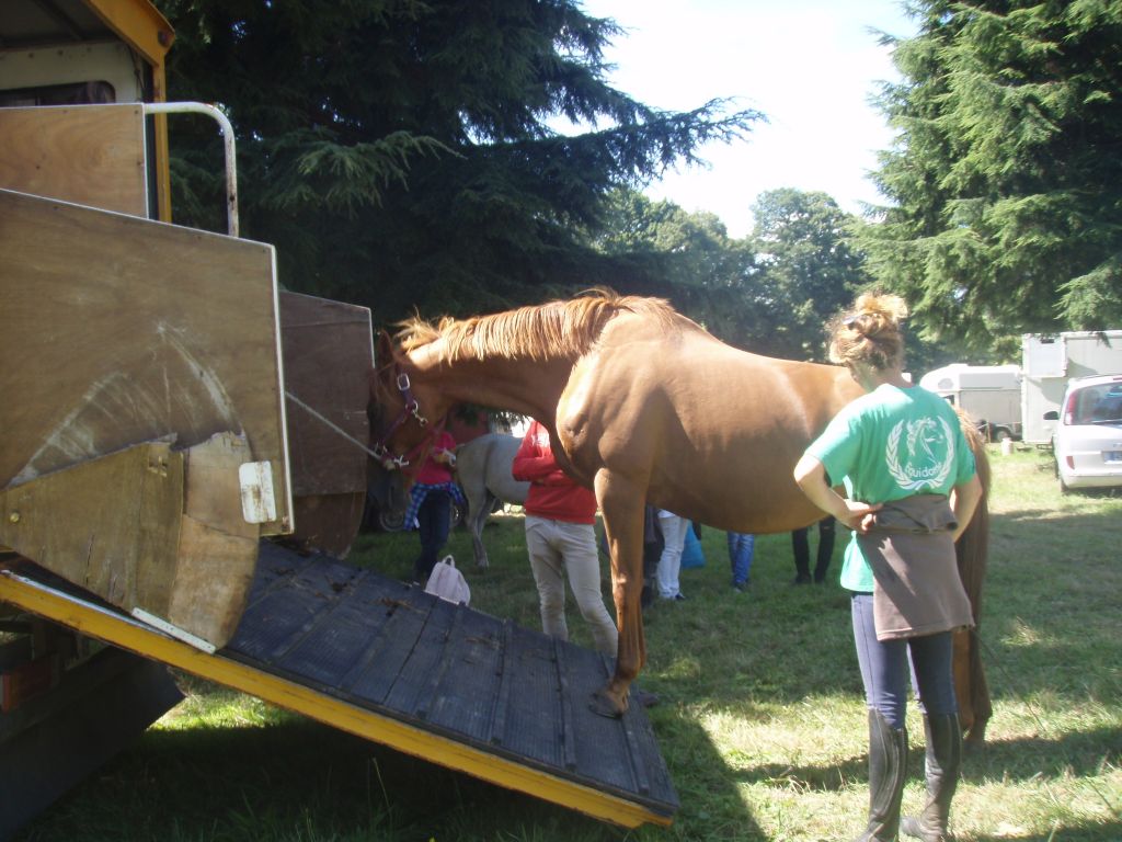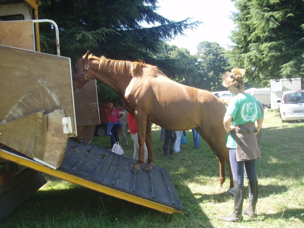 On profite de l'anesthésie pour réembarquer Féfé dans le van de Christian cette fois car Mademoiselle somnolait encore. Retravail dans le calme avec une vraie bonne équipe ( Hélo, Olivier, Elise, Christian et moi-même ), merci à tous pour être restés patients. 30 mn s'écoulent et puis Olivier réussit après une bonne stimulation des boulets ( c'est son point faible, elle ne supporte pas qu'on la chatouille et la sensation désagréable la fait avancer sur le pont sans énervement ) à embarquer la demoiselle, on rassure car bien inquiète de se retrouver enfermée et puis direction la maison pour rejoindre une vraie bonne nounou ( Athéna ). Remise au champ des chevaux et poneys, rangement du matériel et rapide retour sur Fougères pour la remise des prix, même pas en retard !