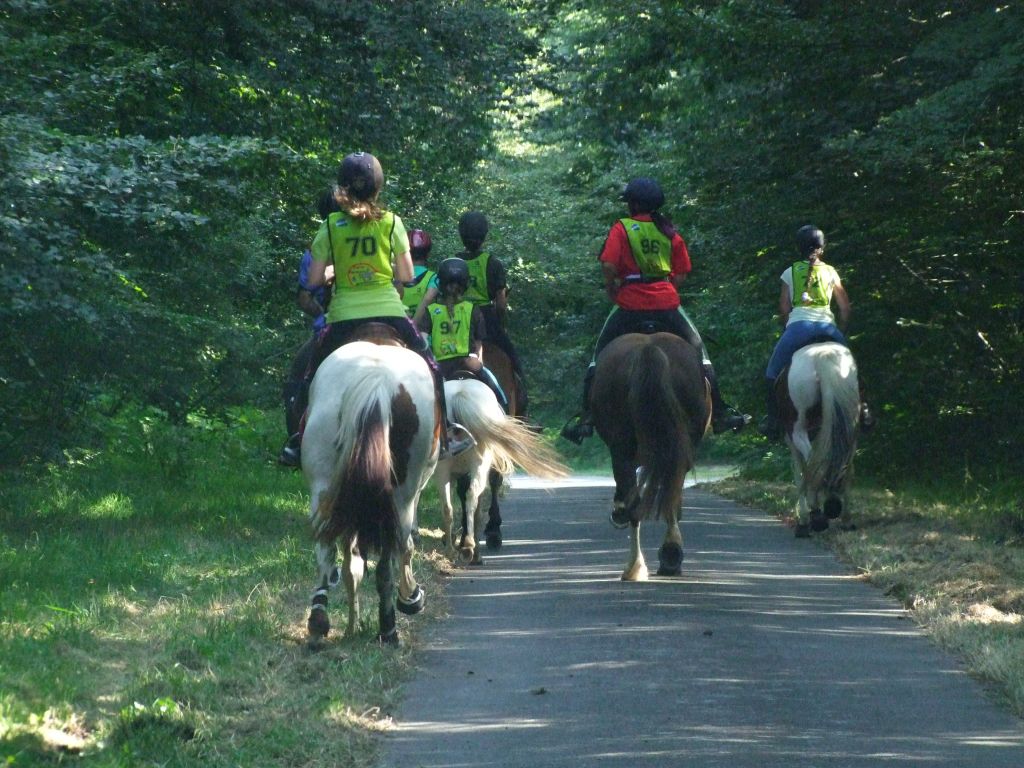 Une très belle course avec des sentiers verdoyants mais avec quelques difficultés que nous avons heureusement surmontées. Première difficulté : les grandes allées là où d'habitude je n'hésite pas à galoper pour gagner du temps me semblaient trop justes pour Célestin d'autant plus que la ponette toussait un peu en début de course donc j'ai choisi le trot actif avec quelques foulées de galop en fin d'allées. Nous étions en 11 kms/h à ce moment-là. La seconde difficulté était celle des gués : n'oublions pas, le site s'appelle le gué au merle ! Je savais que certains poneys comme Katia étaient capables de sauter fort et il fallait éviter la chute ... J'ai fait descendre Célestin et Léna pour la sécurité, Katia a effectivement fait un gros saut sur le premier gué car à ma grande surprise, il restait encore 2 gués à franchir, avec Prune et Sissi bien décidées à prendre leur temps !! Au franchissement du 3ème gué, nous étions complètement à la ramasse par rapport au timing, 5 mn de retard donc environ à 9 kms/h ( nous devions arriver en 10/12 ). Là obligée de passer la seconde. Heureusement, la petite poignée magique que Célestin avait sur sa selle, l'a bien aidé. La ponette était top, les autres cavaliers aussi ! 3ème difficulté : petite chute de Léna qui perd l'équilibre dans une descente ! petite cavalière discrète mais avec un fort caractère heureusement. Elle remonte rapidement sans même broncher.