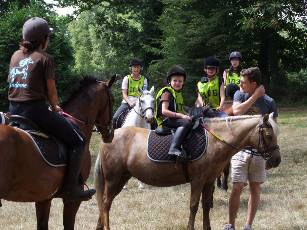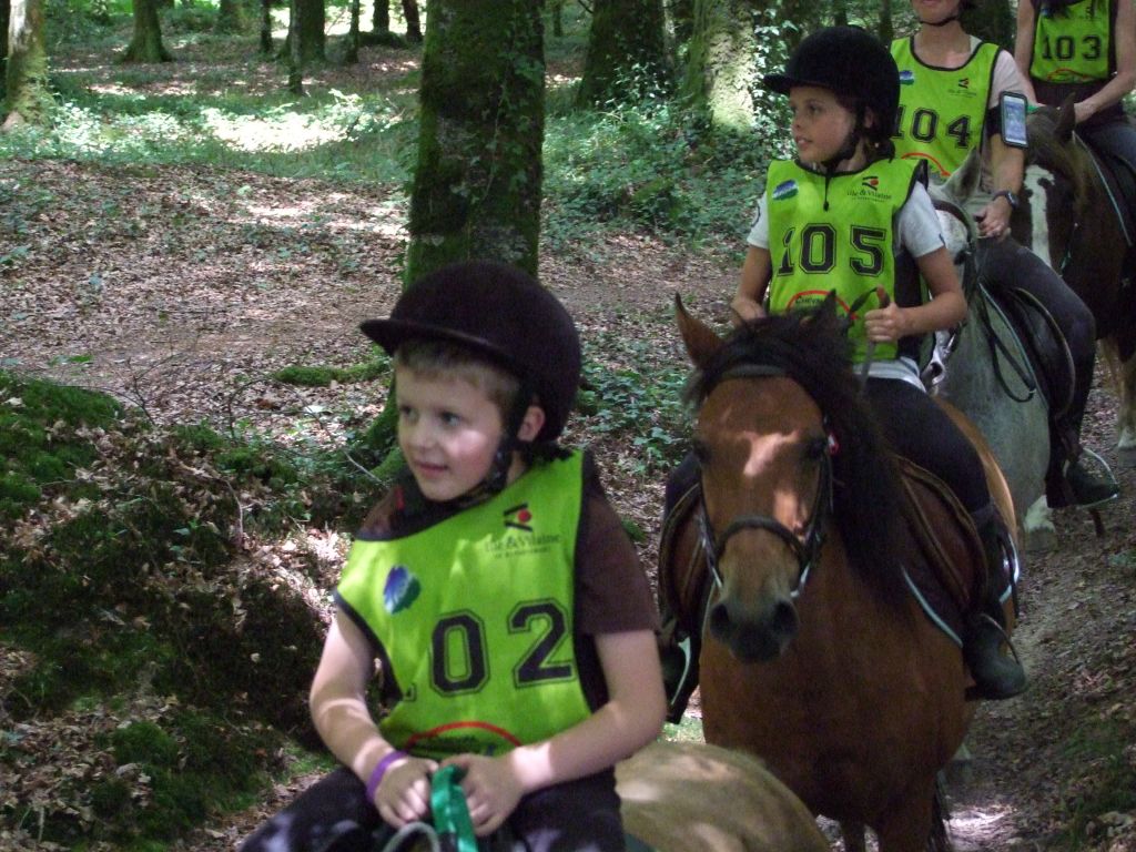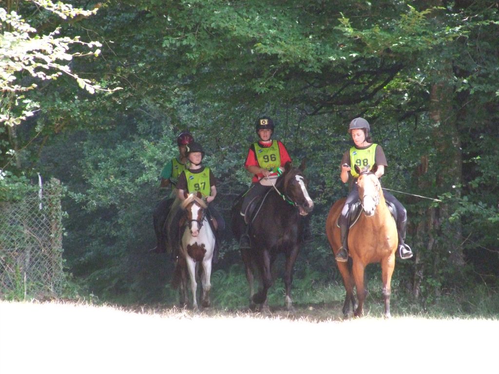 Passons à la deuxième équipe : Un adorable cocktail d'adultes et de très jeunes cavaliers : Léna 8 ans et Maman ( Laëtitia ) au rendez-vous, Léna avec Loustic et Maman avec Prune, Moranne 9 ans ( qui voulait participer avec Laurence ) avec Tornado, Laurence ( qui voulait participer avec Célestin ) avec Sissi et Célestin avec Maman ( moi-même pour les lecteurs qui ne connaissent pas la famille ); Célestin 6 ans montait Katia, la ponette de référence pour les poids plumes et les très jeunes cavaliers. Côté adultes, on s'abstiendra pour les âges.
