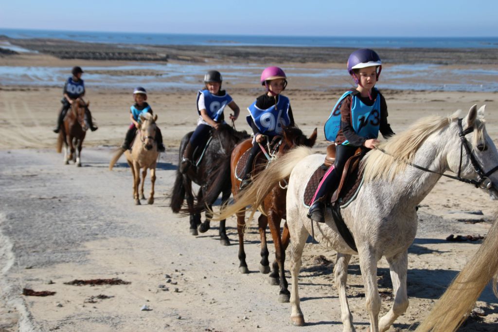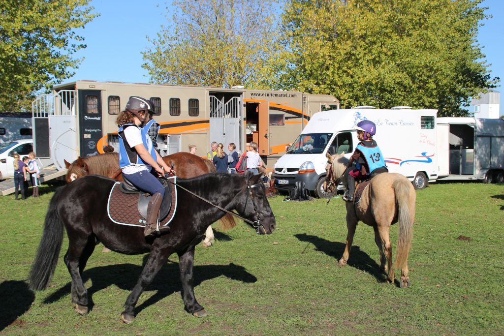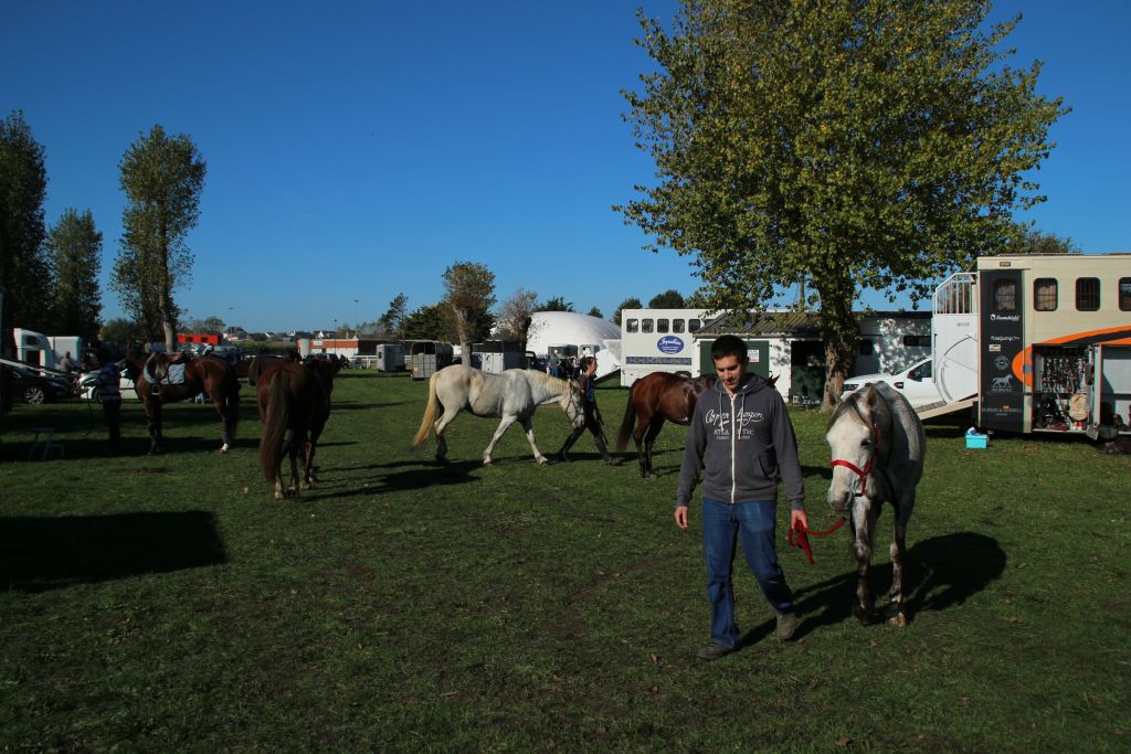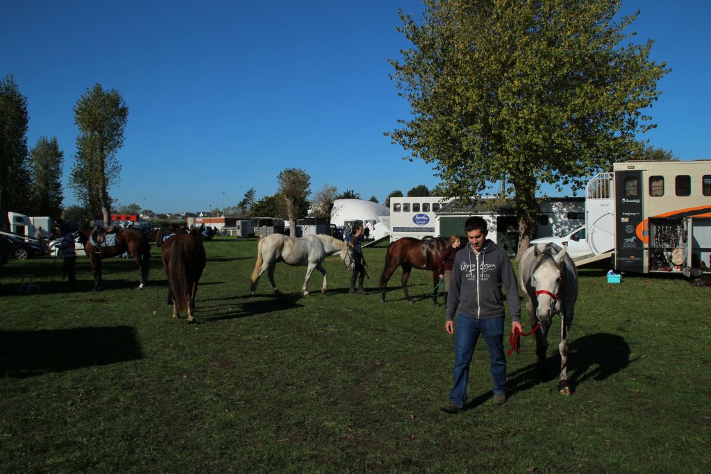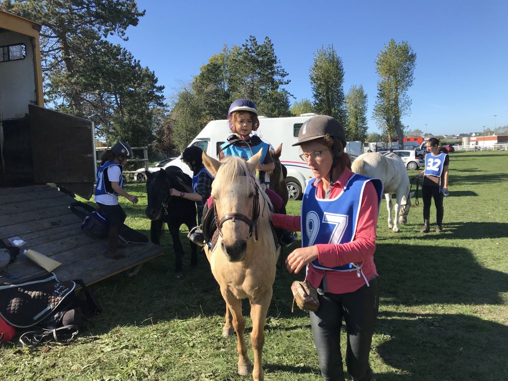 Une fois tout le monde chargé, c'est parti pour environ 2h de route, nous voilà sur l’hipprodome d’agon-coutainville avec un soleil splendide, on descend les poneys et c’est parti pour le marathon (la marée n’attend pas, et Christelle avait 3 tours à accompagner dans la journée). Tout le monde s’active, préparation des montures pour certaines, gestion des engagements/dossards/cartes pour les autres.