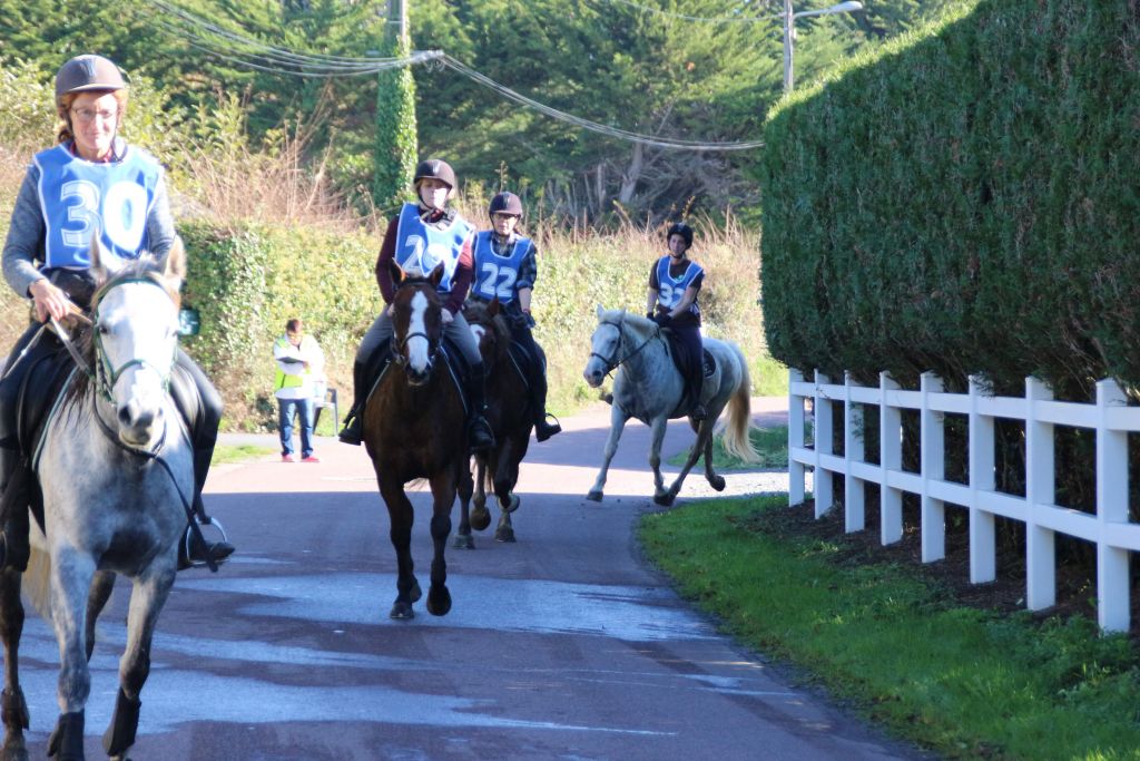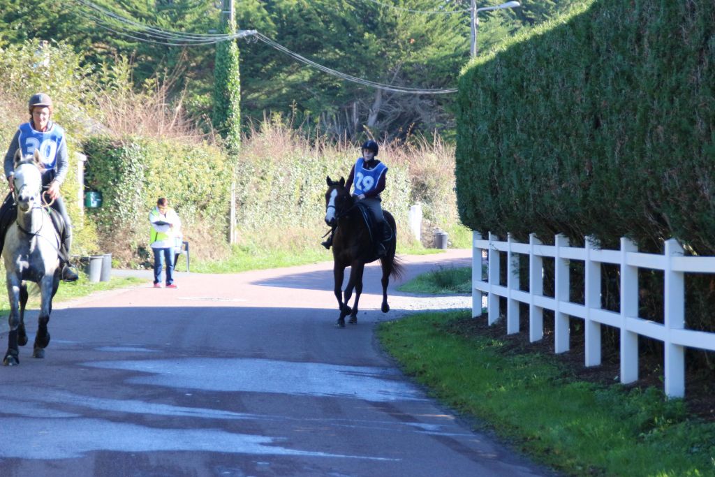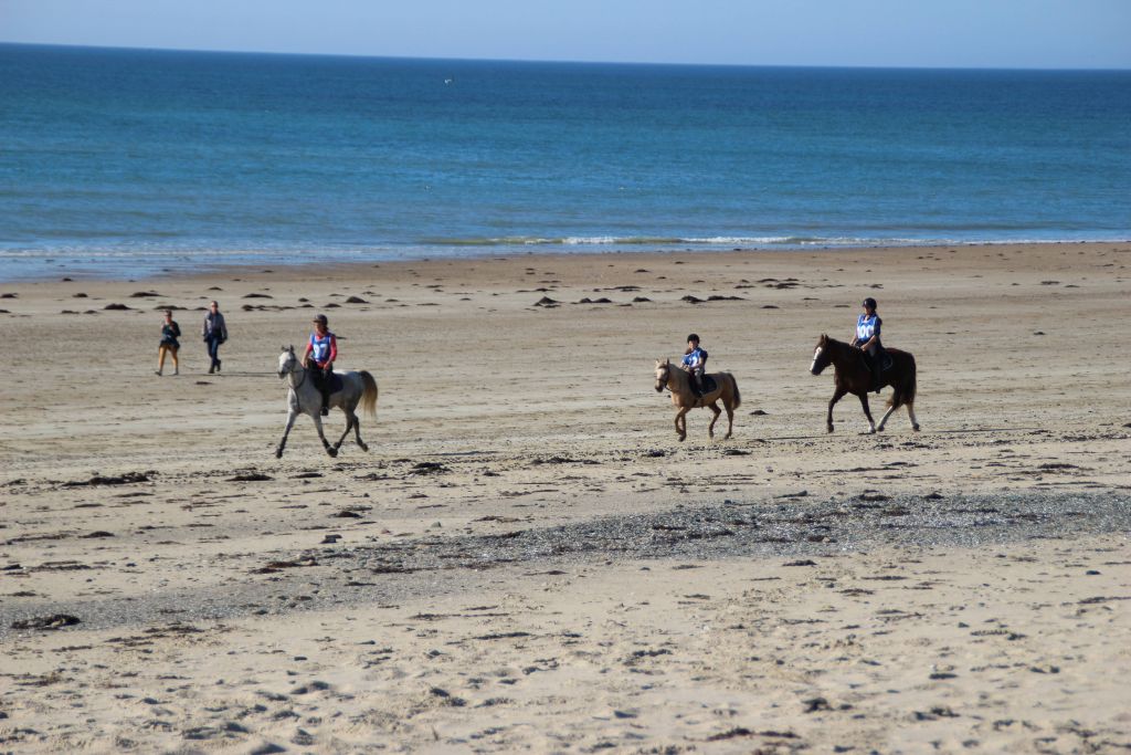 1er contrôle veto passé sans encombre, 11h on se lance sur la 20km rapide Christèle avec Charifa, Mélanie avec Mister, Lolo avec Sissi et Moi sur Pif, un petit passage dans le « bourg » sous les regards des personnes venues en nombre voir toutes les épreuves. On attaque la plage, pour malheureusement une distance assez faible (ça sera le seul regret de la journée pour ma part), on empreinte la bonne sortie grâce à des pécheurs à pieds (merci à eux pcq le balisage manquait vraiment à cet endroit)), on attaque ensuite une phase pas très agréable en bord de route « protégées » par quelques barrières avec de nombreux véhicules roulant vite, quelques frayeurs sur le dos d’un super Pif mais c’est passé. Ensuite, que du bonheur, chemin dans les dunes, les sous-bois, les champs, du galop du galop et encore du galop…Une petite biche a même croisée notre route. L’assistance présente à chaque point de ravitaillement pour rafraichir nos chevaux (et oui on avait chaud pour un mois d’octobre), une belle équipe, une belle gestion du temps, on franchit la ligne d’arrivée pile dans les temps (14.947km/h) en se permettant le luxe de marcher au pas un peu pendant le dernier km.