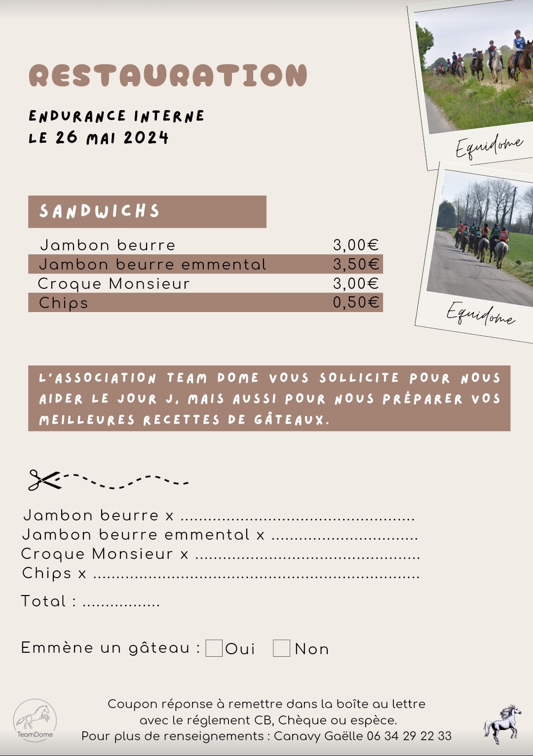 TeamDome vous informe qu'il y aura une restauration sur place et vous invite fort à réserver dès à présent vos menus pour ce dimanche (le bon est joint au message). Même si vous ne participez pas, nous vous invitons à passer encourager les cavaliers de tous âges dans cette discipline passionnante qu'est l'endurance équestre.