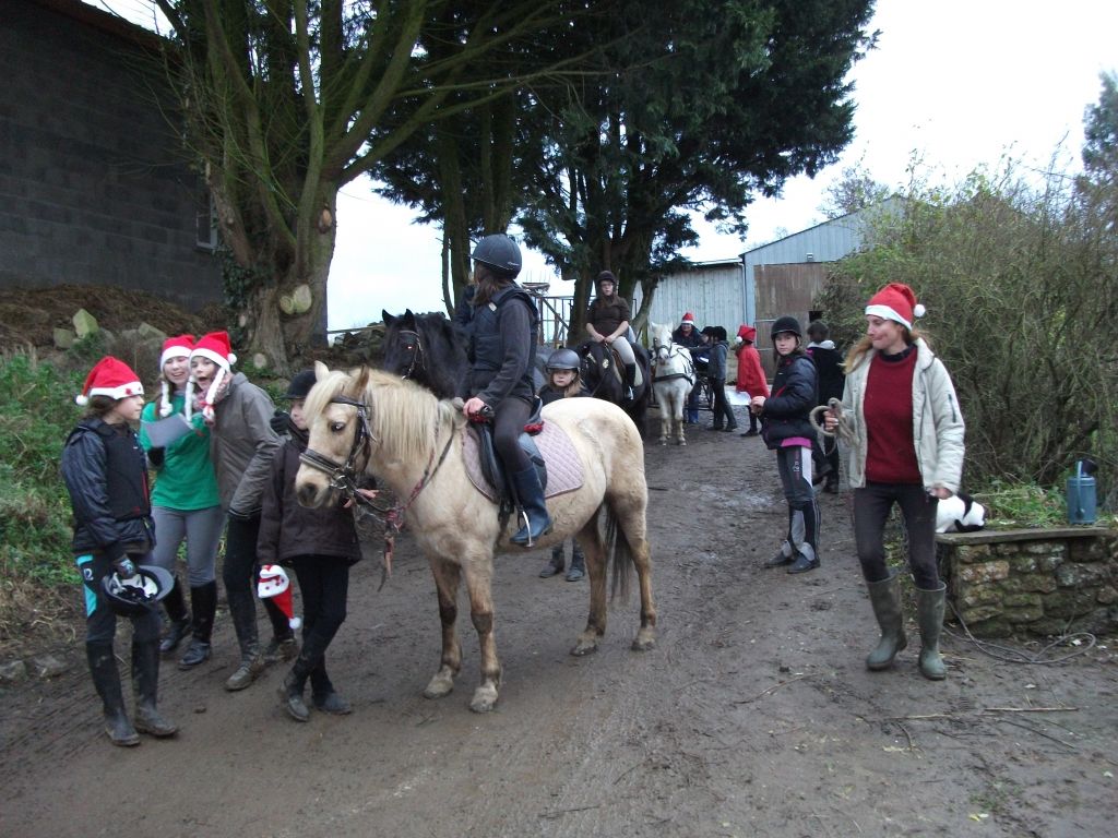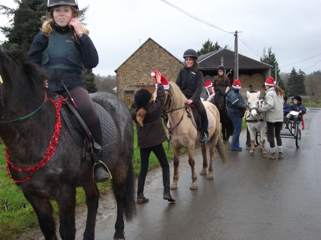 Dimanche 22 décembre, nous sommes partis faire une balade de Noël en compagnie de cavaliers du club, de cavaliers de la section sportive et d'encadrants ( Nono, Violette, Maxime, Anne, Frédérique...) que je remercie vivement. Bien sûr, quelques poneys participaient à cette balade : Jet, Katia, Loustic et Junior en calèche. Bravo aux décorations mises en valeur par chacun.  Jet avait une superbe guirlande en forme de collier sur le poitrail ! Juju était très classe avec sa crinière tressée et ses décos.