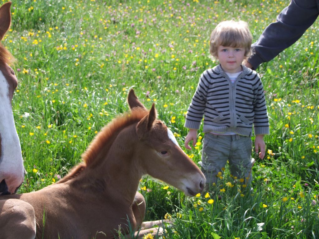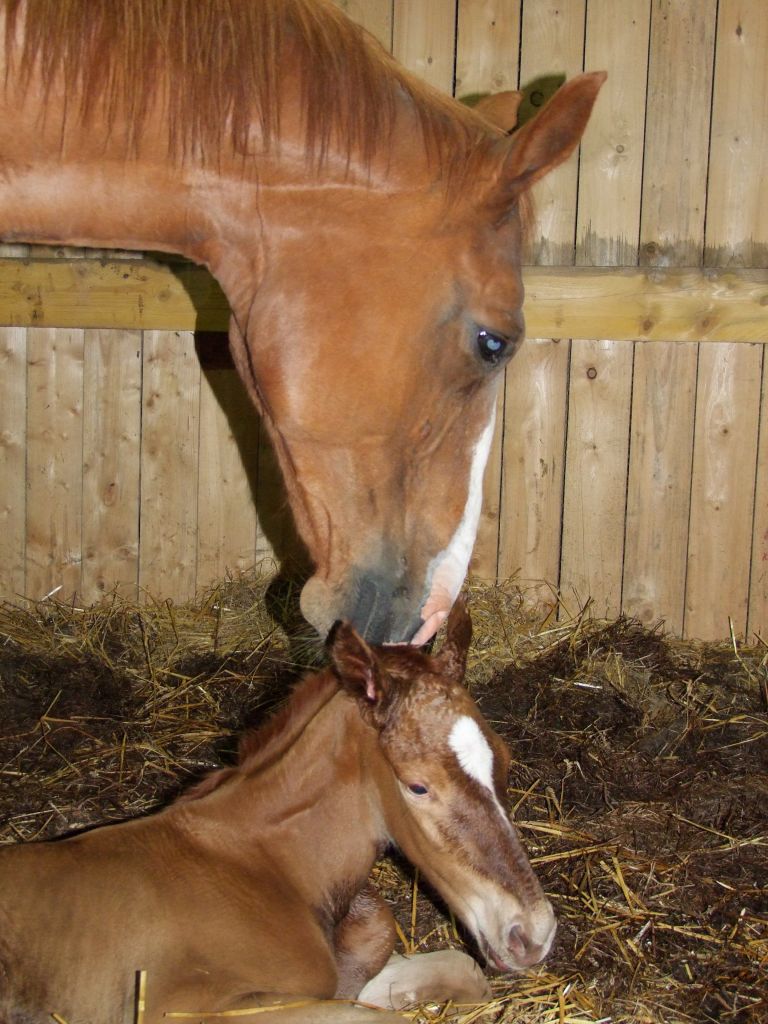 Une heure plus tard, la petite était debout. Et une heure plus tard encore, on s'acharnait sur les tétons de Lola pour faire boire Mademoiselle. Bref, un poulinage de rêve, une jument autrefois si puissante sur les barres transformée en une maman toute attentionnée et délicate. Chaque déplacement autour de sa pouliche était précieusement calculé. Beaucoup de sensibilité dans un si gros corps...