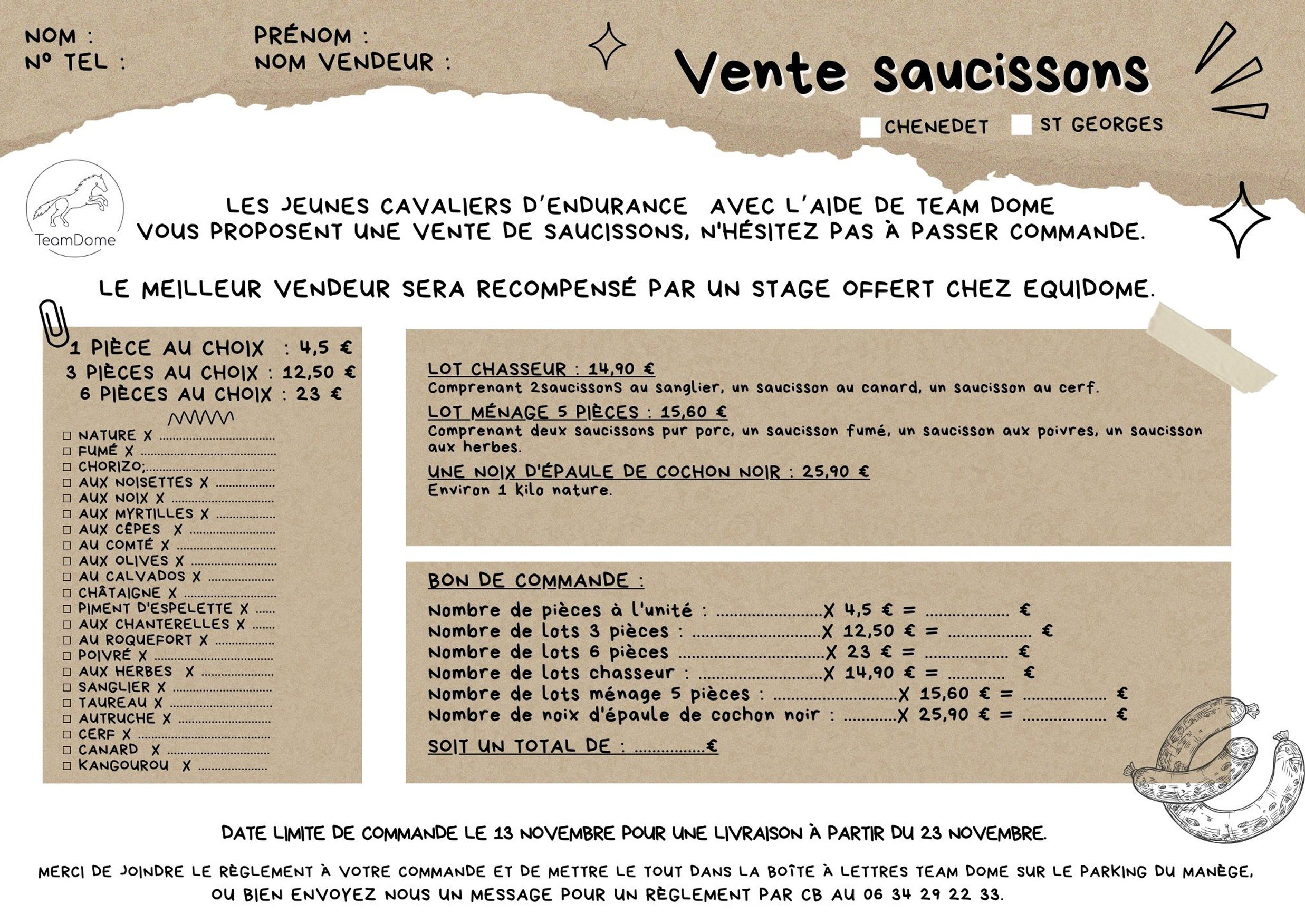 Votre association Team Dome vous propose une vente de saucissons sur vos 2 sites equidome : St Georges de Reintembault et Chênedet.