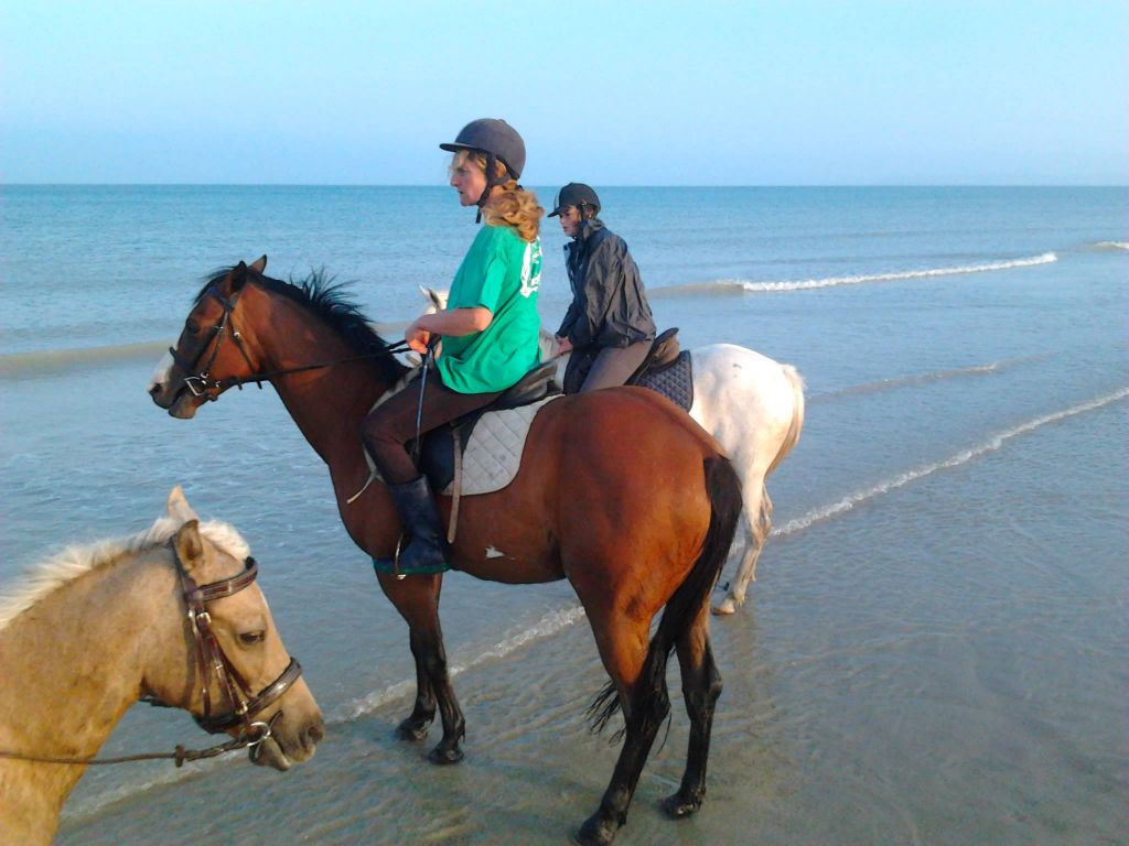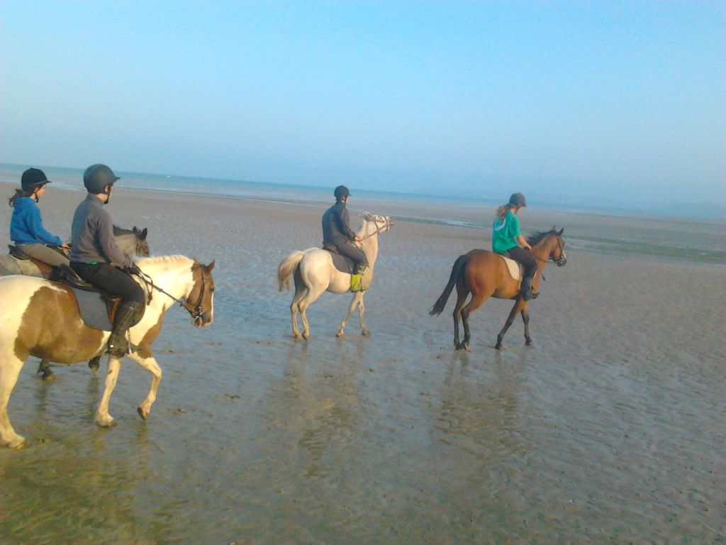 Allez, une petite photo de groupe et on rentre. Encore un petit galop à fond, un trotting les pieds dans l'eau (Sissi en mode Moïse ! ... mais faute de mer Rouge, ce sera la Manche. ) et on sort du sable avant le gong de 9h. Au final, tous quelque peu trempés, du boulot pour laver les poneys et le matériel, mais bien réveillés et le sourire jusqu'à là !