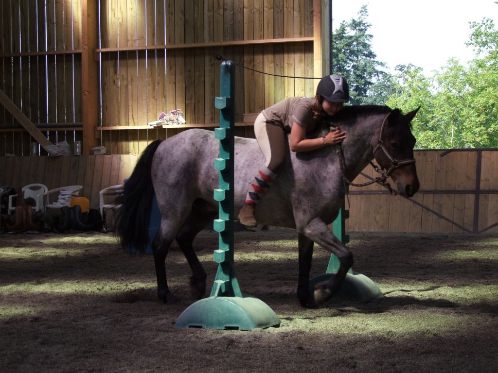 Et dès la détente, on profite de ce qui s'offre à nous pour travailler: Olivier venu arroser le manège avec son tracteur ? Parfait pour tester la confiance et le calme des chevaux. Ceux-ci se sont d'ailleurs bien comportés. Puis, les choses sérieuses commencent: Christèle explique les différents exercices au sol ou monté et les cavaliers se répartissent pour travailler en autonomie. Les chevaux et poneys ont donc pu mettre les sabots dans les pneus, passer sous la chambrière qui repose sur les chandeliers, suivre son cavalier partout, y compris quand l'idée lui venait de marcher sur des plots, rester immobile dans le carré et venir à l'appel, sauter le sous-bassement, jouer avec le bidon, déplacer les hanches, faire des épaule en dedans et bien d'autres. Et quel plaisir pour les cavaliers de voir son cheval à l'écoute, le suivre au pas et au trot et même sauter un obstacle !