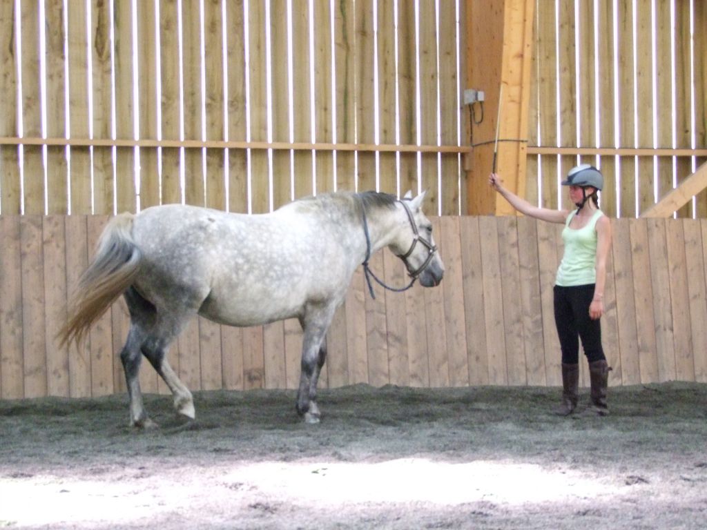 Le soleil tape dur en ce 26 juillet, c'est donc dans la fraicheur du manège où nous allons nous réfugier pour ce stage d'éthologie. Cinq couples cavalier-cheval ont participé à cette matinée centrée sur la compréhension du cheval et la recherche du calme et de la confiance pour une équitation en légèreté : Marion et Prune, Caro et Obléa, Sosso et Mister, Nolwenn et Katia et Killian et Jet.