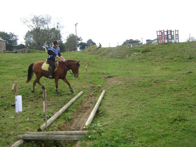 Un bon repas entre les dents nous a redonné un coup de fouet pour la suite: une équipe en pleine forme et soudée ( comme d'hab ) a permis d'affronter la maniabilité et le cross avec un mental d'acier. Au programme, 12 difficultés: un slalom, un test d'immobilité du cheval sans son cavalier, les bordures maraîchères, le test du montoir dans un cercle sans bouger, un plan descendant, un "S" en maniabilité, un fossé à franchir, un "L", un contre-bas, un tronc, un passage à niveau, et enfin le gué ! Une note sur 10 était affectée pour chacune des difficultés. Et là, moment magique, l'expérience du tandem de Feins, et le gros travail fourni en stage éthologie ( Merci Caro et Vio pour votre assiduité à ces stages! ) ont largement contribué à notre réussite. Les cavaliers et les chevaux/poneys ont été sublimes: Tout d'abord Thaïs, mis à part le contre-bas un peu hésitant, a tout réussi avec calme et grâce, même le montoir où elle est restée immobile, le test d'immobilité de 10 secondes toute seule dans un petit cercle sans bouger, il fallait le voir pour le croire ! les poneys, quant à eux, ont pleinement joué le jeu, des élèves parfaits, Katia tout réussi (sauf le passage à niveau) avec une excellente complicité de Caro, Tornado parfaitement subtil avec Violette et Zibeline tenace avec Léo (encore un peu de travail sur la partie cross mais beaucoup de bonnes choses) et notre Anaïs avec Nini, le petit couple qui a bien évolué durant tout l'été nous l'a encore prouvé !