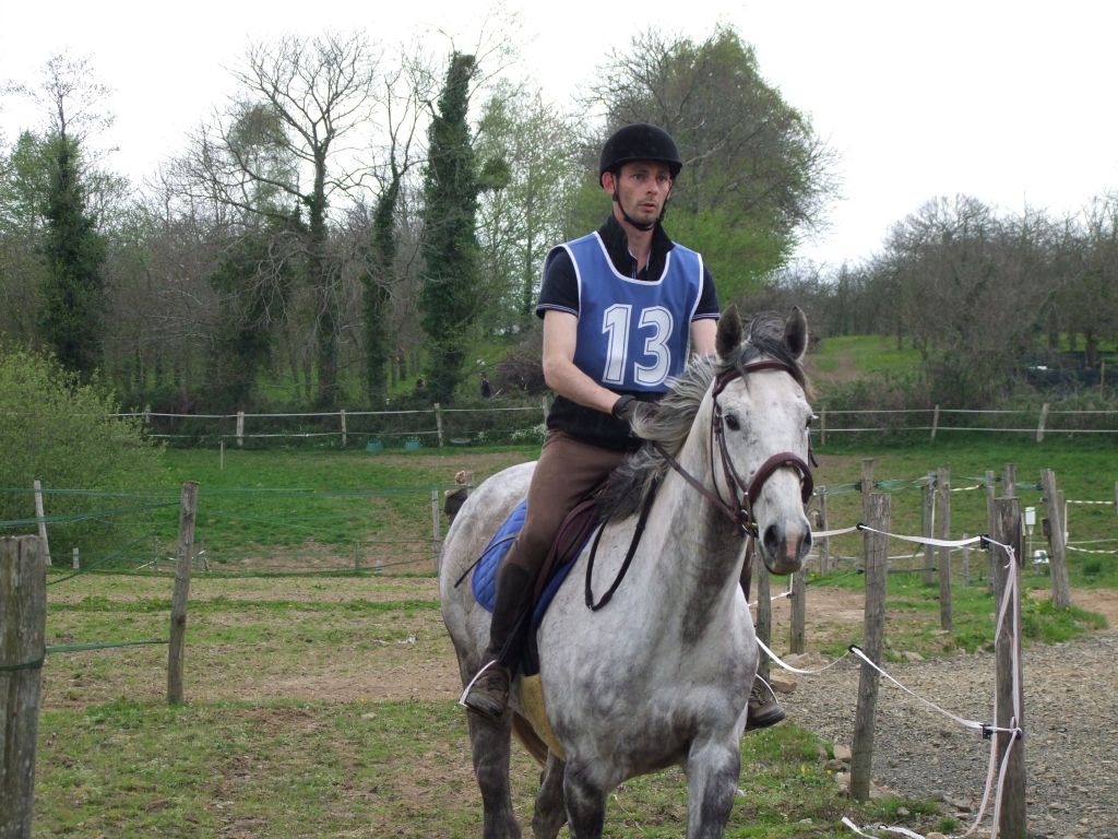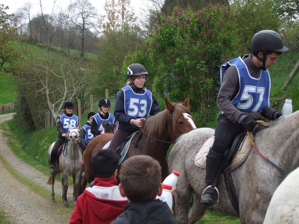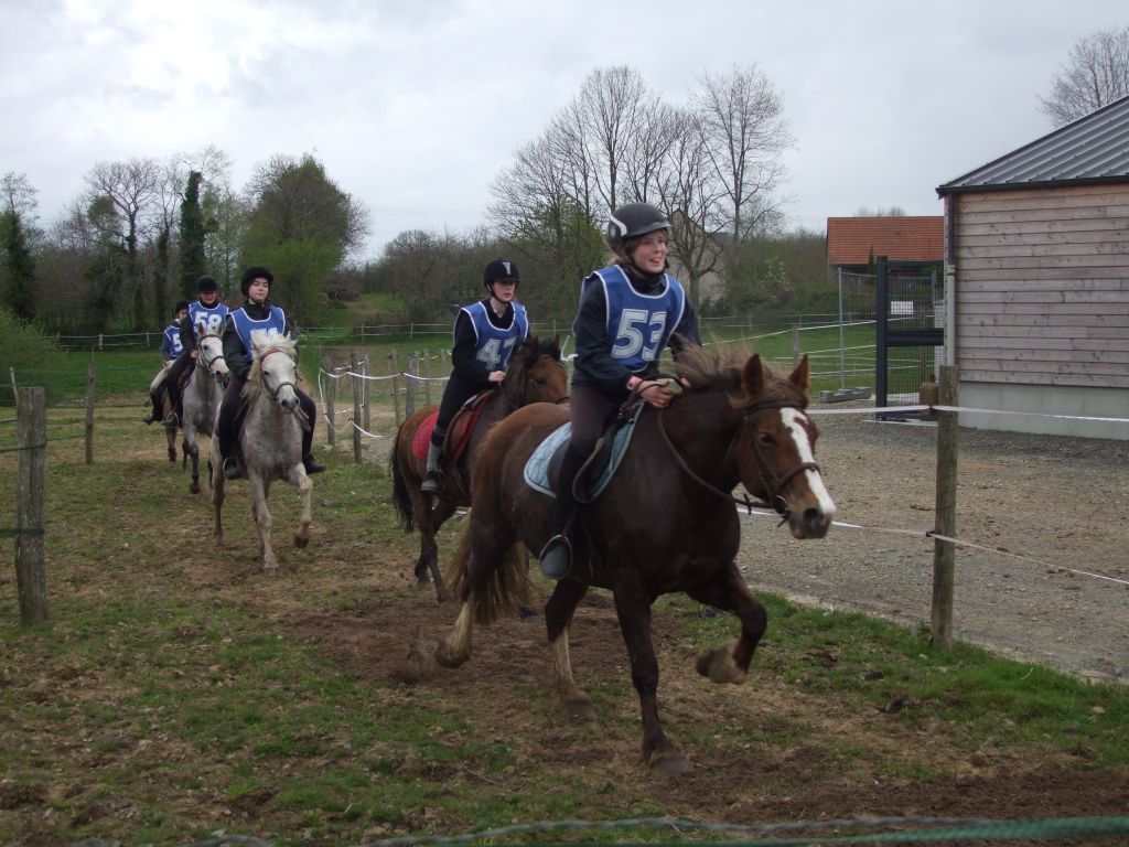 Grosse journée mais quel plaisir : un délicieux parcours s'offrait à nos yeux : un tour dans les pommiers d'abord, puis une succession de longs chemins creux qui n'étaient pas sans me rappeler mes galopades du lundi en tant qu'élève monitrice; bref, 7 années se sont passées depuis et me voilà avec mes grands et petits cavaliers. Le parcours était magnifique certes mais la sécurité a été testée à plusieurs reprises avec des passages dans beaucoup d'endroits ouverts: de grands champs où on était bien tenté de mettre le pied sur l'accélérateur. Départ un peu chaud avec mon groupe de 7, Pif pris d'un soudain élan de gaieté dans les pommiers commence à secouer activement Maëlenn qui heureusement a bien géré. Autre moment de solitude avec un balisage mal orienté qui nous envoie tous les 8 dans un immense champ de Ray grass et ses bou... de vaches. Cavaliers dans l'ensemble très attentifs, quelques petites difficultés avec les distances de sécurité mais tous bien en selle avec des chevaux et poneys connaissant leur travail. Vitesse moyenne : 11.25.