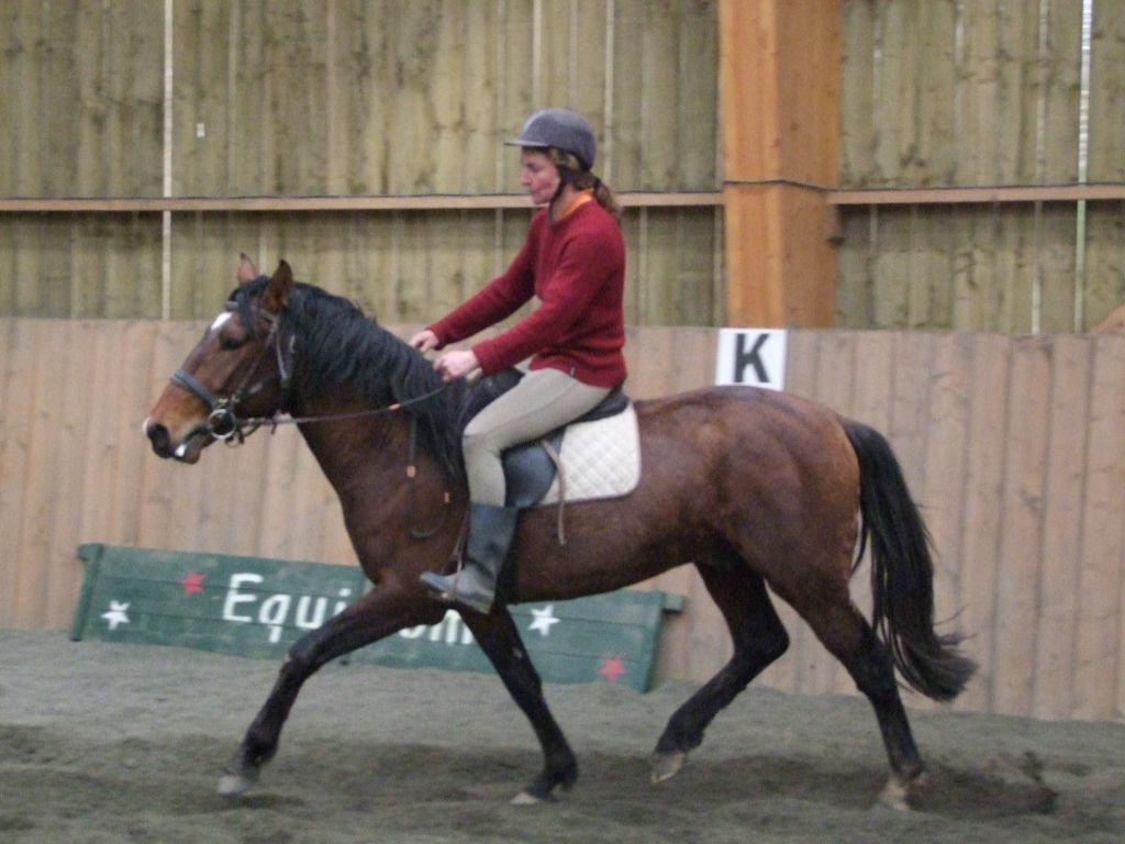 Puis vient l'heure d'enjamber. L'oeil est inquiet... La tête est haute et le dos crispé. Christèle s'assoie doucement. Elle montre bien son buste en avant, Les premiers pas sont heurtés, Biblio semble un peu perdu. Pas de souci, on descend, quelques pas pour se décontracter, puis on reprend. Cette fois-ci, Biblio a compris : il se soumet sans broncher au montoire, il accepte le cavalier puis c'est le départ.