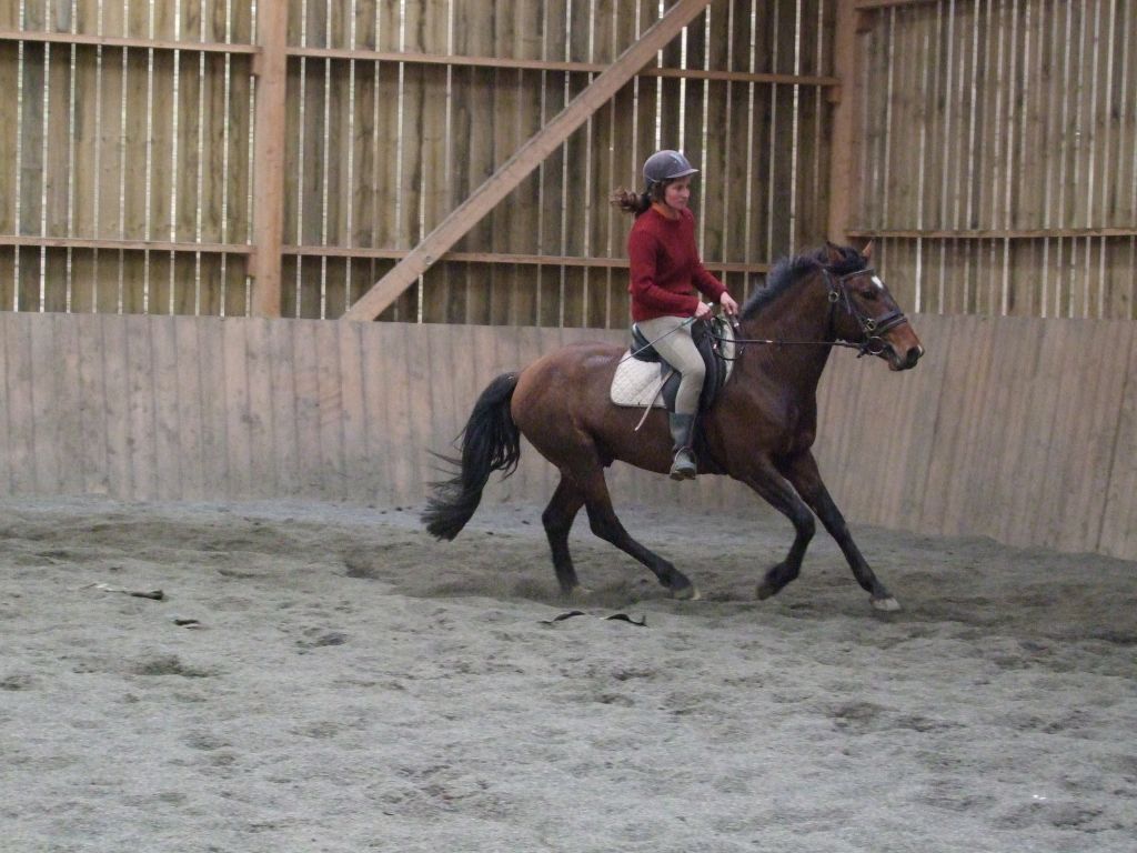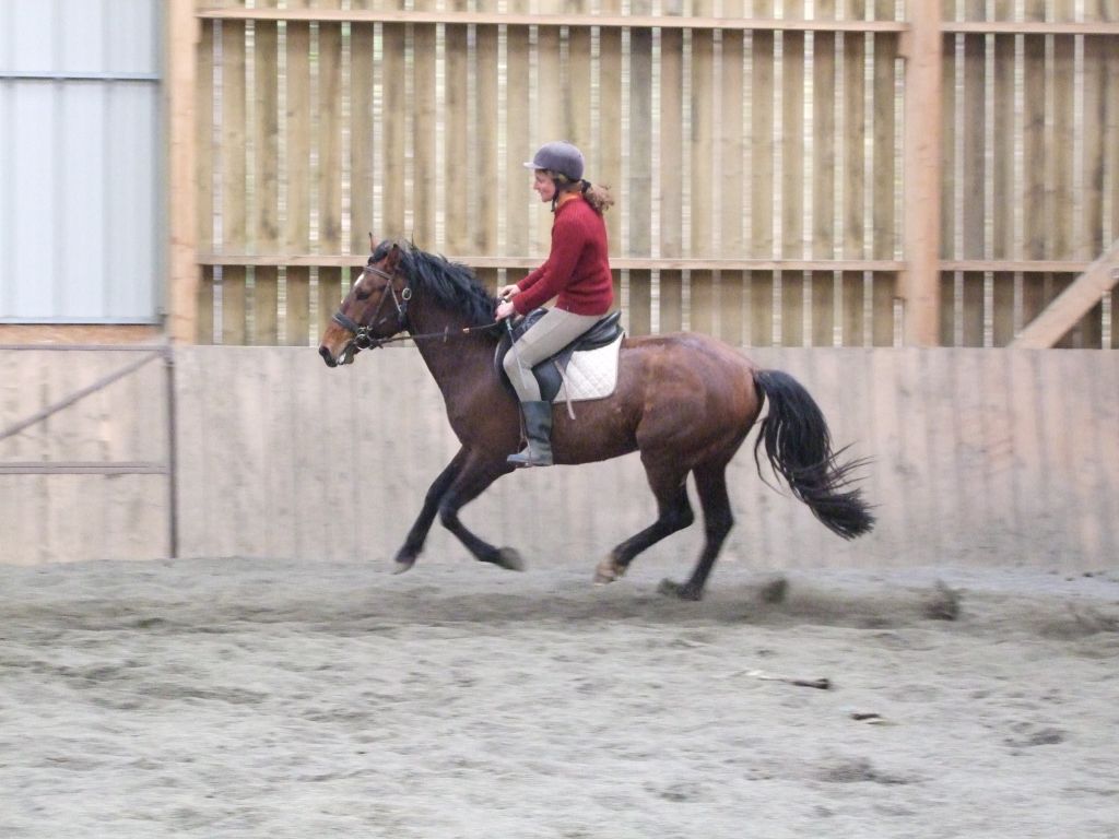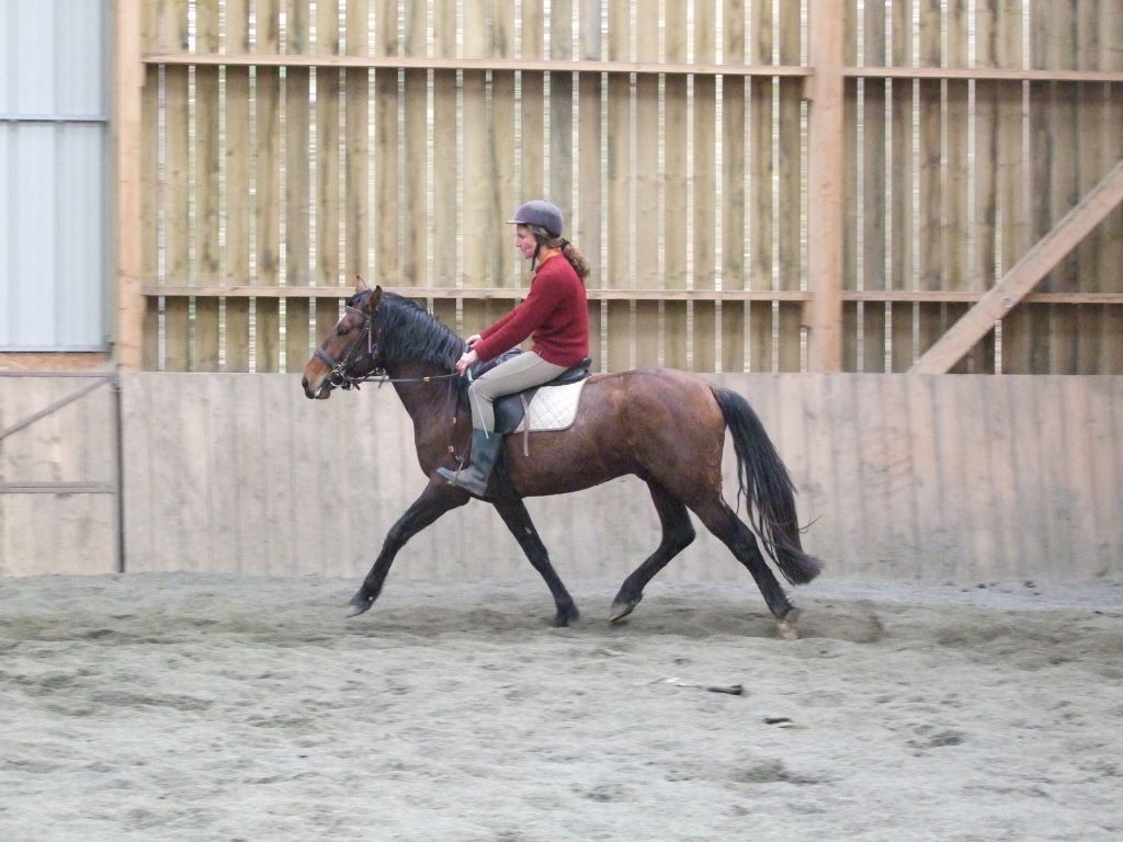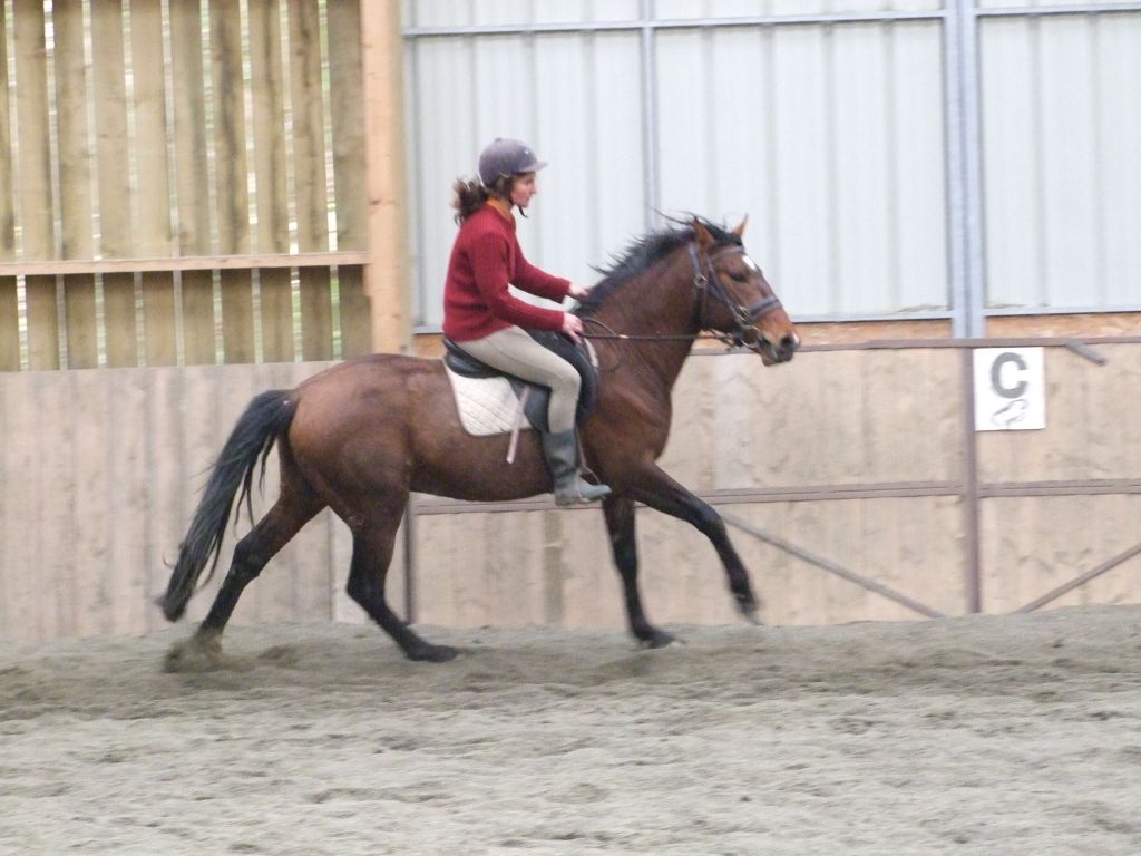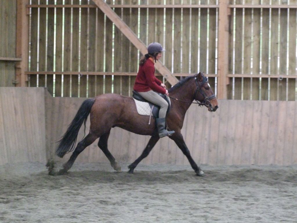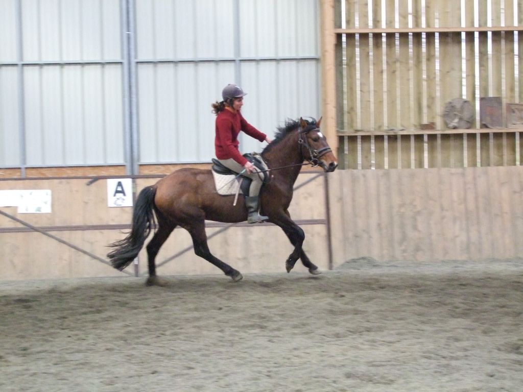 Oui Mélanie, pour la deuxième séance montée, on peut dire qu'il a compris les bases. Très réactif à la jambe, des difficultés à s'arrêter comme Maman mais il se dirige à présent très bien avec beaucoup d'activité. C'est un petit cheval chaud mais pour l'instant il reste délicat en bouche. Il est très appliqué au travail et concentré malgré le fait qu'il soit entier ! Avec du travail, il va devenir intéressant, il me rappelle Mister avec une bouche plus moëlleuse.