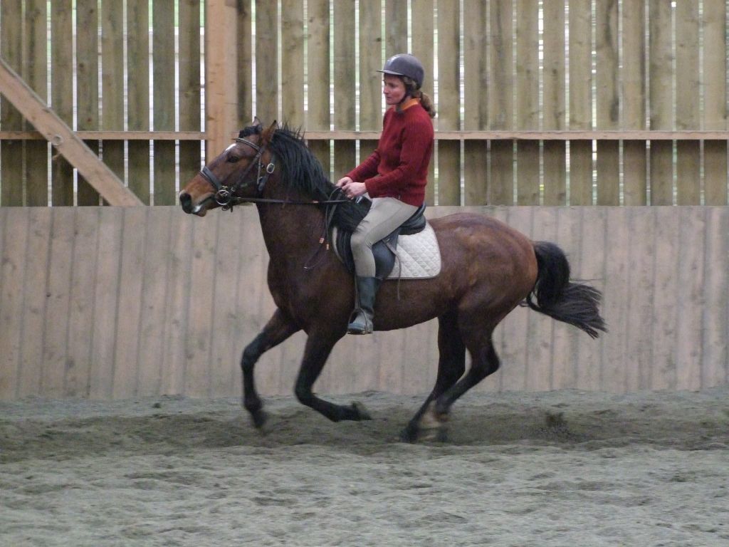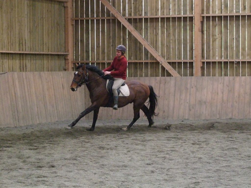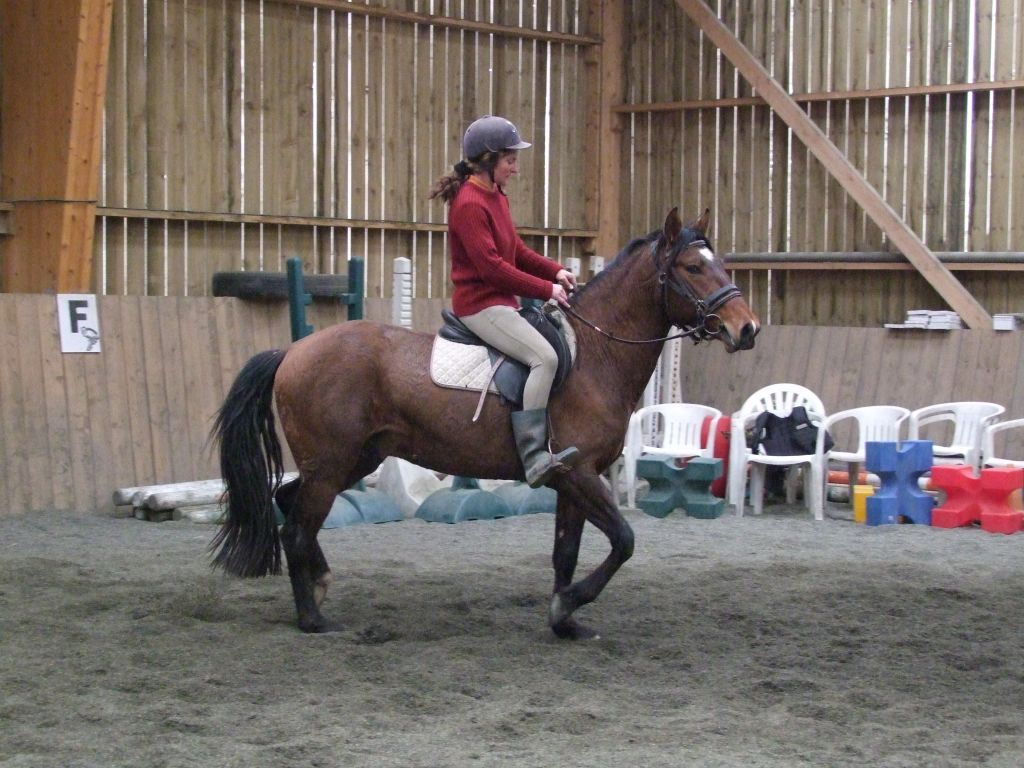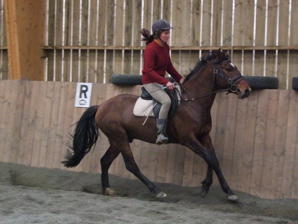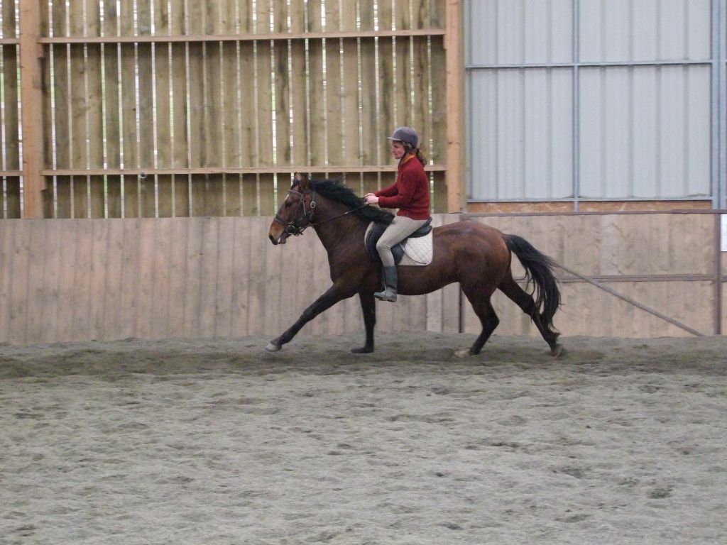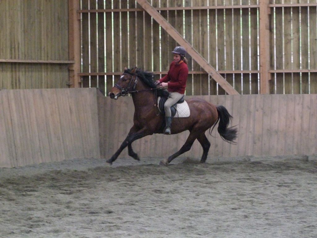 Oui Mélanie, pour la deuxième séance montée, on peut dire qu'il a compris les bases. Très réactif à la jambe, des difficultés à s'arrêter comme Maman mais il se dirige à présent très bien avec beaucoup d'activité. C'est un petit cheval chaud mais pour l'instant il reste délicat en bouche. Il est très appliqué au travail et concentré malgré le fait qu'il soit entier ! Avec du travail, il va devenir intéressant, il me rappelle Mister avec une bouche plus moëlleuse.