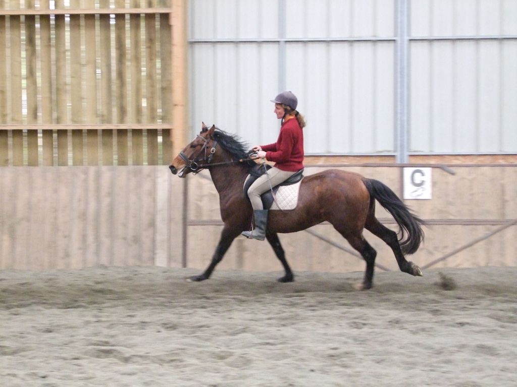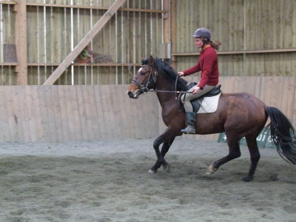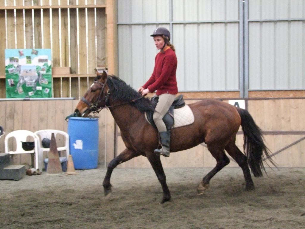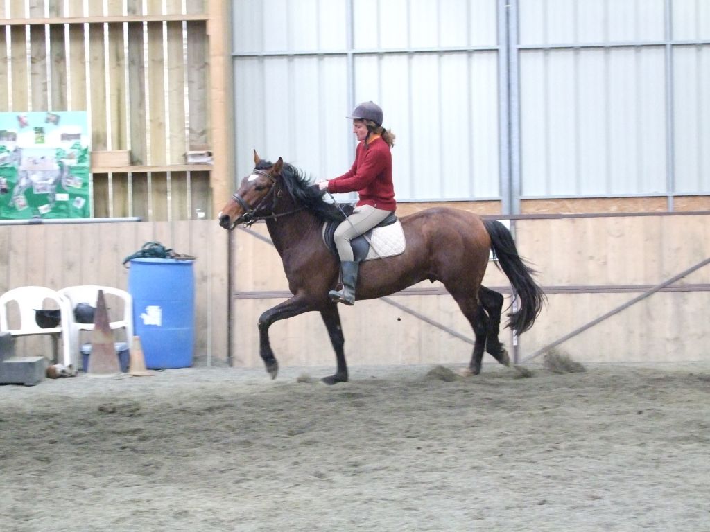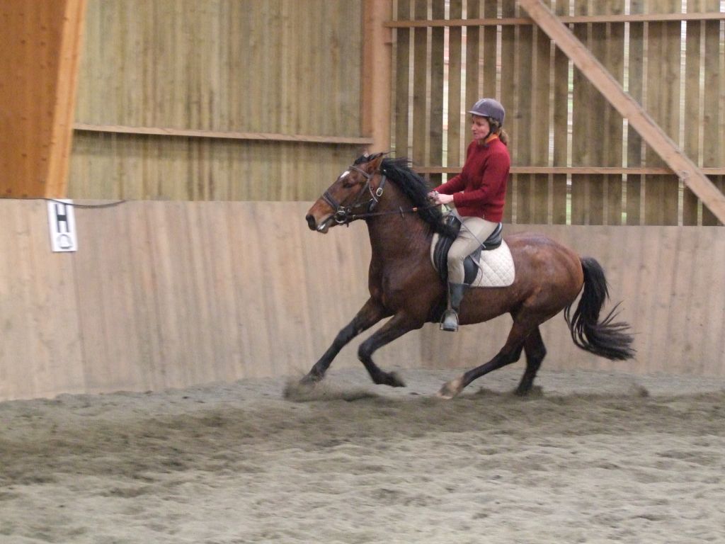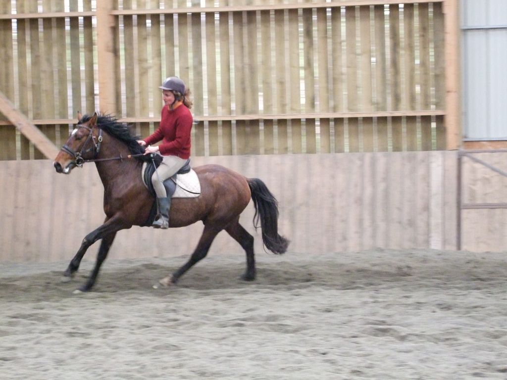 Quelques cercles plus tard, Biblio se montre très coopératif, il avance bien, malgré quelques signes de refus de la main. C'est normal, mieux vaut une explication progressive des contraintes liées au mors, plutôt qu'une résistance farouche qui mène à la bagarre... Christèle part ensuite en liberté... C'est parti, elle enchaine les trois allures aux deux mains. Biblio coopère.