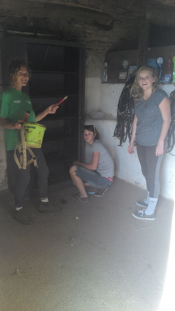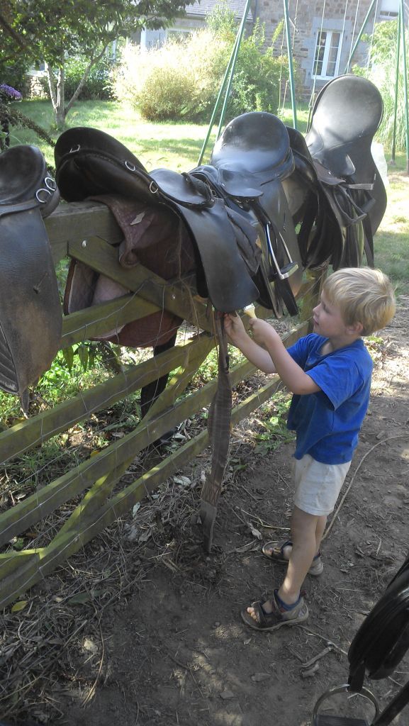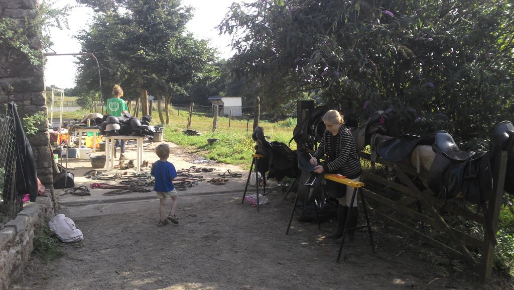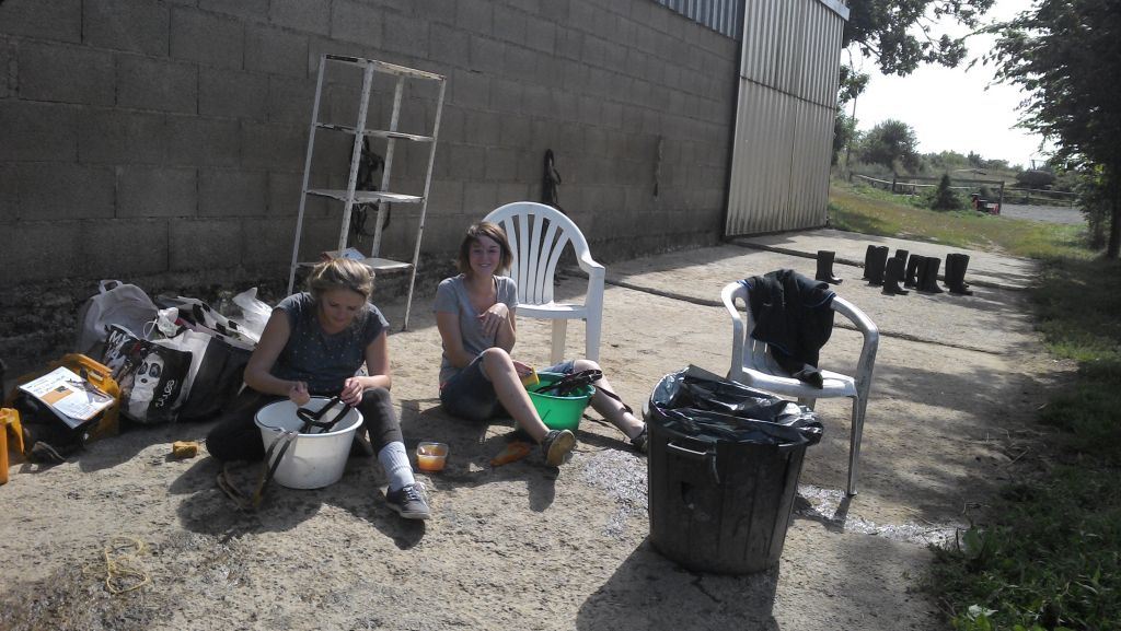 Tout ce petit monde s'est affairé à la tâche comme une colonie de fourmis. La sellerie a dans un premier temps été soigneusement vidée, tout son contenu gisait sur la dalle, quel bazard ! Hélo s'est précipitée sur les toiles d'araignée suivie de Mélanie, les seules combattantes des araignées. Et puis après une courte formation "cuir", les filets et selles ont été énergiquement nettoyés et graissés. Les filets ont été réidentifiés avec un super code couleur. Chacun a apporté ses idées, on a débattu sur la nouvelle déco, puis on a voté, un vrai conseil municipal ! On a fait également un énormissime tri, des trésors ont été retrouvés : le gogue d'Hélo, des licols, un gogue club, des filets, bref chaque cheval et poney a son filet même Oriana ! On a même commencé à accrocher les pancartes FFE.