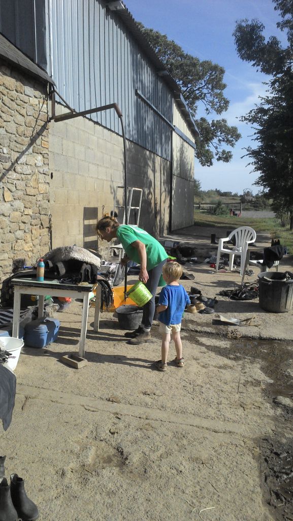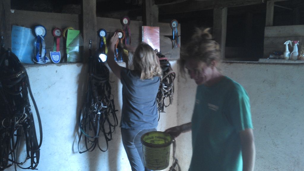 Dimanche 1er septembre est survenu un évènement hors du commun : le rangement de notre sellerie à l'initiative d'un petit groupe de cavaliers dont je suis très fière. Hélo, chasseur de tête équidomienne a recruté une équipe efficace : Lou, Violette, Mélanie, Marie-charlotte, et Sébastien Turpin ( moins efficace mais indispensable pour l'ambiance ).