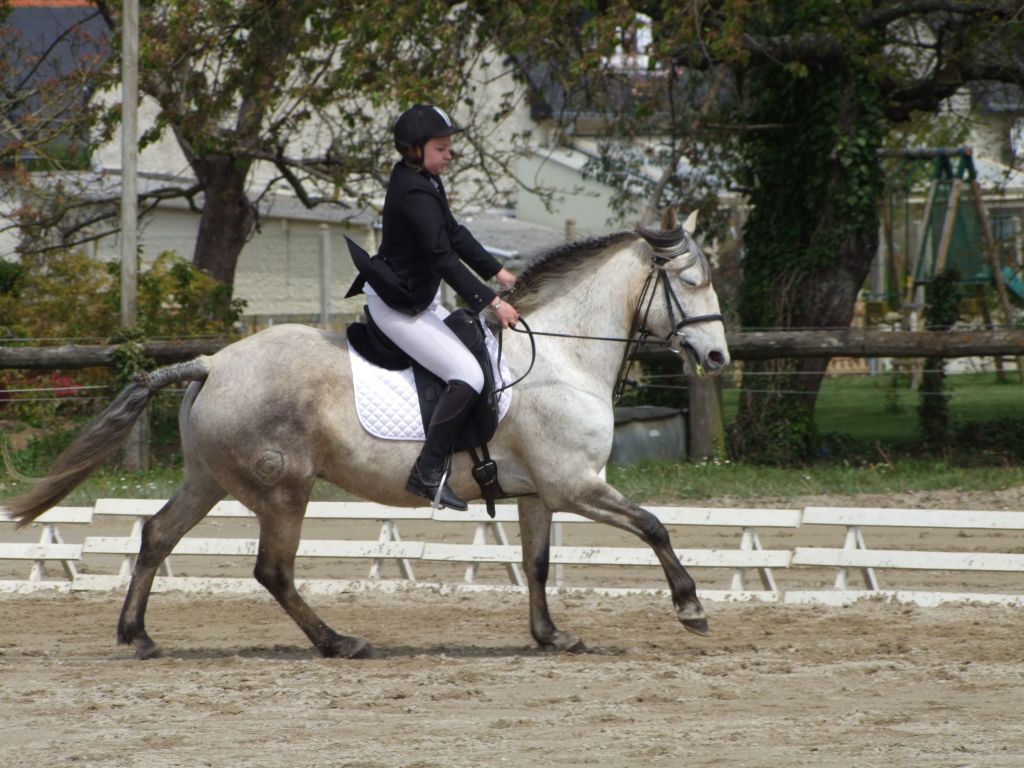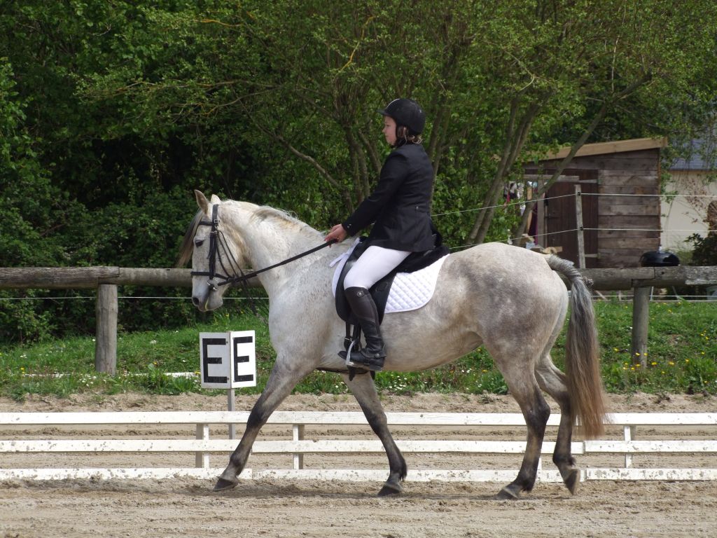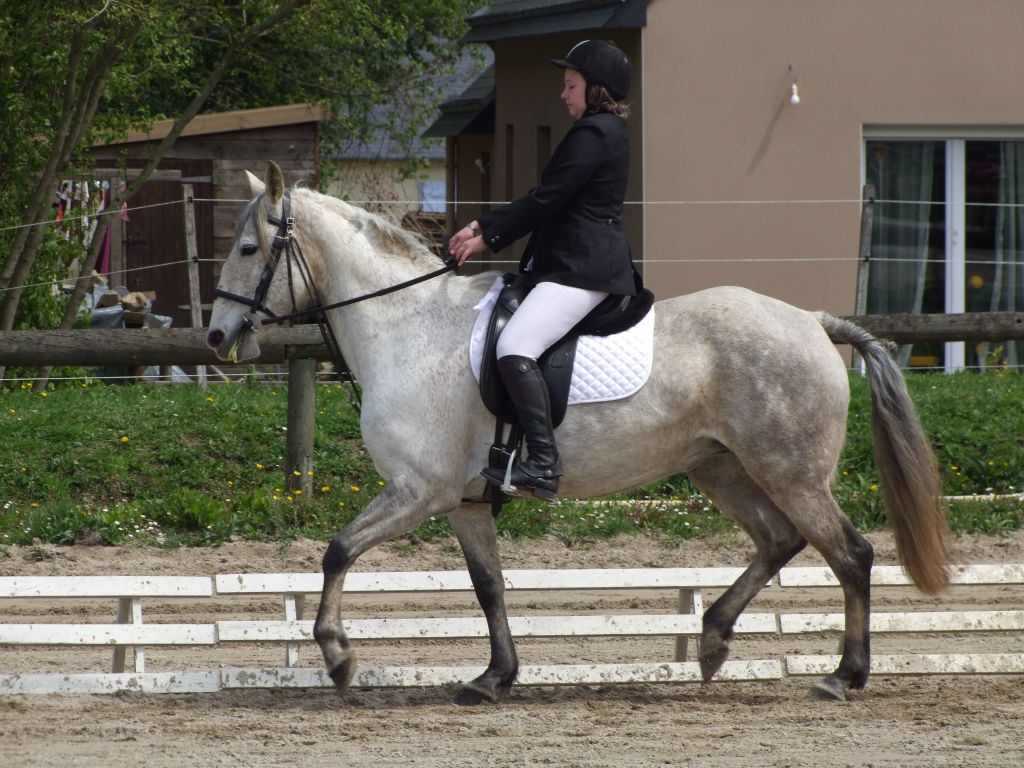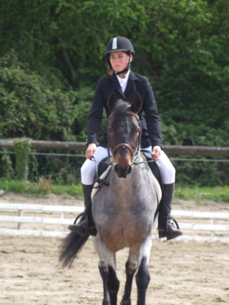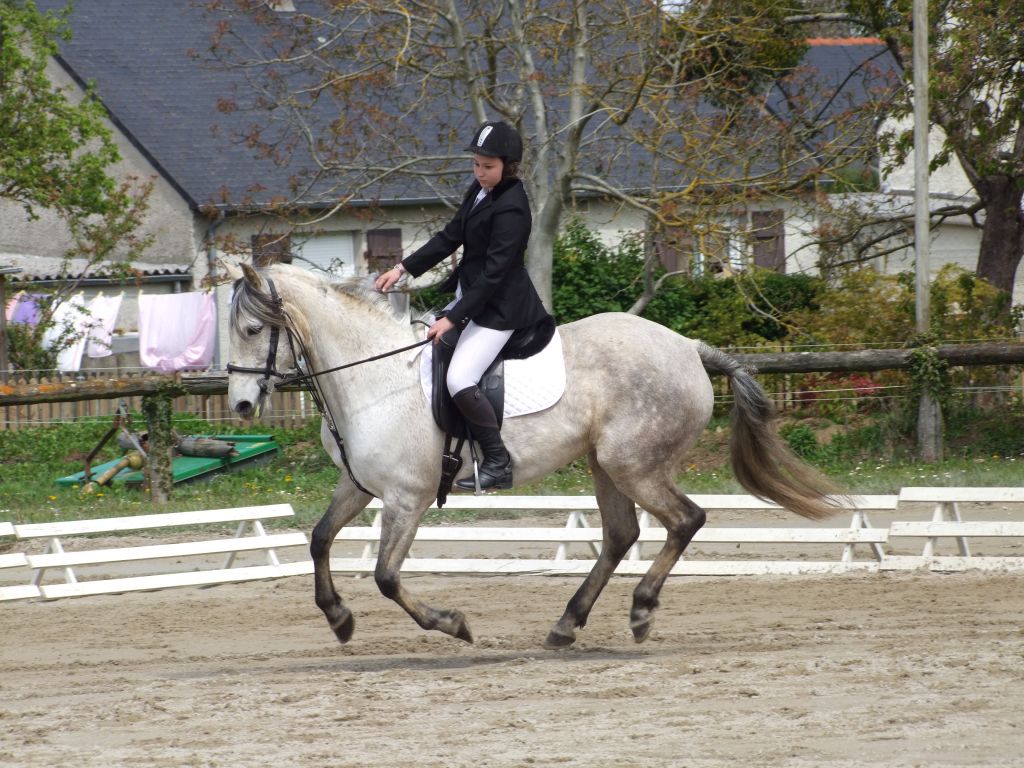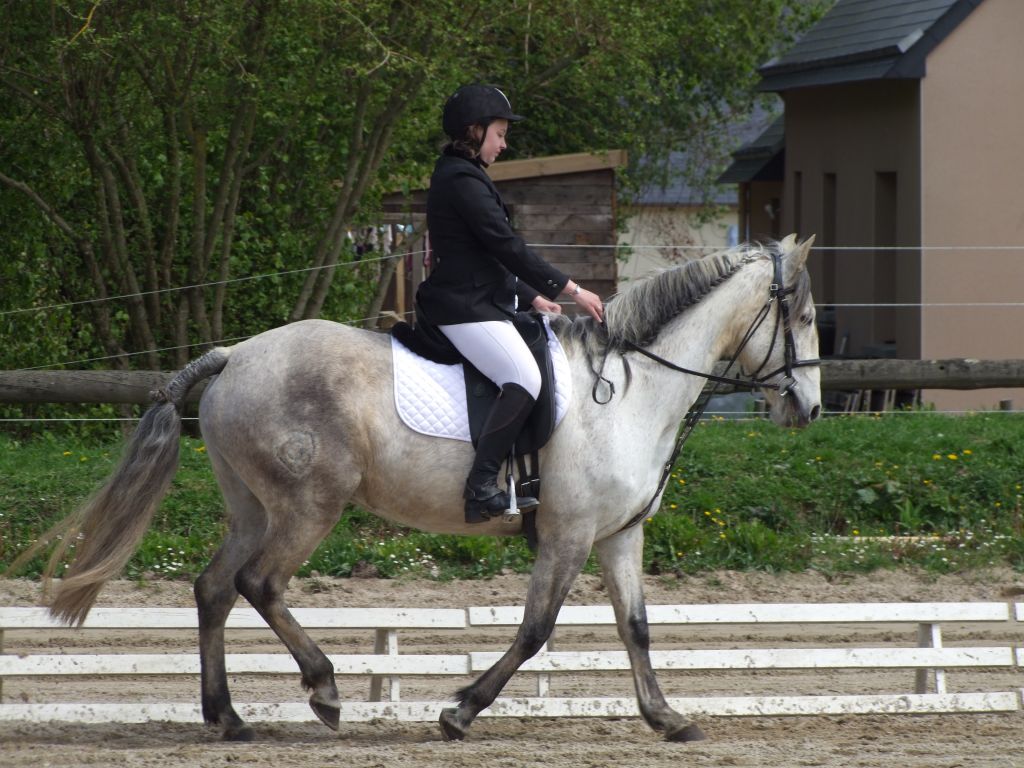 La compétition sous-entend souvent saut d'obstacles; durant toute l'année, de nombreuses sorties ont été faites en CSO à la fois en compétition officielle (concours club) et concours d'entraînement. Le 1er mai, nous nous sommes aventurés dans un concours de dressage, discipline souvent délaissée car répétitive et jugée monotone. Flo, toujours présente au front s'est lancée avec Jet, Sébastien avec Thaïs et Anaïs avec Niny, une jument lusitanienne appartenant à Dominique Hatte (Papa de Zibeline). De plus, c'était le championnat départemental ! La préparation fut plutôt houleuse, Thaïs parfois très chaude, Jet un peu fainéant et ouvert, Niny qui commençait à anticiper tous les mouvements, bref rien de gagné ! La dernière surprise : le guogue commandé était interdit ! finalement, nos trois cavaliers étaient un peu tendus ( c'est beaucoup plus stressant qu'un CSO m'ont dit Flo et Sébastien !! ). Au final, Jet avec sa robe printannière a été admiré, un peu ouvert mais très apprécié. Dommage, Flo perd des points sur la serpentine mais s'en tire avec des notes honorables (65,67/100) sachant que le premier était à 70,67, ce qui la hisse à la 16ème place (1er quart) sur 28 engagés. Pas si mal pour une première fois. Bravo à tous les 2 ! Belle récompense pour Jet qui a su montrer ses qualités en dressage que je ne cesse de valoriser. Bravo pour sa polyvalence, puisque Flo l'a également sorti en CSO (poney 4) cette année et Killian en endurance (Club 3). Belle prestation de Niny, une magnifique lulu puisque Anaïs atteind les 64 points (20ème place et 1er quart également), note très correcte pour la première sortie de Niny. Une erreur d'étourderie sur les cercles au trot de 15m qui sont devenus des cercles de 20m (pourtant Anaïs était la seule à réellement les maîtriser à l'entraînement...) et un petit manque général de rectitude de la jument. Quant à Sébastien, il n'a jamais aussi bien monté en dressage, Thaïs ne s'est jamais aussi bien présentée mis à part les arrêts (malgré tout, meilleurs qu'à l'entraînement); elle n'a que 5 ans, la plupart était beaucoup âgée et horreur! Thaïs a eu la note de 52,67, les juges l'ont trouvée très contractée... Je vous laisse découvrir les photos qui heureusement sont là pour témoigner de sa grâce sur le carré de dressage ! Bref, une journée riche en émotion et de bonheur dans une ambiance de compétition tout à fait agréable. On attend de nouveaux cavaliers du club pour se lancer.