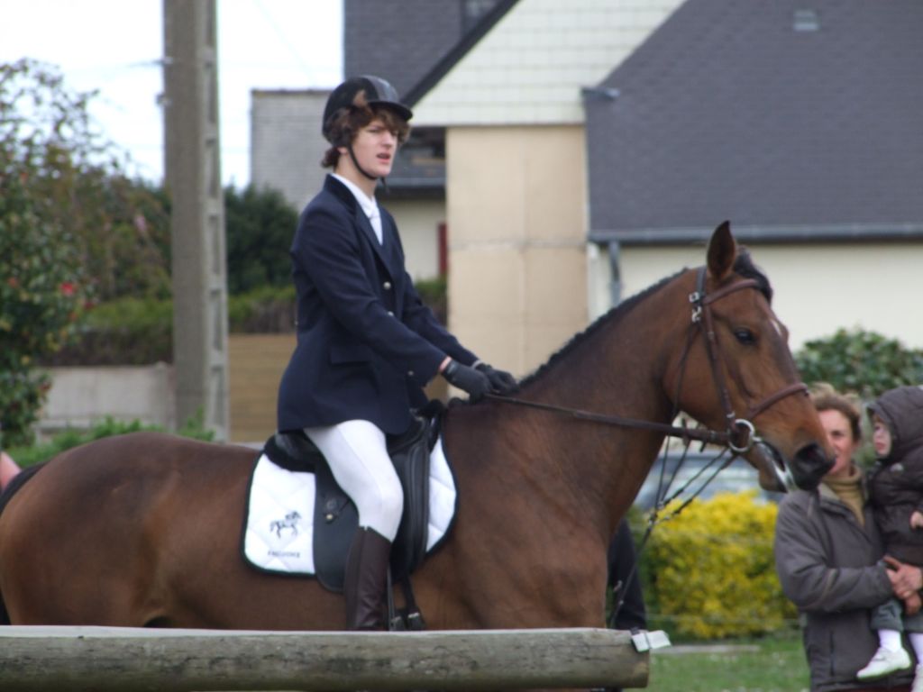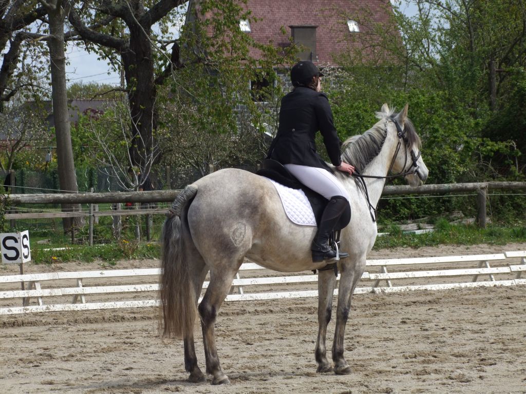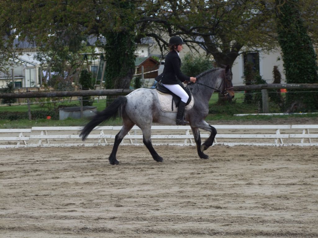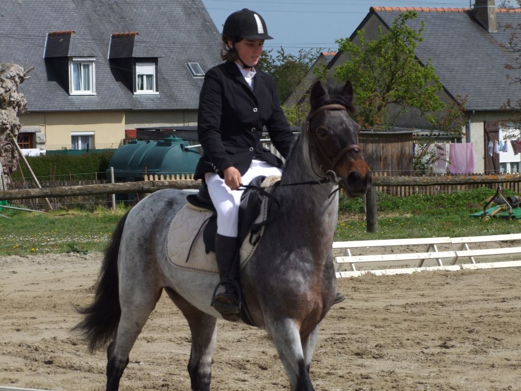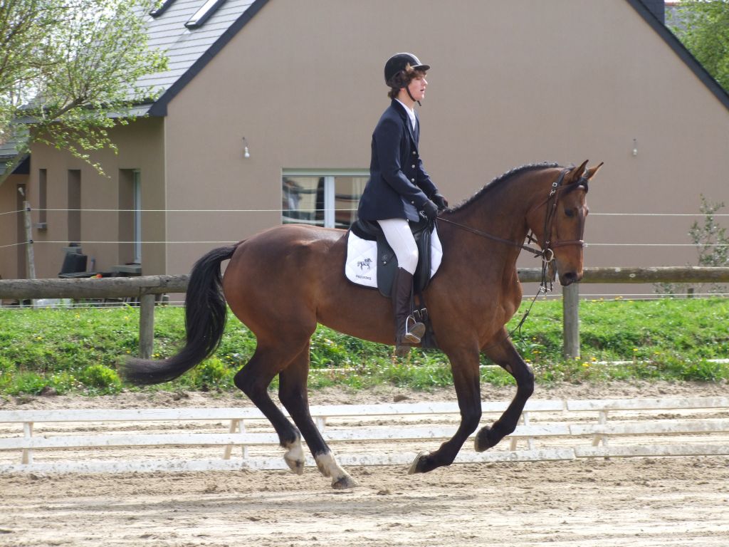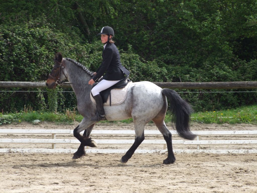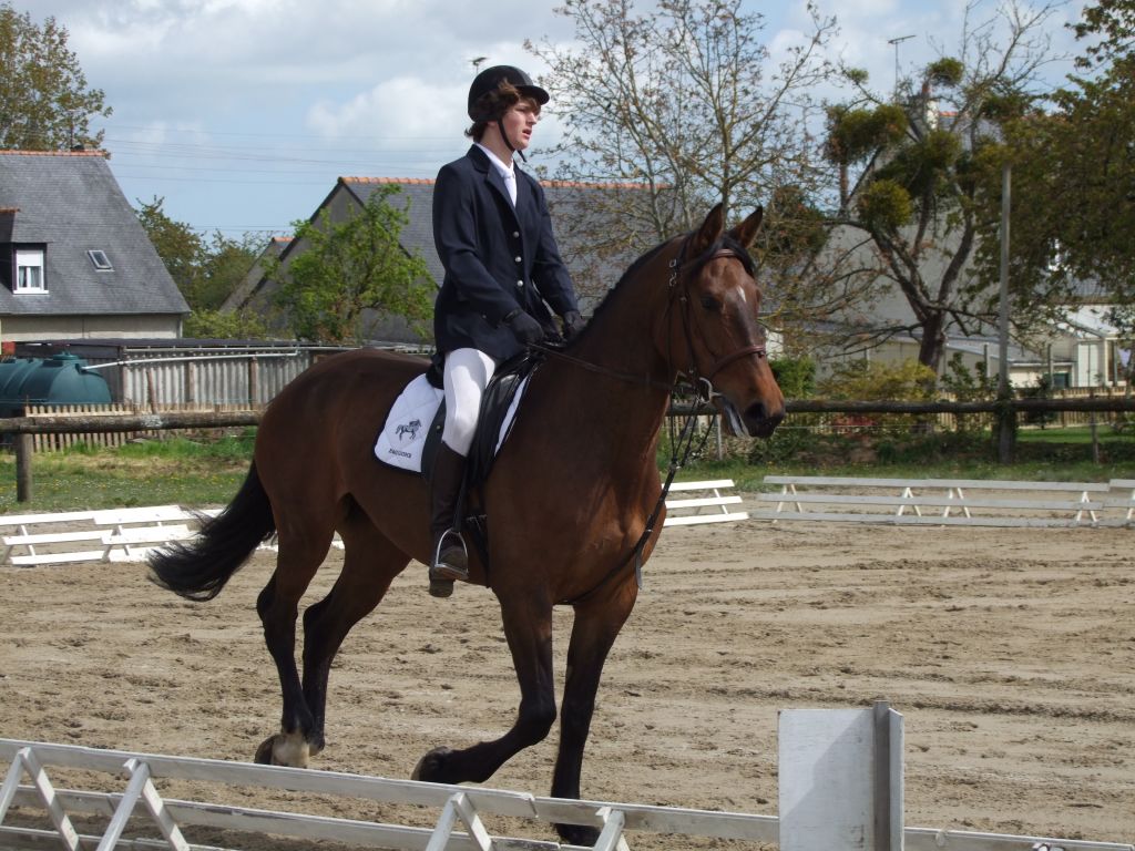La compétition sous-entend souvent saut d'obstacles; durant toute l'année, de nombreuses sorties ont été faites en CSO à la fois en compétition officielle (concours club) et concours d'entraînement. Le 1er mai, nous nous sommes aventurés dans un concours de dressage, discipline souvent délaissée car répétitive et jugée monotone. Flo, toujours présente au front s'est lancée avec Jet, Sébastien avec Thaïs et Anaïs avec Niny, une jument lusitanienne appartenant à Dominique Hatte (Papa de Zibeline). De plus, c'était le championnat départemental ! La préparation fut plutôt houleuse, Thaïs parfois très chaude, Jet un peu fainéant et ouvert, Niny qui commençait à anticiper tous les mouvements, bref rien de gagné ! La dernière surprise : le guogue commandé était interdit ! finalement, nos trois cavaliers étaient un peu tendus ( c'est beaucoup plus stressant qu'un CSO m'ont dit Flo et Sébastien !! ). Au final, Jet avec sa robe printannière a été admiré, un peu ouvert mais très apprécié. Dommage, Flo perd des points sur la serpentine mais s'en tire avec des notes honorables (65,67/100) sachant que le premier était à 70,67, ce qui la hisse à la 16ème place (1er quart) sur 28 engagés. Pas si mal pour une première fois. Bravo à tous les 2 ! Belle récompense pour Jet qui a su montrer ses qualités en dressage que je ne cesse de valoriser. Bravo pour sa polyvalence, puisque Flo l'a également sorti en CSO (poney 4) cette année et Killian en endurance (Club 3). Belle prestation de Niny, une magnifique lulu puisque Anaïs atteind les 64 points (20ème place et 1er quart également), note très correcte pour la première sortie de Niny. Une erreur d'étourderie sur les cercles au trot de 15m qui sont devenus des cercles de 20m (pourtant Anaïs était la seule à réellement les maîtriser à l'entraînement...) et un petit manque général de rectitude de la jument. Quant à Sébastien, il n'a jamais aussi bien monté en dressage, Thaïs ne s'est jamais aussi bien présentée mis à part les arrêts (malgré tout, meilleurs qu'à l'entraînement); elle n'a que 5 ans, la plupart était beaucoup âgée et horreur! Thaïs a eu la note de 52,67, les juges l'ont trouvée très contractée... Je vous laisse découvrir les photos qui heureusement sont là pour témoigner de sa grâce sur le carré de dressage ! Bref, une journée riche en émotion et de bonheur dans une ambiance de compétition tout à fait agréable. On attend de nouveaux cavaliers du club pour se lancer.
