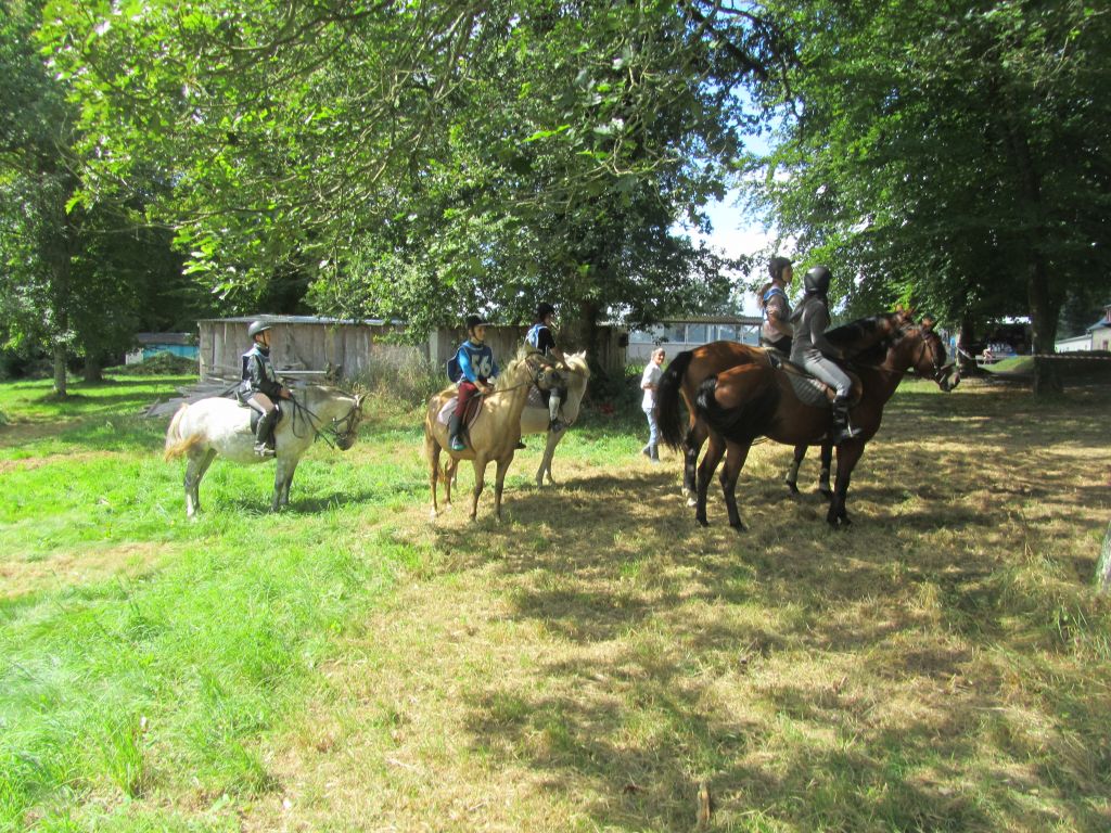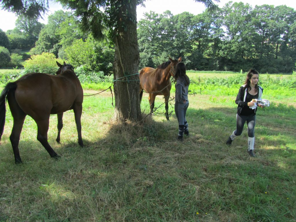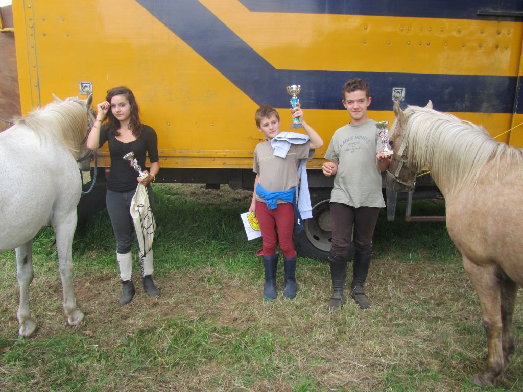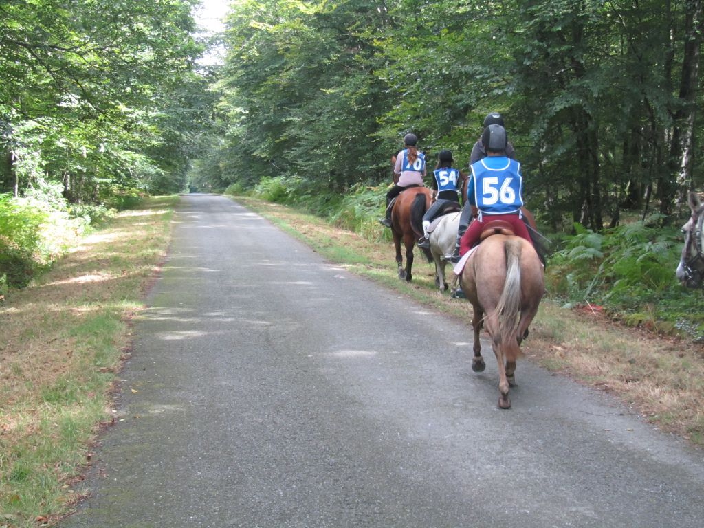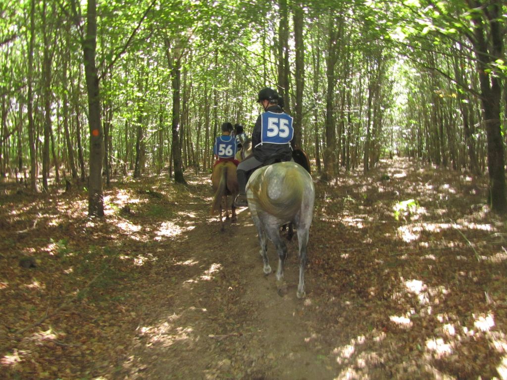 Des paysages agréables plein les yeux, et comme à l'habitude un groupe soudé. Les poneys ont donné de leur mieux, chose pas facile après 3 semaines de repos : Prune et Katia un peu enrobées... Une partie du parcours avec pas mal de racines à terre nous a fait perdre un peu de temps. De même, un gros saut de Katia, pour éviter un gué, a fait chuter Nicolas sur une grosse pierre. Heureusement Nicolas, très courageux est remonté spontanément. Le passage des autres gués nous a fait perdre aussi quelques minutes que nous avons tentées de rattraper mais pas facile. Du coup, bien partis sur un rythme de 12 km/h en début de course, nous avons franchi la ligne d'arrivée à 10.37 km/h mais le cardiaque était plutôt bon : Prune: 48, Léo: 48, Katia: 50 et attention Syska: 44, surprenante..., ce qui classe Killian et Manon: 7ème ex aequo, Nico: 9ème avec une coupe pour avoir été le plus jeune cavalier.