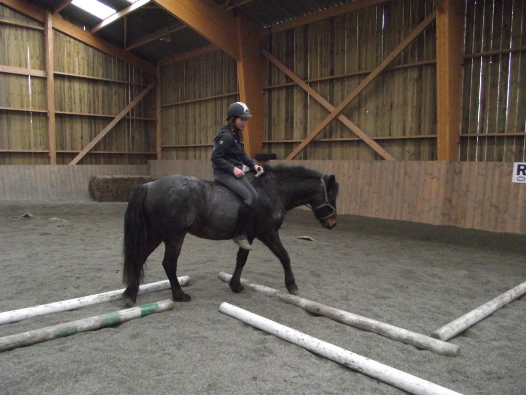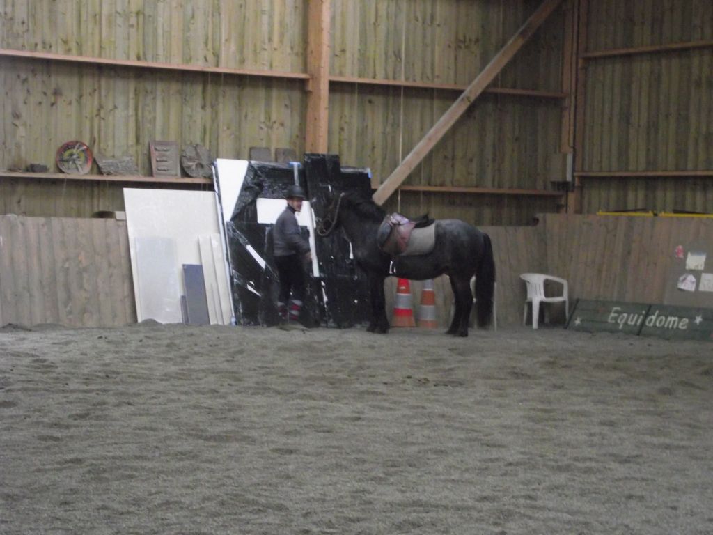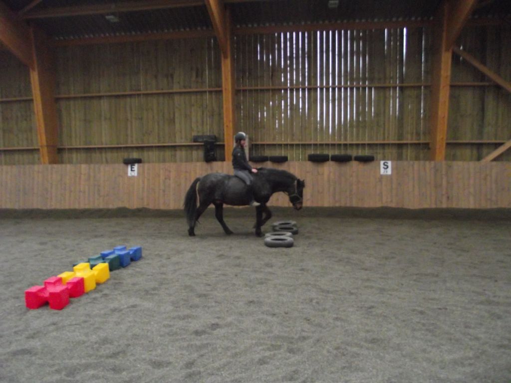 Olivier arrive, c'est l'heure du sac à patate, Athéna toujours excellente élève, réalise encore un sans faute. Pas le moindre stress... Phase terminale, je l'enjambe, du vrai bonheur, pas la moindre réaction. Enfin, Olivier me lâche, on utilise Katia ( Maman ) pour "tirer" et Athéna a  même commencé à comprendre les jambes. Encore un peu de travail, et bientôt Athéna pourra intégrer en douceur les cours parmi vous. Quelle chance !!!! Pour finaliser le stage, j'ai monté un petit parcours éthologique que chacun a pu faire avec son poney ou même Athéna à terre et à cheval ( à terre pour Athéna ). Composition du parcours : passer sous une chambrière suivi d'un couloir de pneus de plus en plus étroit, une rangée de pneus à sauter, une rangée de cubes à sauter, et un zigzag de barres de plus en plus étroit. Chacun a pu le faire soit à cru, soit en licol, voire les deux. Les poneys comme d'hab ont été merveilleux et patients, et les cavaliers remplis d'enthousiasme.