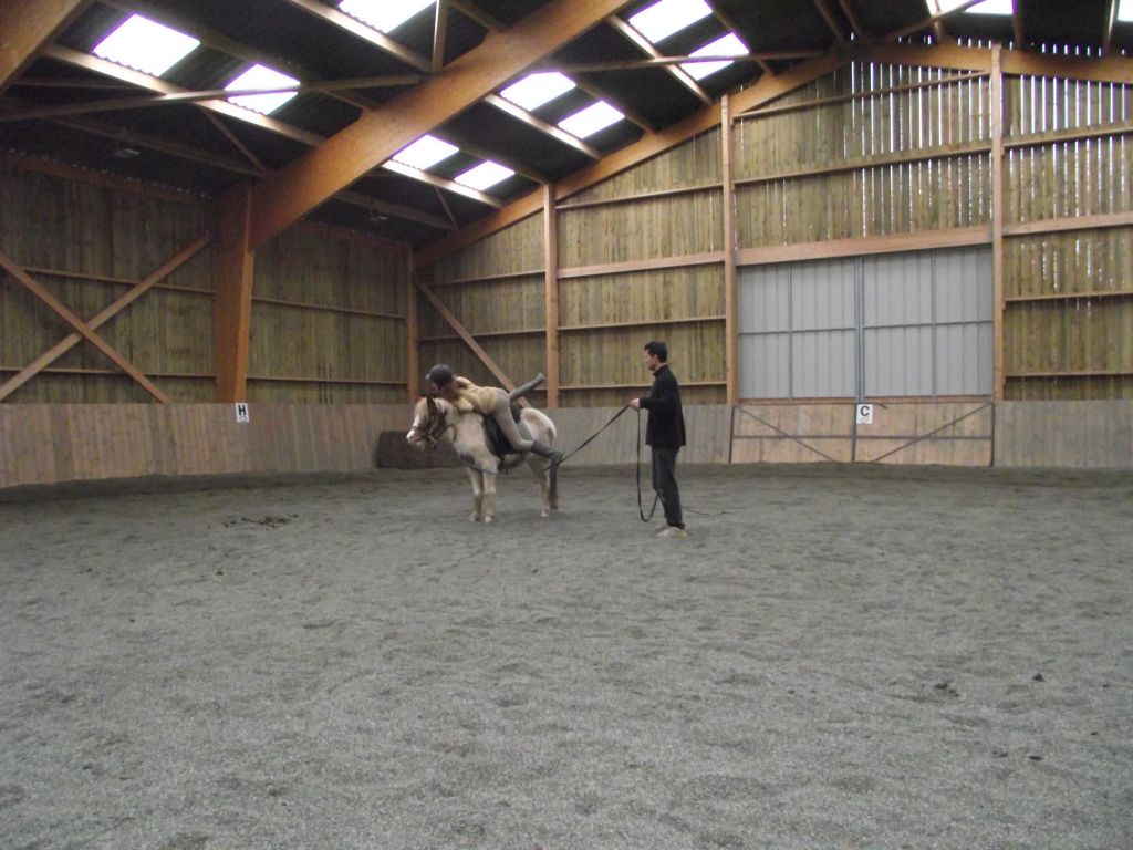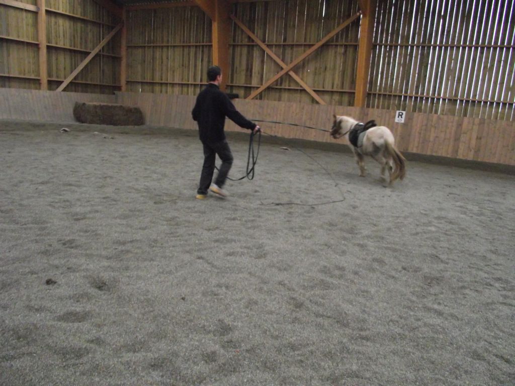 Premier exercice pour notre élève, rencontre avec le tracteur "nouveau" sur la route; Athéna déjà manifeste sa curiosité et son courage: pourquoi avoir peur du tracteur qui nous amène à manger ? puis, dans le manège, première chose, la mise à la longe qui se fait comme un vieux cheval, Athéna comprend tout et tout de suite. Tout le monde a appris ou revu comment tourner un poney à la longe.