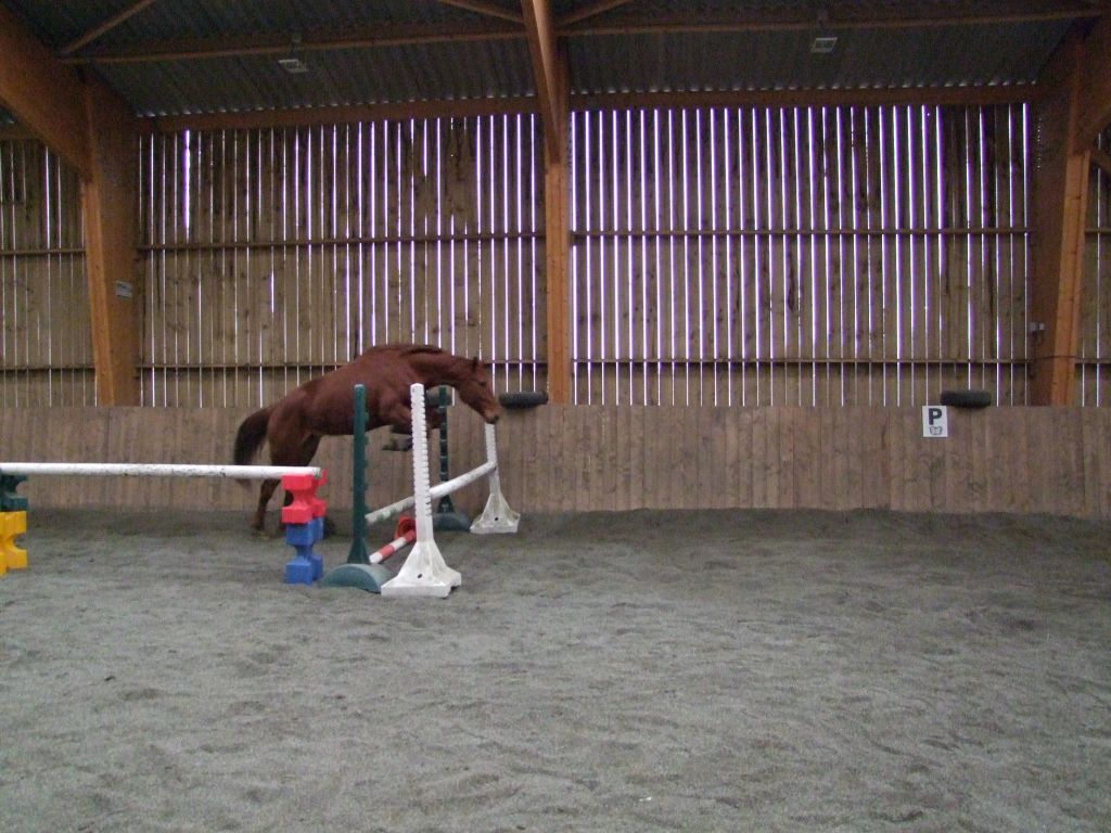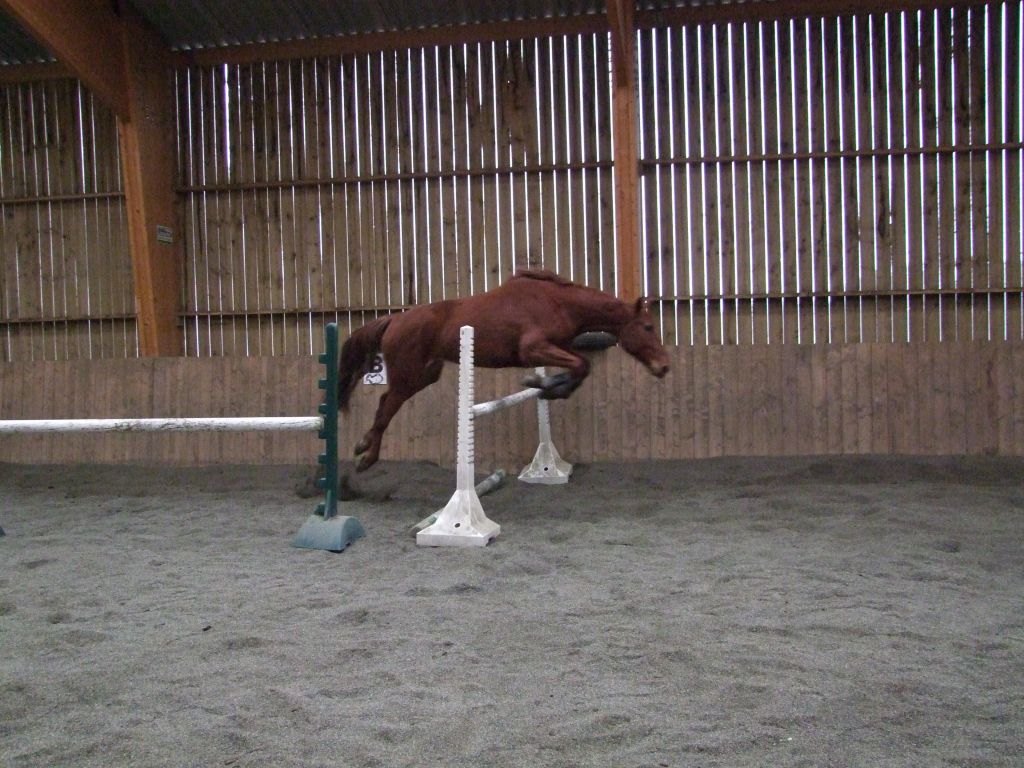 Après son débourrage de décembre, notre grande jument alezane continue son périple; Elle a réussi brillamment son intégration avec les plus grands sous ma selle puis sous celle de Sébastien samedi dernier; on a pu apprécier son sérieux au boulot, et sa volonté de bien faire. Et puis, dimanche, nous avons pris le temps de la faire sauter en liberté, nouveau test réussi. Pas de vice, toujours bonne élève au travail avec même un peu de joie ! les barres n'ont pas l'air de l'intimider, elle monte bien le garrot et plie plutôt bien ses genoux. Petite anecdote : j'avais laissé un morceau de pain sur une chaise pour la récompenser, et bien la demoiselle, après un des derniers sauts a jugé qu'elle avait bien fait et s'est récompensée toute seule en prenant le pain délicatement.