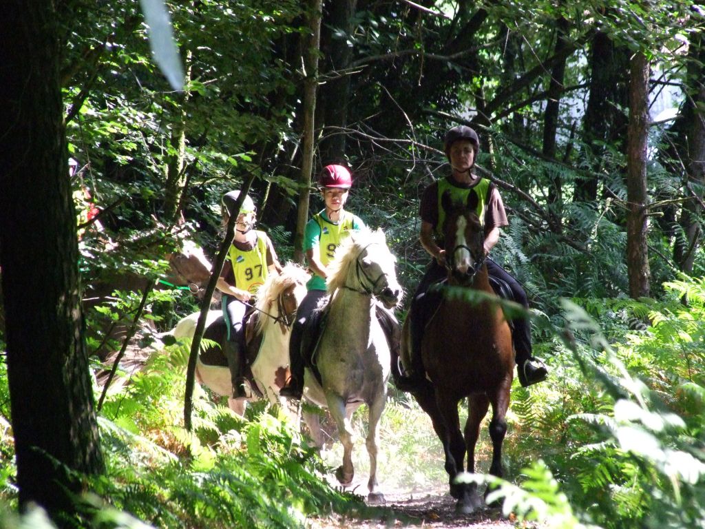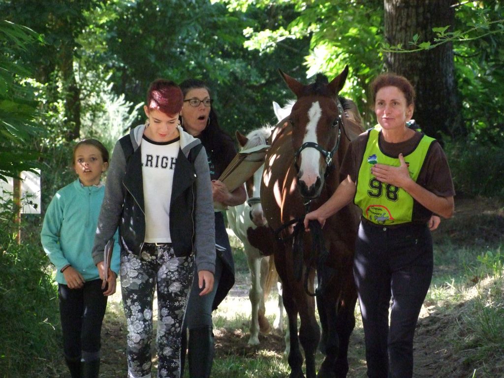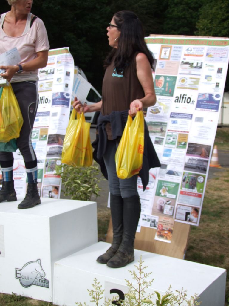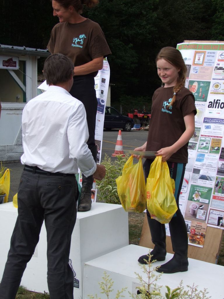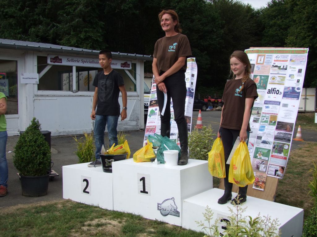 Enfin dernière difficulté, pour finir, nous arrivions dans une vaste clairière, et là Katia commençait à sentir l'arrivée, Célestin commençait à se faire emmener. Ponette néanmoins disciplinée, le stick devant sa tête a suffi pour la calmer. Nous avons franchi la ligne d'arrivée au petit trop avec seulement 2 minutes d'avance. Il était temps d'arriver ! Une équipe soudée avec un bel exemple de solidarité entre générations. Les cardios étaient très corrects surtout pour Sissi qui venait de faire sa 20 kms. Prune récupère à 40, katia à 45, Sissi à 46, Tornado à 46, et Loustic à 48 ! Nous n'avions pas de concurrents mais nous aurions pu être disqualifiés si je n'avais pas rattraper les 5 minutes des fameux gués. Encore un beau cadeau puisque laëtitia monte sur la première marche du podium, Célestin sur la 2nde avec avoir discuté au micro avec Jean-Pierre Allain notre prédécesseur de La Bauchetière, Lolo sur la 3ème et Momo et Léna terminent respectivement 4ème et 5ème mais avec des cardios honorables.
