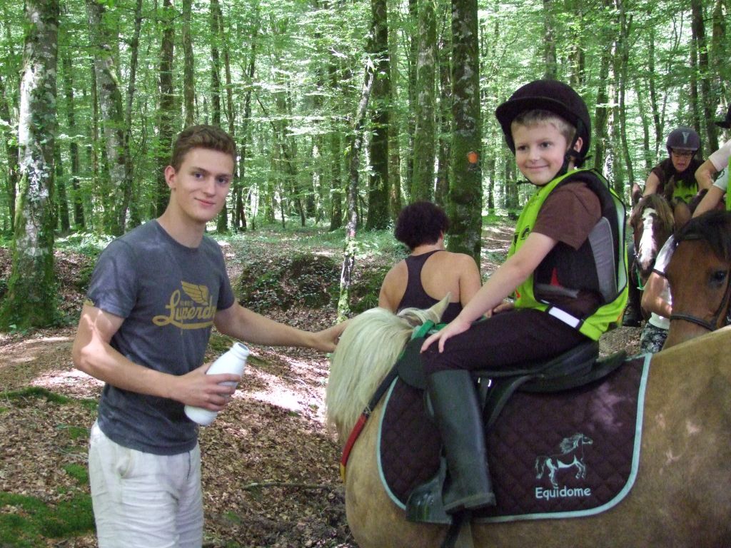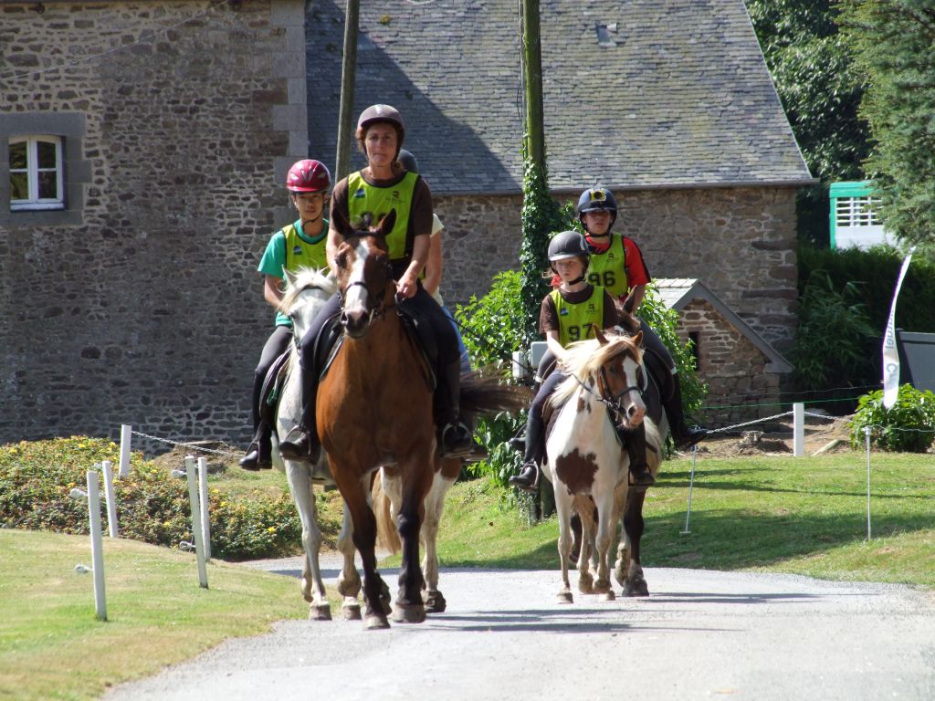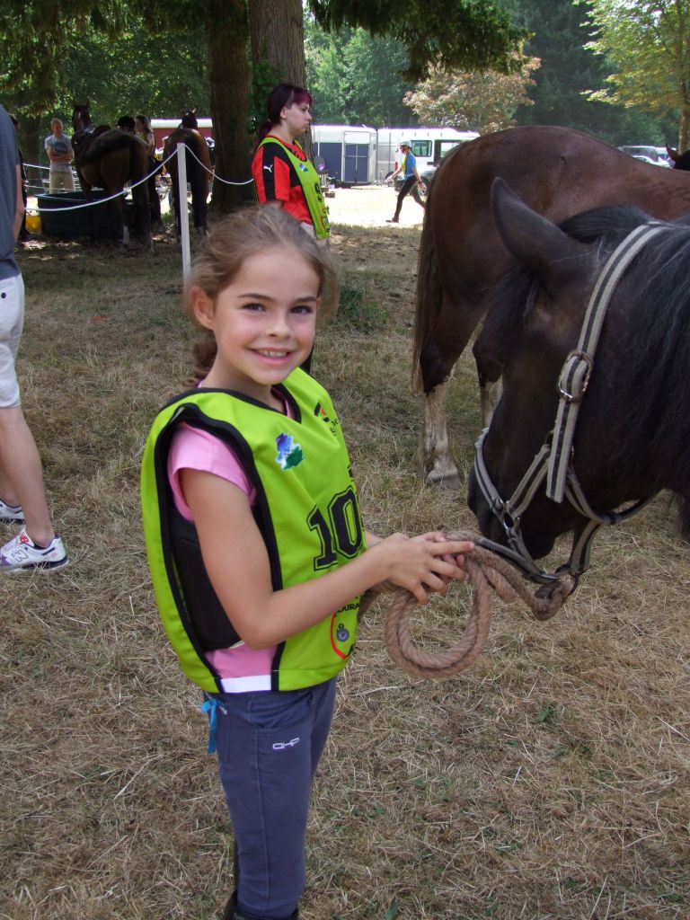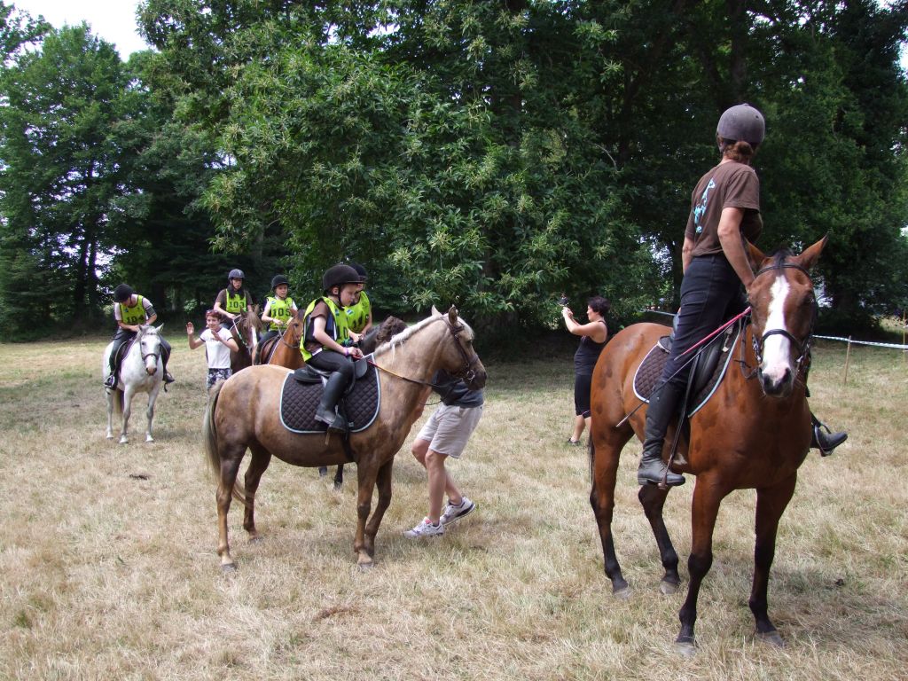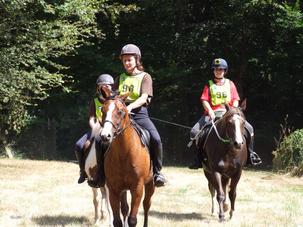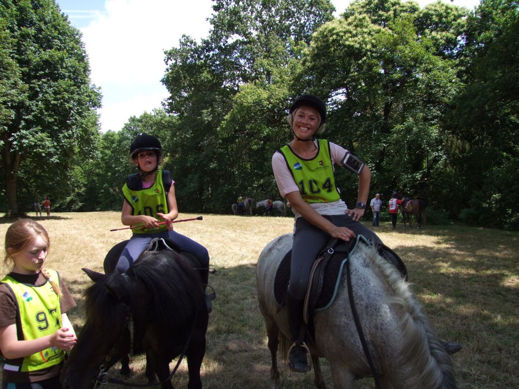 Passons à la deuxième équipe : Un adorable cocktail d'adultes et de très jeunes cavaliers : Léna 8 ans et Maman ( Laëtitia ) au rendez-vous, Léna avec Loustic et Maman avec Prune, Moranne 9 ans ( qui voulait participer avec Laurence ) avec Tornado, Laurence ( qui voulait participer avec Célestin ) avec Sissi et Célestin avec Maman ( moi-même pour les lecteurs qui ne connaissent pas la famille ); Célestin 6 ans montait Katia, la ponette de référence pour les poids plumes et les très jeunes cavaliers. Côté adultes, on s'abstiendra pour les âges.