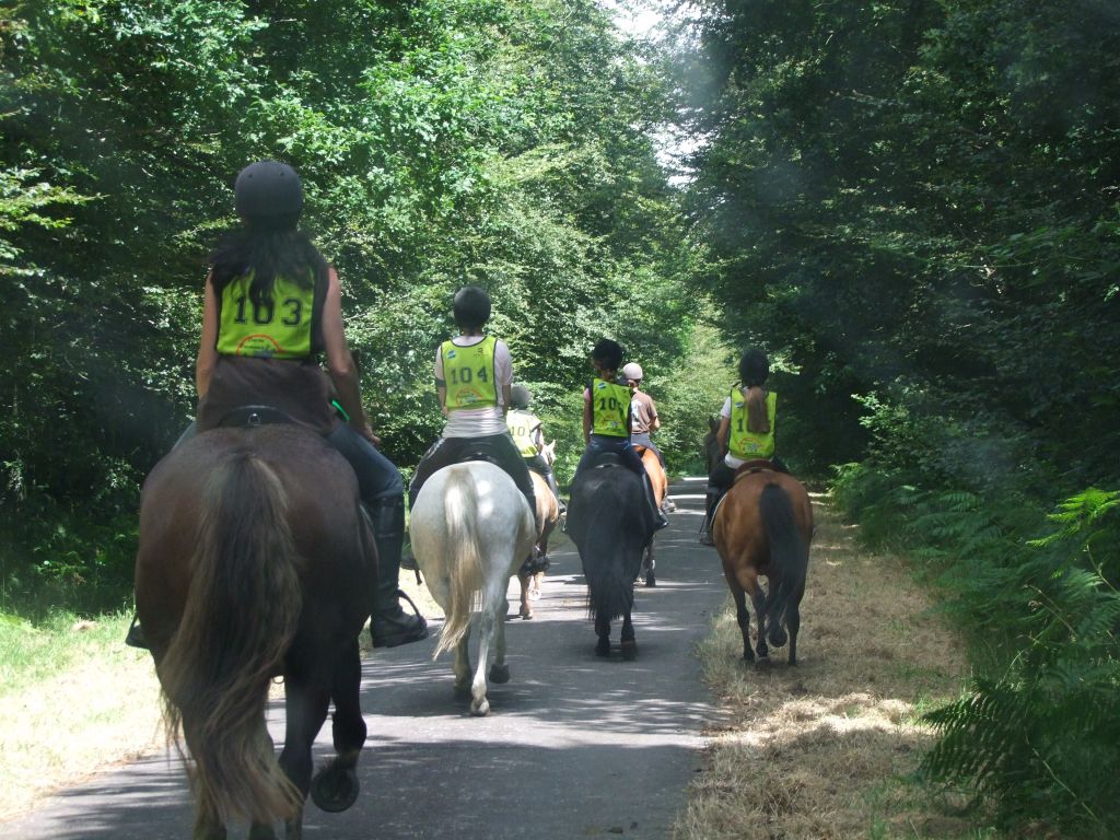 Une très belle course avec des sentiers verdoyants mais avec quelques difficultés que nous avons heureusement surmontées. Première difficulté : les grandes allées là où d'habitude je n'hésite pas à galoper pour gagner du temps me semblaient trop justes pour Célestin d'autant plus que la ponette toussait un peu en début de course donc j'ai choisi le trot actif avec quelques foulées de galop en fin d'allées. Nous étions en 11 kms/h à ce moment-là. La seconde difficulté était celle des gués : n'oublions pas, le site s'appelle le gué au merle ! Je savais que certains poneys comme Katia étaient capables de sauter fort et il fallait éviter la chute ... J'ai fait descendre Célestin et Léna pour la sécurité, Katia a effectivement fait un gros saut sur le premier gué car à ma grande surprise, il restait encore 2 gués à franchir, avec Prune et Sissi bien décidées à prendre leur temps !! Au franchissement du 3ème gué, nous étions complètement à la ramasse par rapport au timing, 5 mn de retard donc environ à 9 kms/h ( nous devions arriver en 10/12 ). Là obligée de passer la seconde. Heureusement, la petite poignée magique que Célestin avait sur sa selle, l'a bien aidé. La ponette était top, les autres cavaliers aussi ! 3ème difficulté : petite chute de Léna qui perd l'équilibre dans une descente ! petite cavalière discrète mais avec un fort caractère heureusement. Elle remonte rapidement sans même broncher.