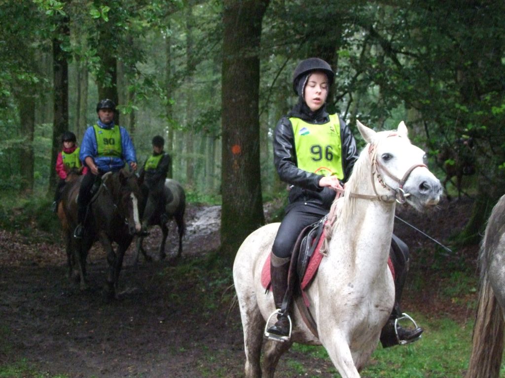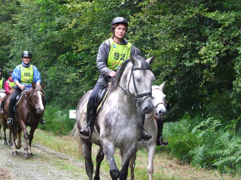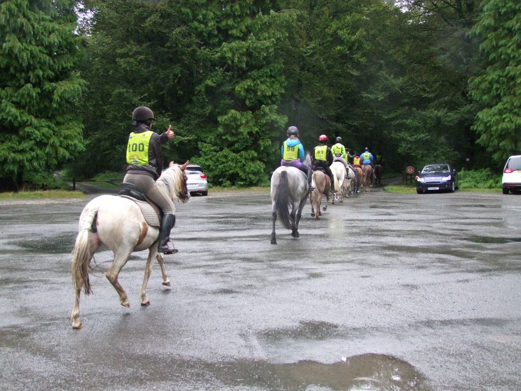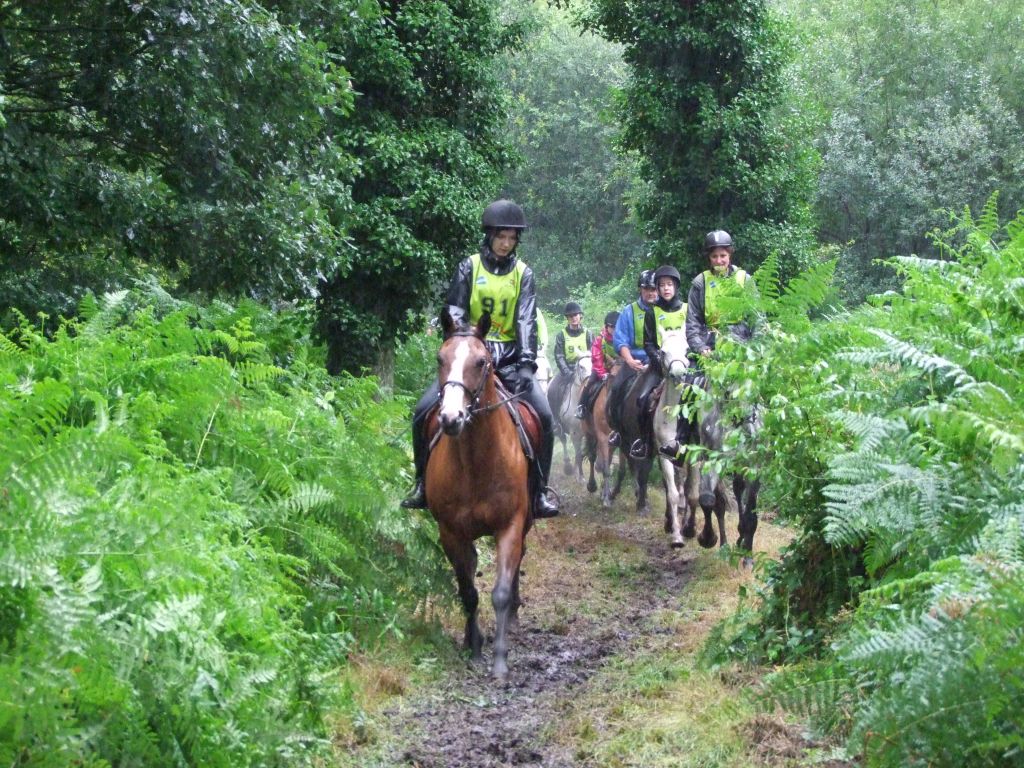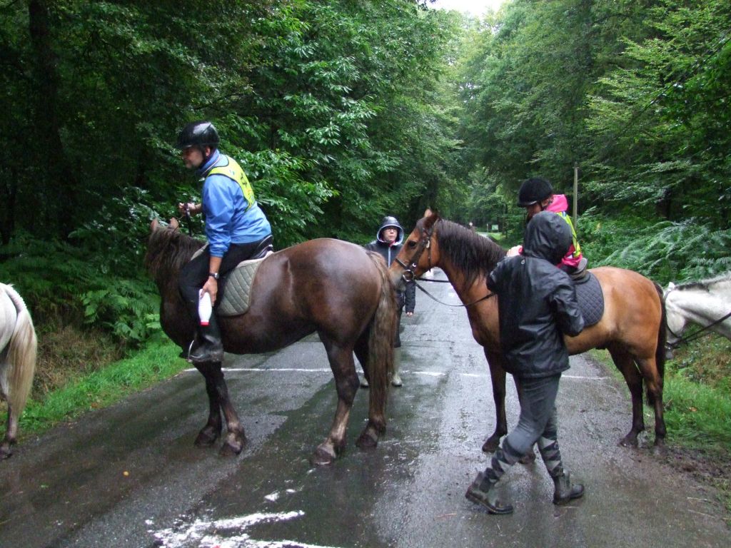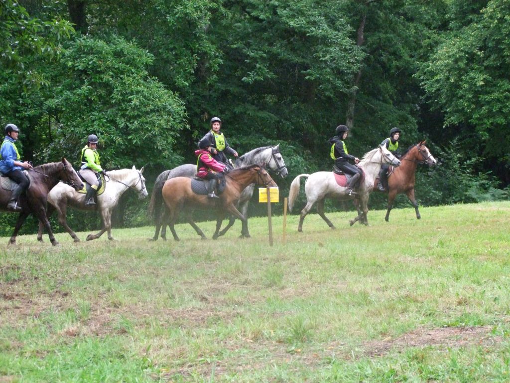 Qui l'aurait cru, une course d'endurance sous la pluie un 26 juillet ! c'était pourtant la triste réalité, 9 cavaliers avaient opté pour la douche dominicale : Maëlys et Mister, Hugo et Sissi, Olyane et Tornado, Linnéa et Prune, Manon et Léo, Jean-François et Katia, Mélanie et Pif, Alexia et Jet, et Maëlenn et Athéna. Termi bien évidemment fidèle au rendez-vous ! Arrivée au Gué au Merle à 9h15 sous un ciel nuageux qui nous laissait sous entendre que la météo s'était trompée, hé non, quelques minutes plus tard, la pluie s'installait sans nous quitter de la journée ! Ligne de départ franchie à 11h50, course de 18 kms en 10/12 kms/h, nous voilà partis ! Termi tente de mener le groupe mais bien vite arrêté par un parapluie, heureusement j'avais prévu Mister plus courageux ...les 5 premiers kilomètres faciles avec une prise d'avance de 3 mn, en revanche les kilomètres suivants furent difficiles avec des sentiers dévastés par la pluie mêlant boue et racines. Heureusement, le moral des troupes était au beau fixe, l'équipe était attentive au terrain, la communication et la solidarité très bonnes ... une petite frayeur avec Athéna qui glisse entraînant la chute de Maëlenn sans gravité ni pour la cavalière qui ne doit pas oublier son gâteau ni pour la ponette. Les quelques minutes d'avance furent vite consommés, à la borne de 10 kms, nous étions en retard de 4 mns par rapport au 10 kms/h, pas facile d'avancer, les chevaux glissaient et la sécurité devenait une priorité ! puis un passage sur un grand chemin droit nous a permis de dérouler quelques belles galopades et à la borne des 15 kms, nous étions à 10 kms/h, tout était jouable ! Sissi perd un fer juste avant le dernier chemin caillouteux, pas de chance et au mauvais moment, mais notre Sissi est guerrière malgré l'inquiétude de son cavalier et elle revient même pas boiteuse ! Dernier kilomètre bien tonique et une ligne d'arrivée franchie à 13h35, 3 mns plus tard l'équipe était disqualifiée, on a bien géré !