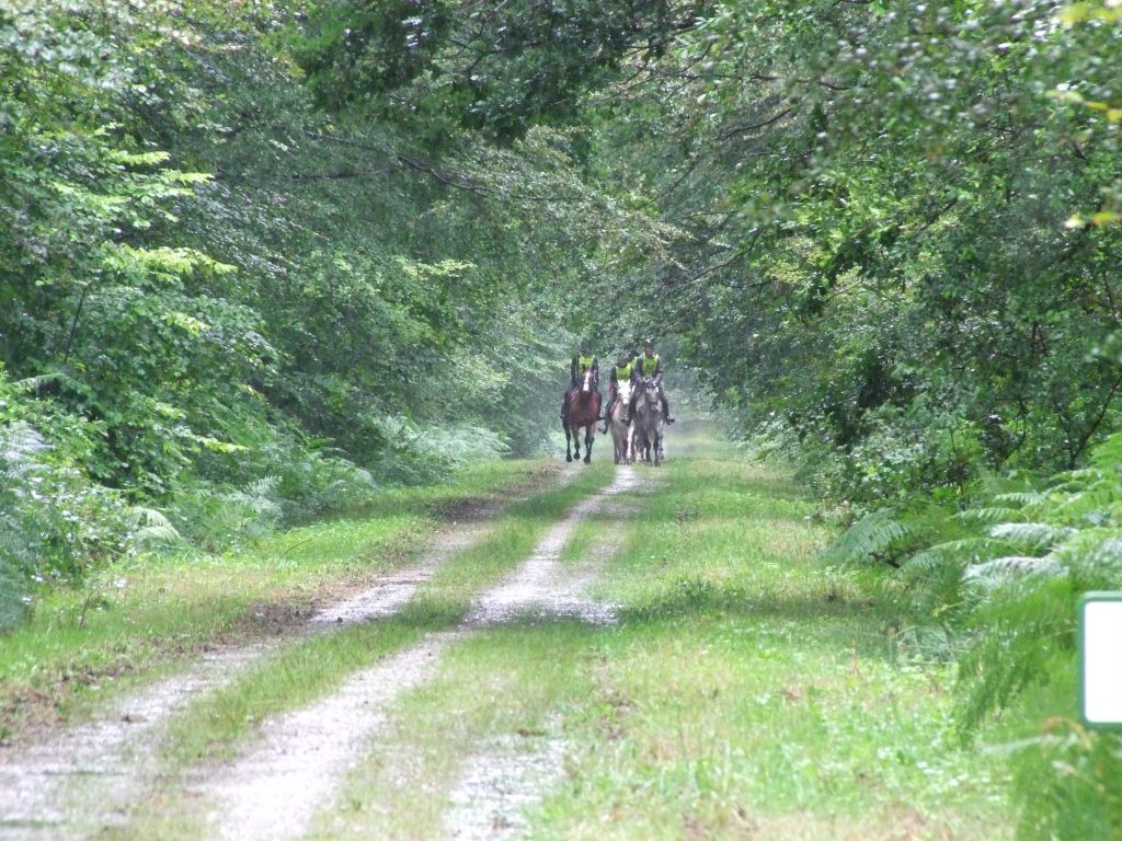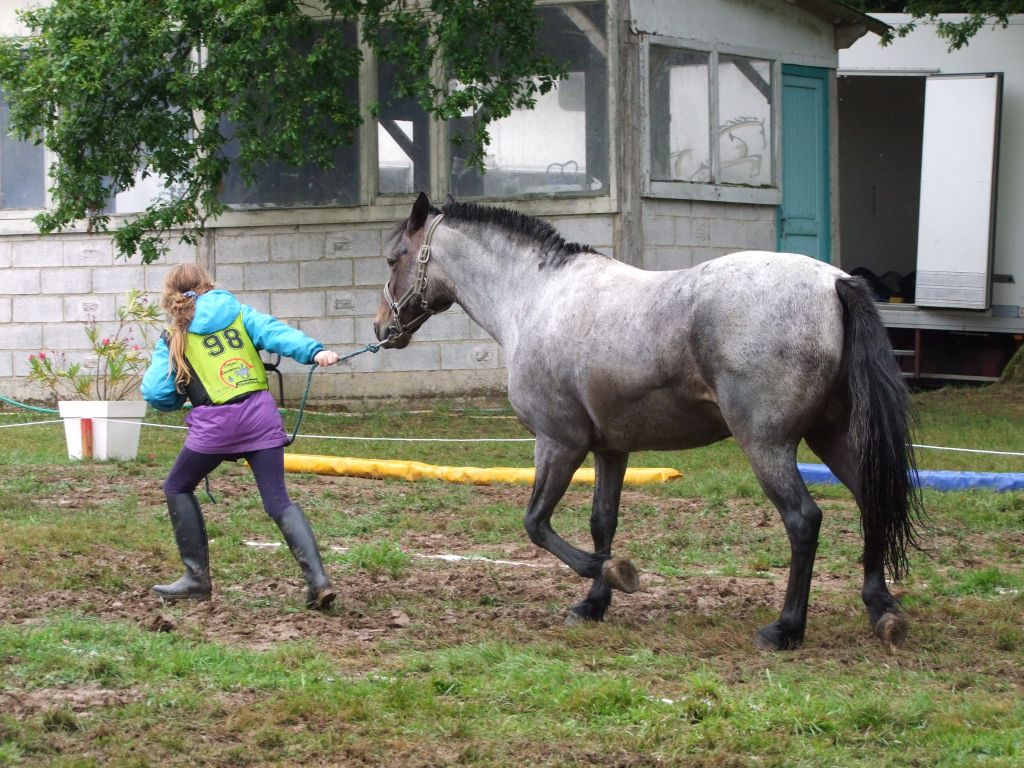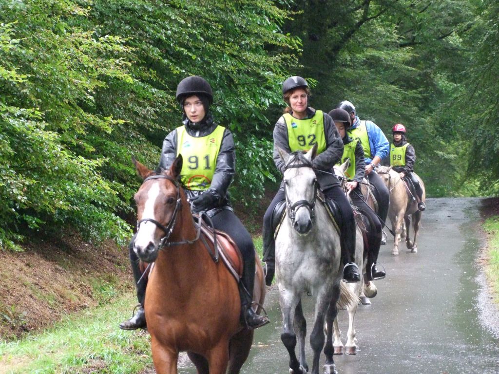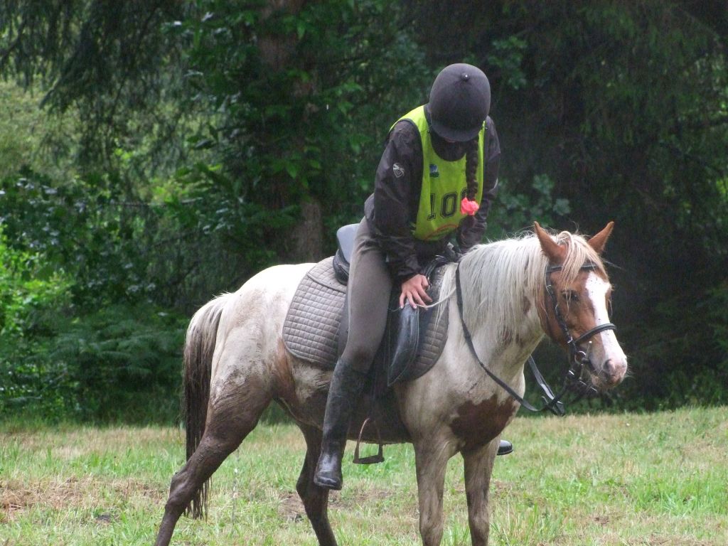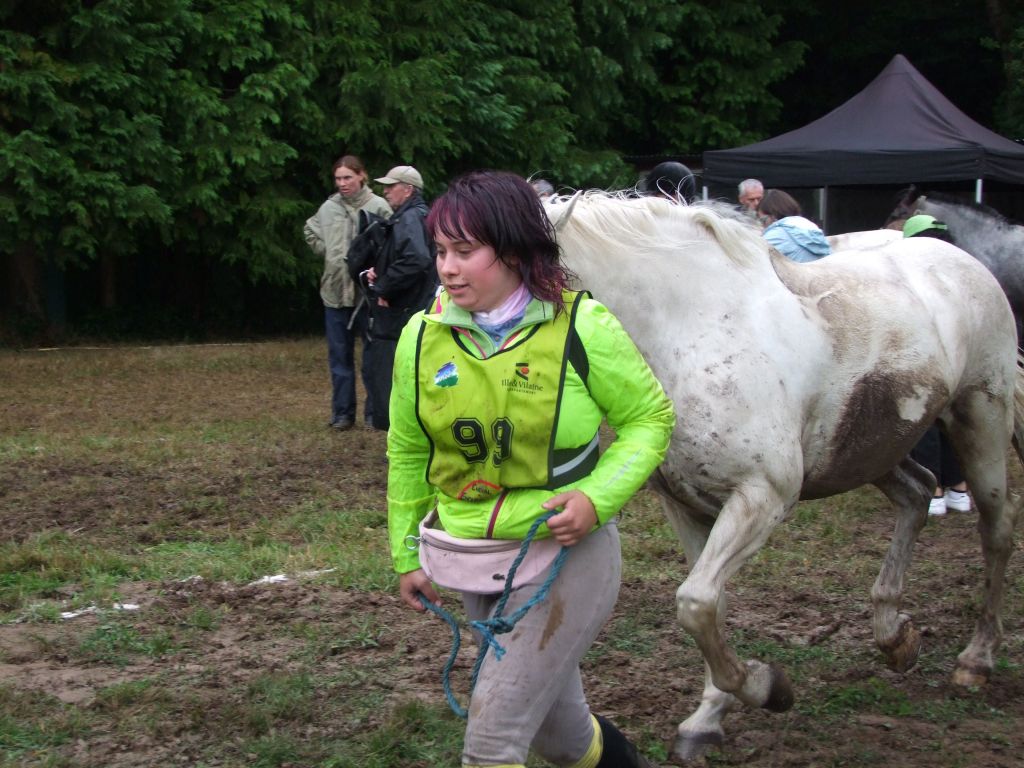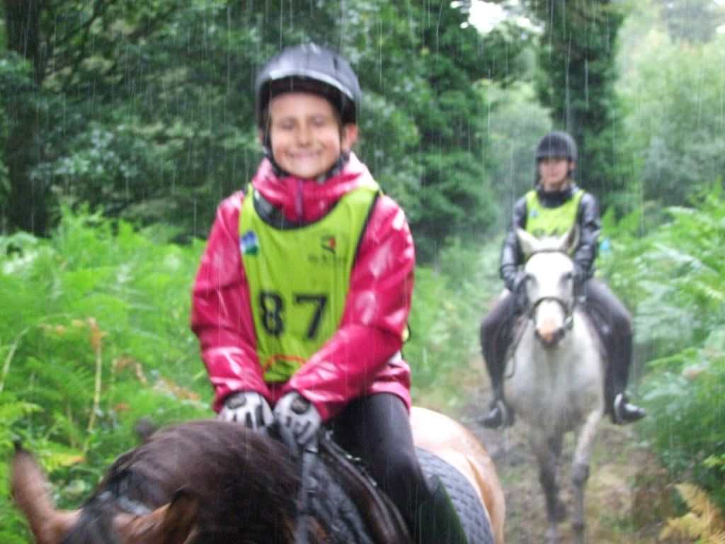 Qui l'aurait cru, une course d'endurance sous la pluie un 26 juillet ! c'était pourtant la triste réalité, 9 cavaliers avaient opté pour la douche dominicale : Maëlys et Mister, Hugo et Sissi, Olyane et Tornado, Linnéa et Prune, Manon et Léo, Jean-François et Katia, Mélanie et Pif, Alexia et Jet, et Maëlenn et Athéna. Termi bien évidemment fidèle au rendez-vous ! Arrivée au Gué au Merle à 9h15 sous un ciel nuageux qui nous laissait sous entendre que la météo s'était trompée, hé non, quelques minutes plus tard, la pluie s'installait sans nous quitter de la journée ! Ligne de départ franchie à 11h50, course de 18 kms en 10/12 kms/h, nous voilà partis ! Termi tente de mener le groupe mais bien vite arrêté par un parapluie, heureusement j'avais prévu Mister plus courageux ...les 5 premiers kilomètres faciles avec une prise d'avance de 3 mn, en revanche les kilomètres suivants furent difficiles avec des sentiers dévastés par la pluie mêlant boue et racines. Heureusement, le moral des troupes était au beau fixe, l'équipe était attentive au terrain, la communication et la solidarité très bonnes ... une petite frayeur avec Athéna qui glisse entraînant la chute de Maëlenn sans gravité ni pour la cavalière qui ne doit pas oublier son gâteau ni pour la ponette. Les quelques minutes d'avance furent vite consommés, à la borne de 10 kms, nous étions en retard de 4 mns par rapport au 10 kms/h, pas facile d'avancer, les chevaux glissaient et la sécurité devenait une priorité ! puis un passage sur un grand chemin droit nous a permis de dérouler quelques belles galopades et à la borne des 15 kms, nous étions à 10 kms/h, tout était jouable ! Sissi perd un fer juste avant le dernier chemin caillouteux, pas de chance et au mauvais moment, mais notre Sissi est guerrière malgré l'inquiétude de son cavalier et elle revient même pas boiteuse ! Dernier kilomètre bien tonique et une ligne d'arrivée franchie à 13h35, 3 mns plus tard l'équipe était disqualifiée, on a bien géré !
