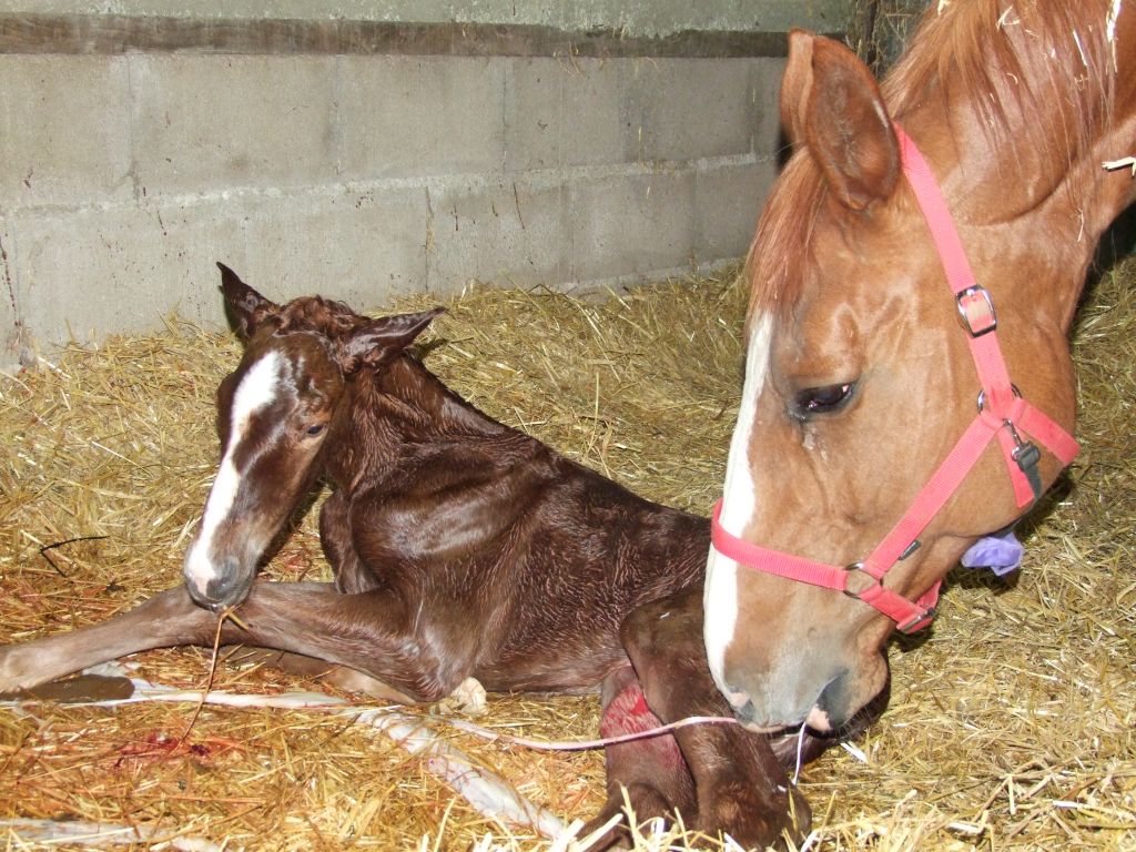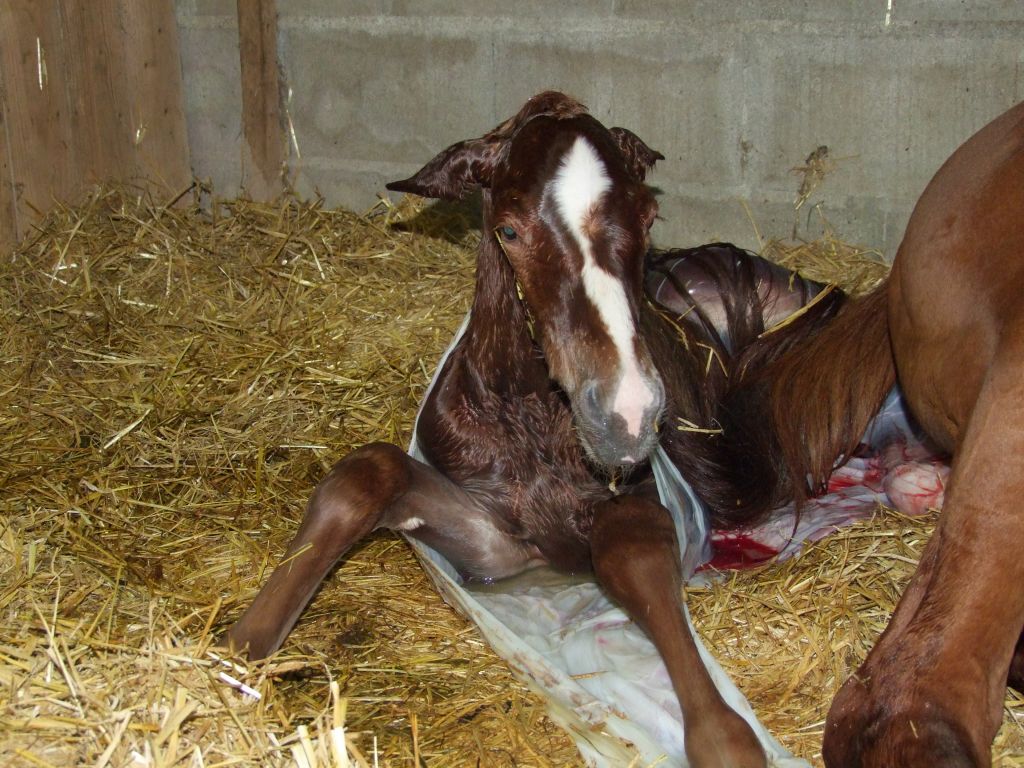 La jument finit par se coucher délicatement avec les poches d'eau en train de se rompre; Le temps d'appeler Olivier, de me lever ( pourtant je jure que je fus rapide ), de répondre au téléphone, d'enfiler les gants et de jeter un coup d'oeil, le poulain était quasi tout sorti. La seule chose que je pus faire a été de le libérer pour qu'il puisse respirer. Sa tête était bien masculine, hé oui pas d'erreur, c'était bien un mâle mais en pleine forme. L'appareil photo fit son travail par la suite et je vous laisse savourer ces jolis photos !
