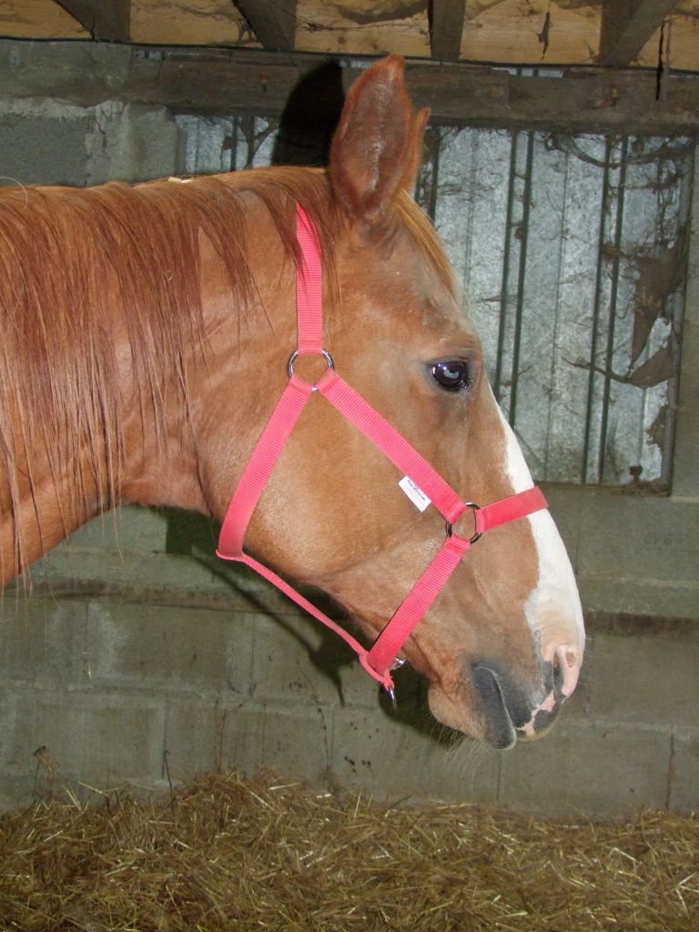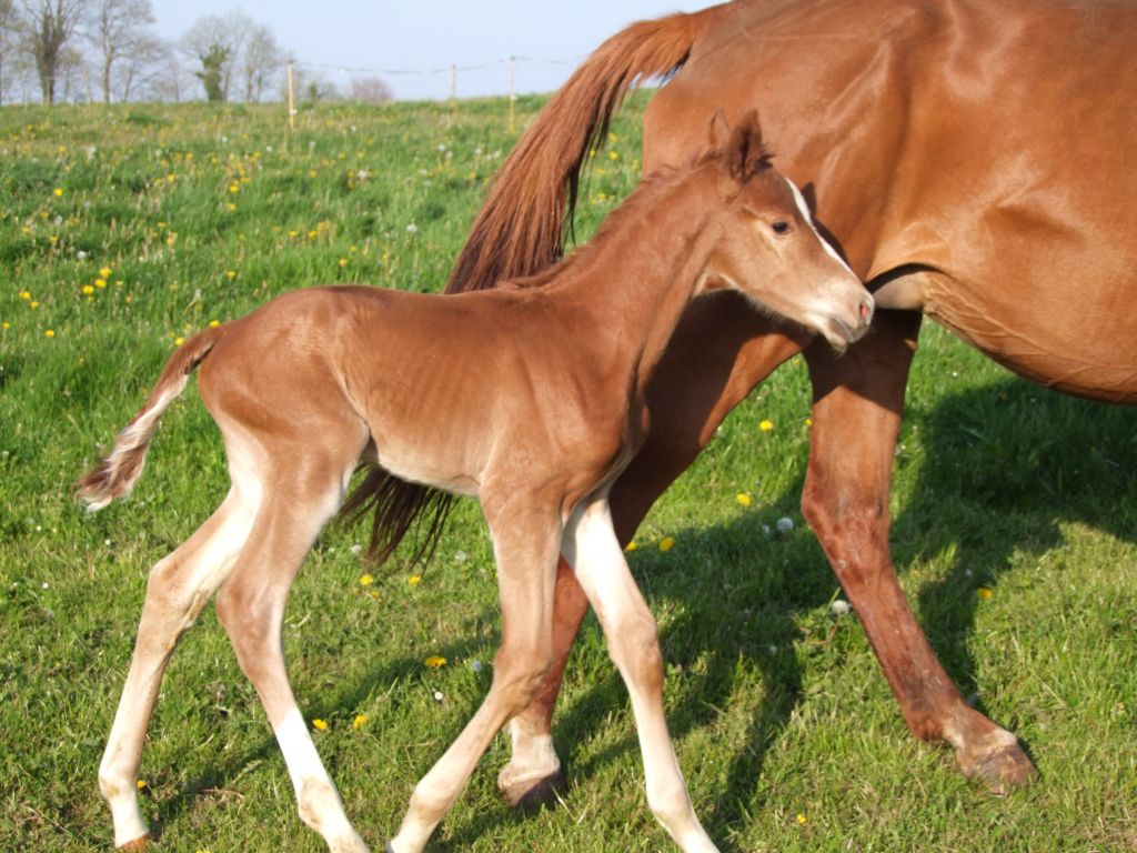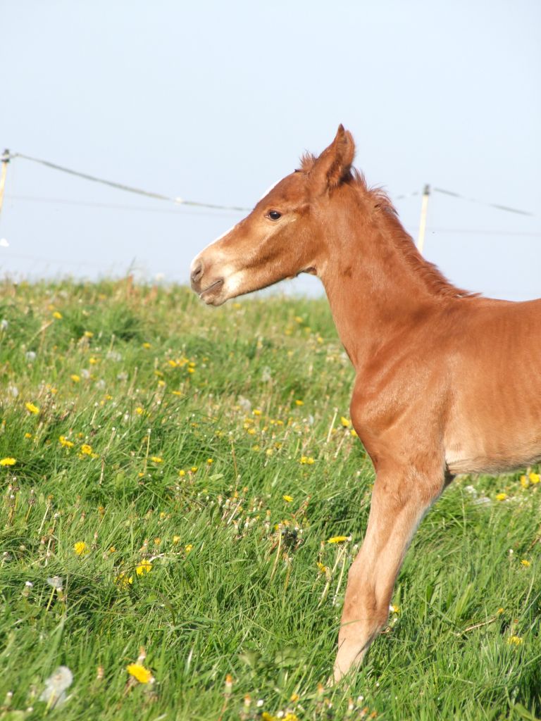 Il a enfin pointé son nez, il est grand, beau, débrouillard, alezan et bien chaussé avec ses 4 balzanes ! C'est un garçon et c'est .............le 2ème garçon de Lola mais son 4ème poulain, un magnifique spécimen né ce matin vers 6h au moment où je finissais par me résigner à dormir encore dans un grand boxe noir accompagné fort heureusement de mes amis les chats, Noisette à ma droite et grosse Bouboule sur mes pieds.
