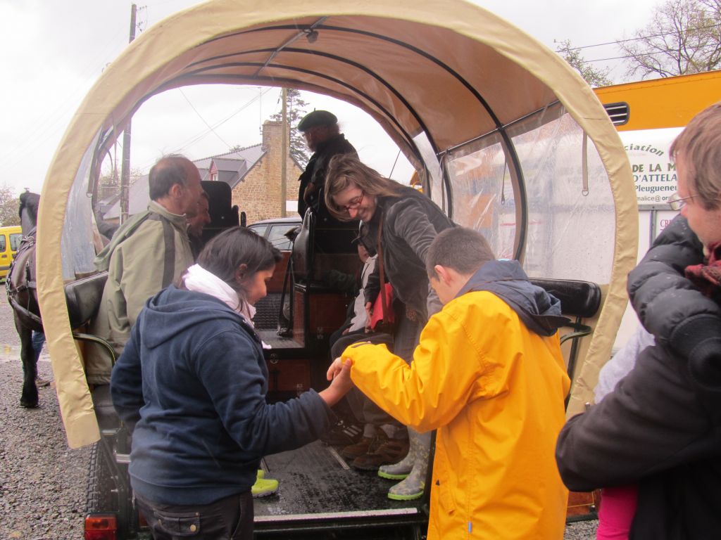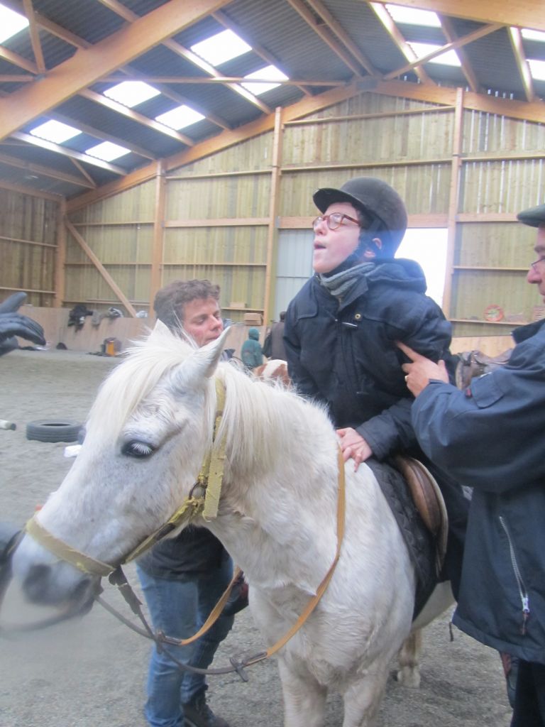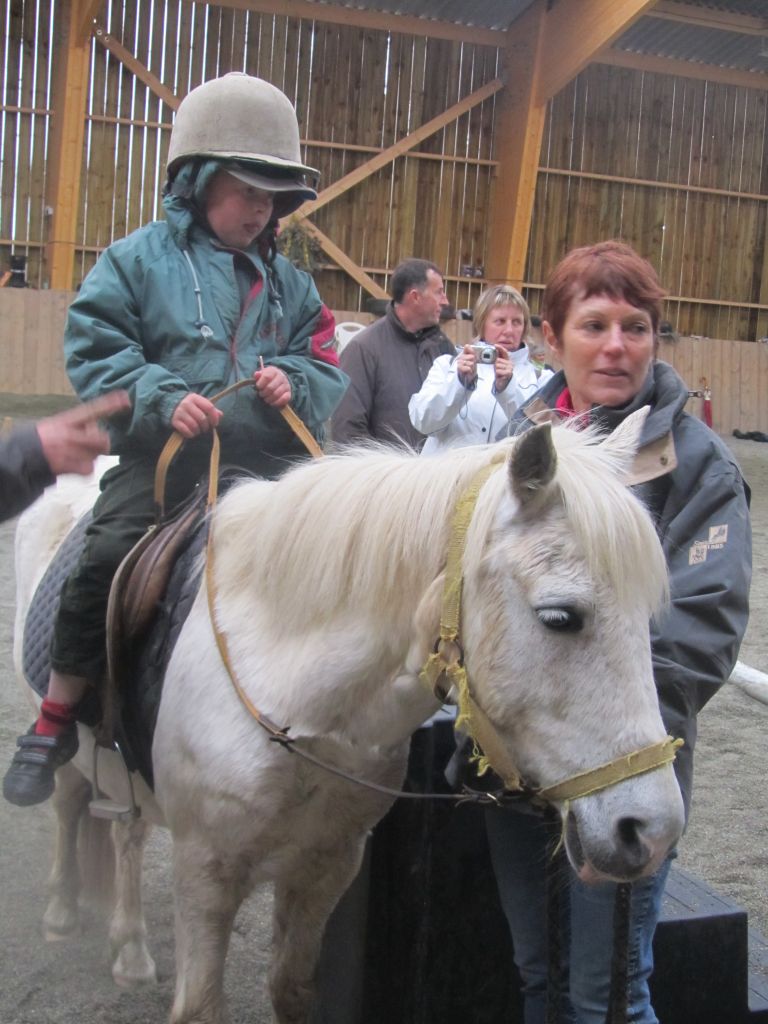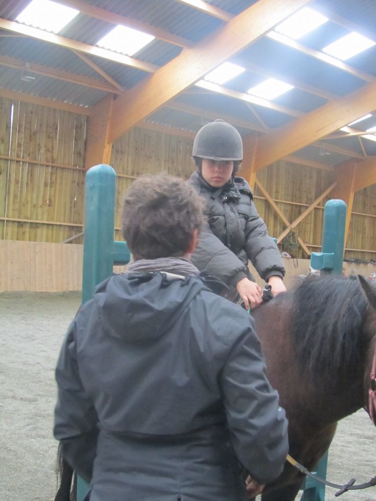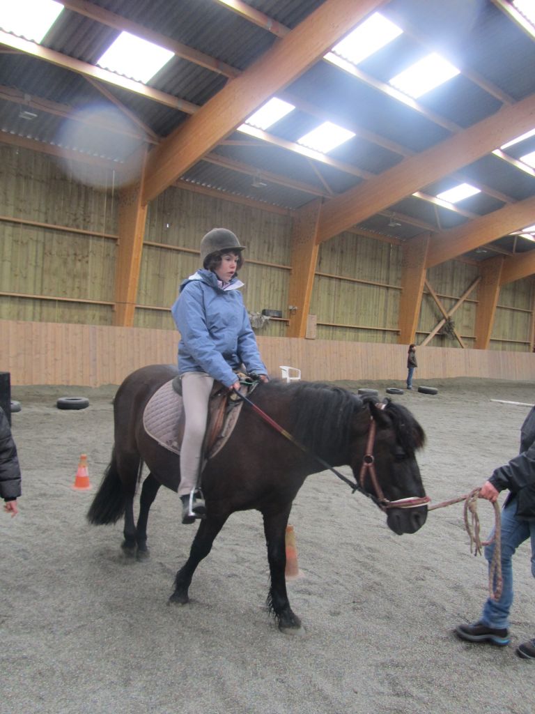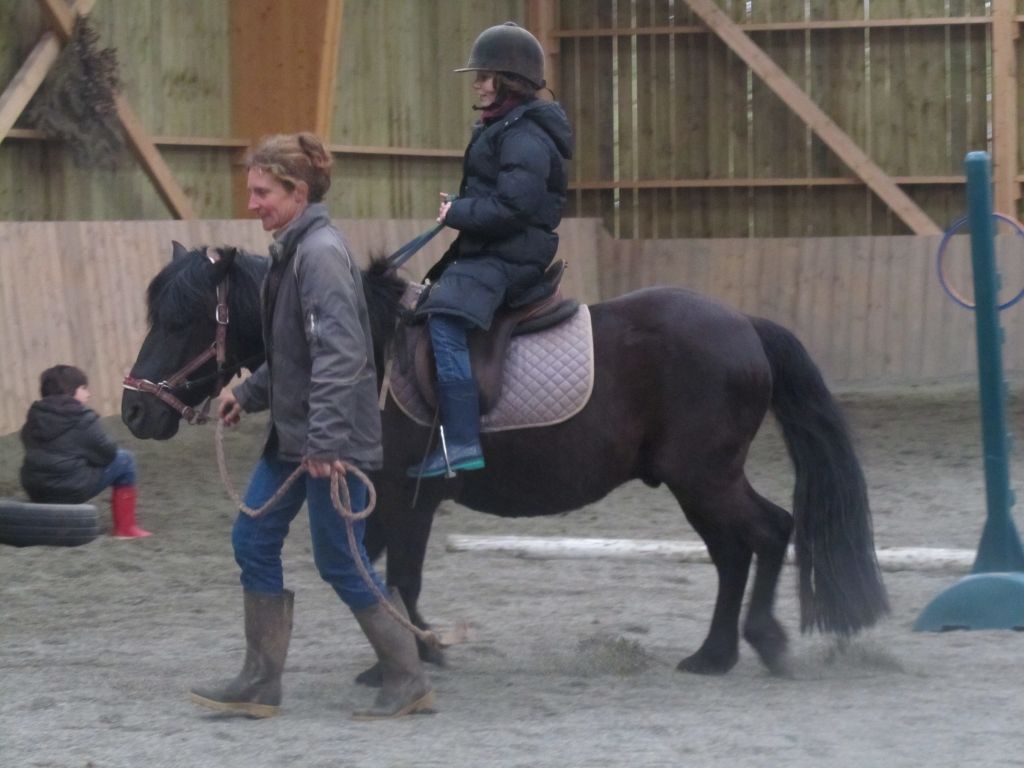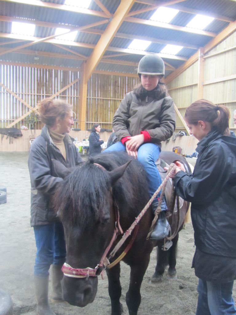 Décidément, le temps n'était pas encore de la partie, notre manège au moins a eu son utilité. L'association Equidicap m'avait sollicité en milieu d'année pour organiser une après-midi famille autour de plusieurs ateliers à cheval (parcours à poney, attelage, voltige et brossage). C'était une grande première pour nous et c'était l'occasion de mettre en valeur tout ce qui peut être proposé à poney auprès des personnes handicapées. Durant tout l'après-midi, environ 25 cavaliers ont pu naviguer autour des différentes activités avec un immense plaisir. J'étais chargée de proposer un poney en voltige; Madame étant en arrêt de travail, je me suis dit que Jet pouvait faire l'affaire mais à ma grand surprise, Jet n'était pas du tout coopératif, deux immenses mérens attachés à l'entrée du manège lui avaient fait perdre la tête. Madame a donc repris prématurément du service que Gwénola a admirablement bien gérée. Je la remercie vivement en passant ! Irène et Valérie ont pris en charge le parcours de maniabilité, du coup je me suis retrouvée pendant quelques temps spectatrice, ce qui est tellement rare... Dans une ambiance chaleureuse, les cavaliers ont pu découvrir plusieurs exercices à cheval sollicitant l'équilibre, la souplesse et l'adresse. L'attelage malheureusement s'est déroulé sous une pluie tenace. Je tiens à remercier vivement les familles ayant fait l'effort de se déplacer malgré le temps, l'association Equidicap pour sa parfaite organisation, et plus particulièrement Valérie, Irène, Nolwenn et Gwénola, ainsi que tous les jeunes de mon club venus me donner un coup de main: Flo, Nono, Violette et Océane ...