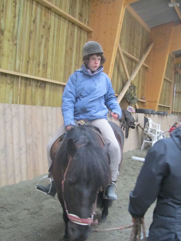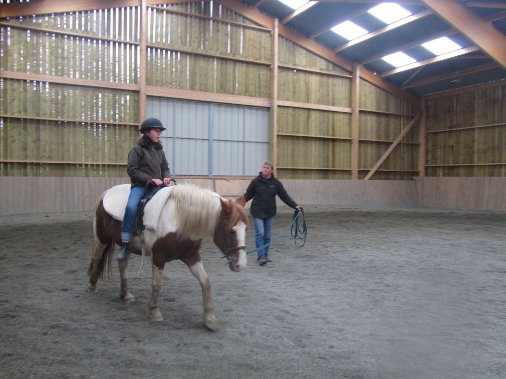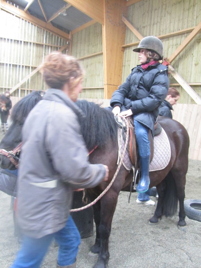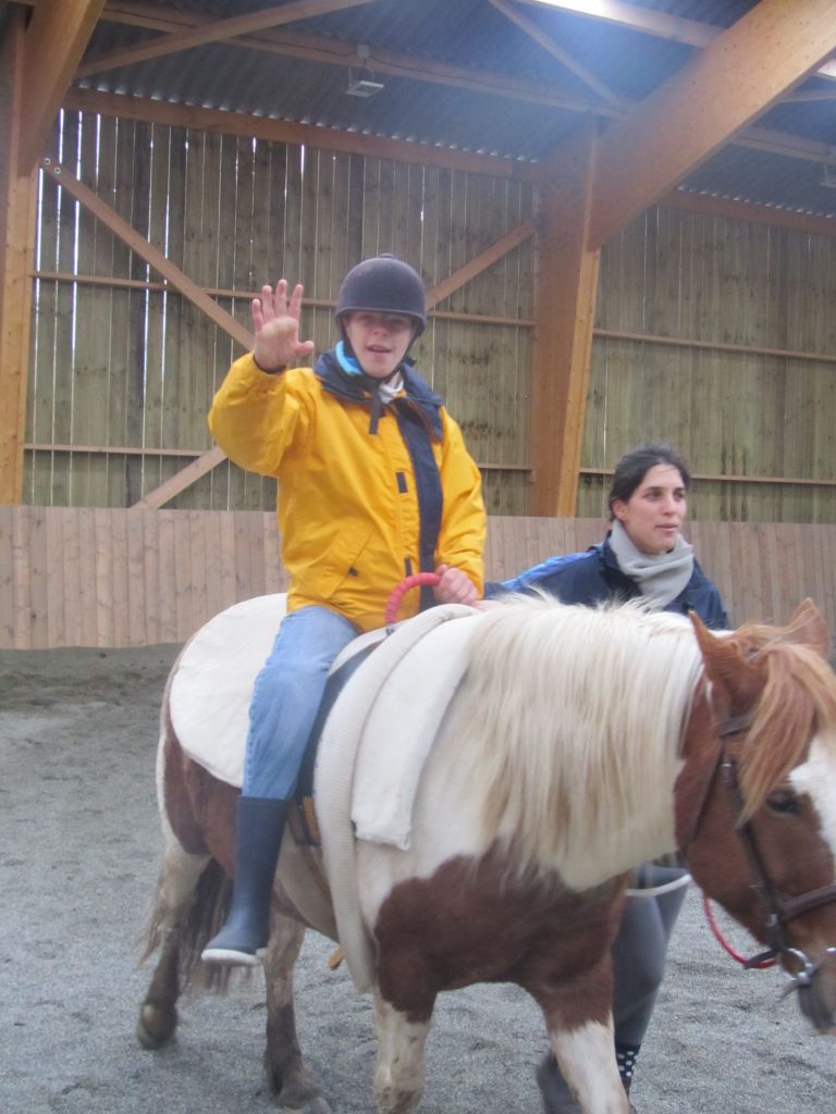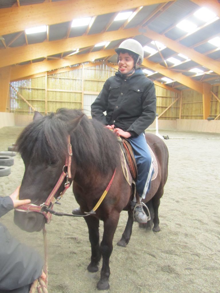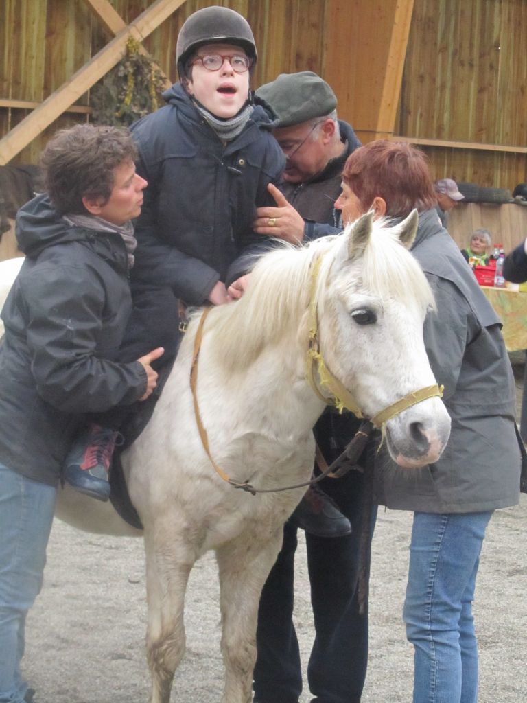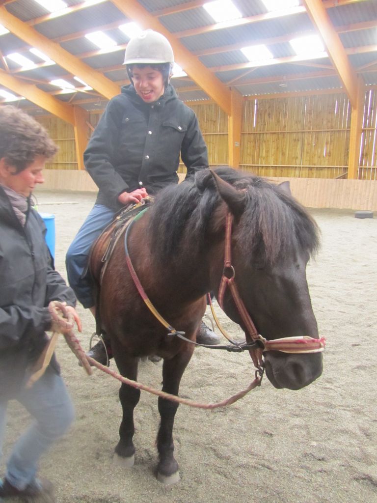 Décidément, le temps n'était pas encore de la partie, notre manège au moins a eu son utilité. L'association Equidicap m'avait sollicité en milieu d'année pour organiser une après-midi famille autour de plusieurs ateliers à cheval (parcours à poney, attelage, voltige et brossage). C'était une grande première pour nous et c'était l'occasion de mettre en valeur tout ce qui peut être proposé à poney auprès des personnes handicapées. Durant tout l'après-midi, environ 25 cavaliers ont pu naviguer autour des différentes activités avec un immense plaisir. J'étais chargée de proposer un poney en voltige; Madame étant en arrêt de travail, je me suis dit que Jet pouvait faire l'affaire mais à ma grand surprise, Jet n'était pas du tout coopératif, deux immenses mérens attachés à l'entrée du manège lui avaient fait perdre la tête. Madame a donc repris prématurément du service que Gwénola a admirablement bien gérée. Je la remercie vivement en passant ! Irène et Valérie ont pris en charge le parcours de maniabilité, du coup je me suis retrouvée pendant quelques temps spectatrice, ce qui est tellement rare... Dans une ambiance chaleureuse, les cavaliers ont pu découvrir plusieurs exercices à cheval sollicitant l'équilibre, la souplesse et l'adresse. L'attelage malheureusement s'est déroulé sous une pluie tenace. Je tiens à remercier vivement les familles ayant fait l'effort de se déplacer malgré le temps, l'association Equidicap pour sa parfaite organisation, et plus particulièrement Valérie, Irène, Nolwenn et Gwénola, ainsi que tous les jeunes de mon club venus me donner un coup de main: Flo, Nono, Violette et Océane ...