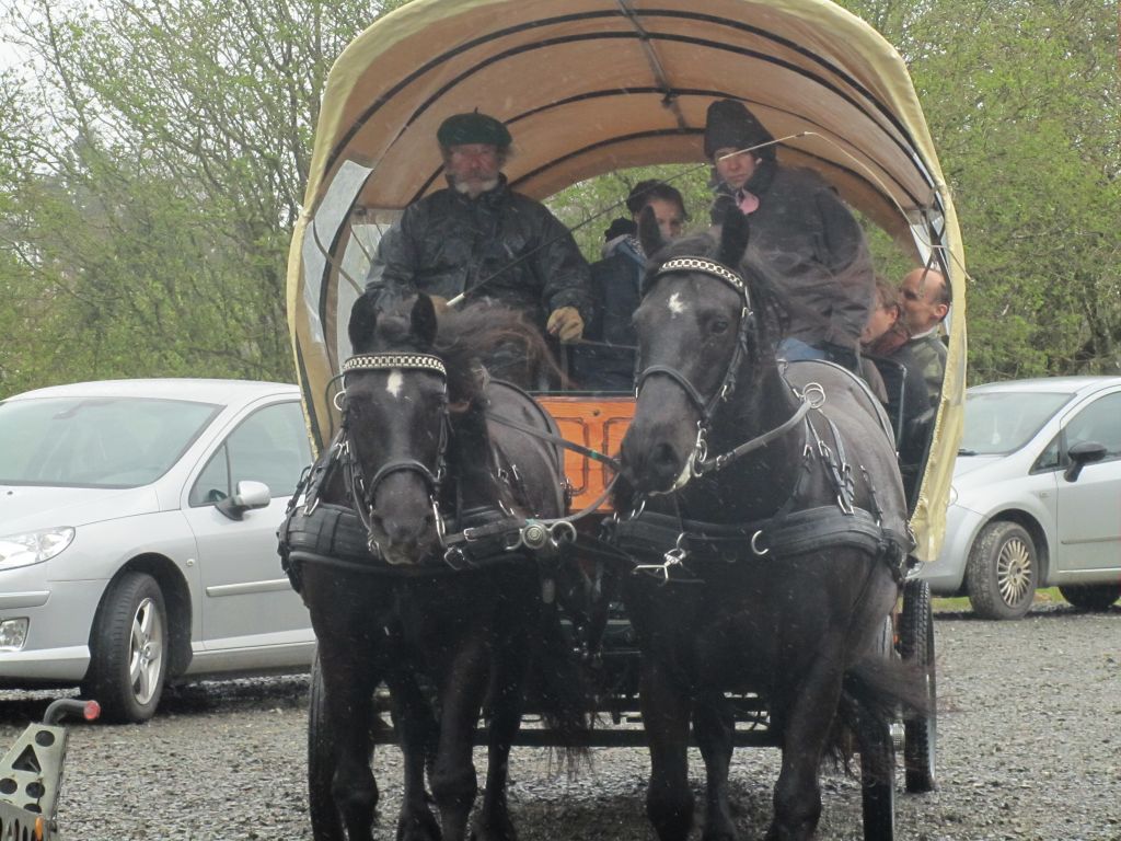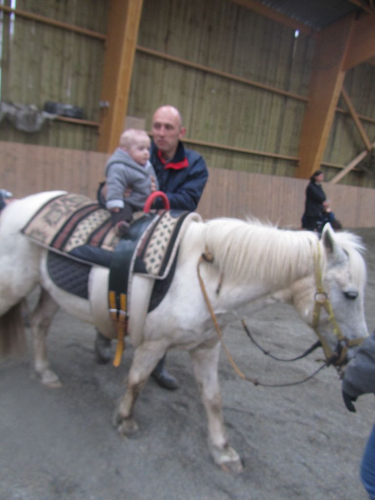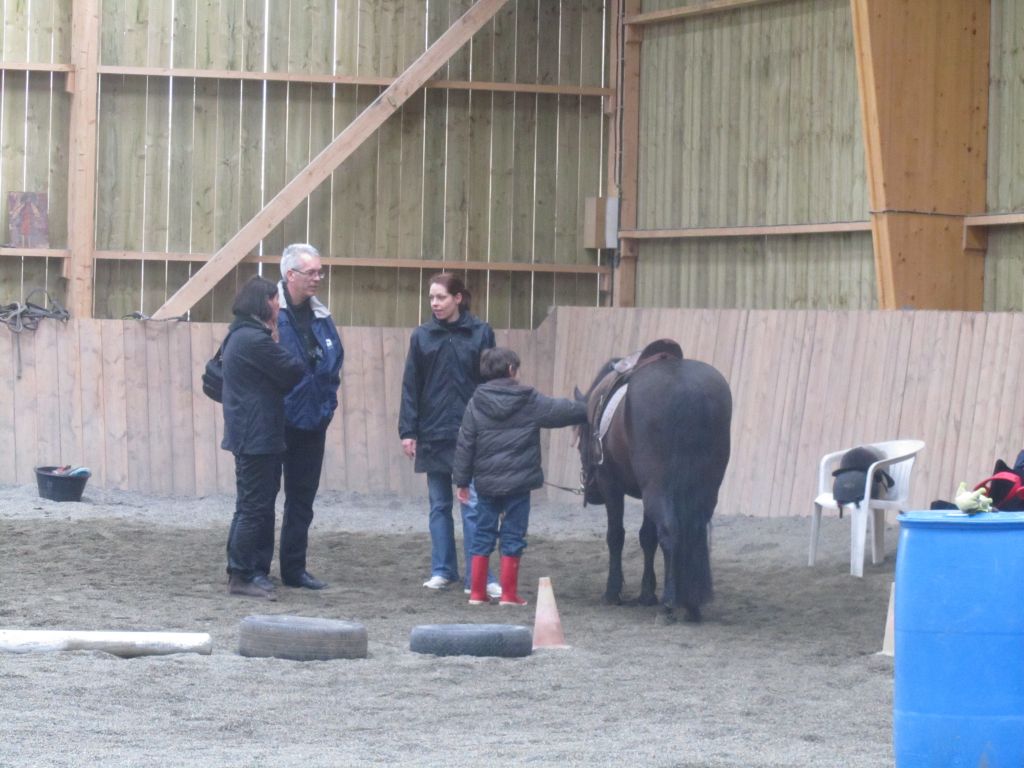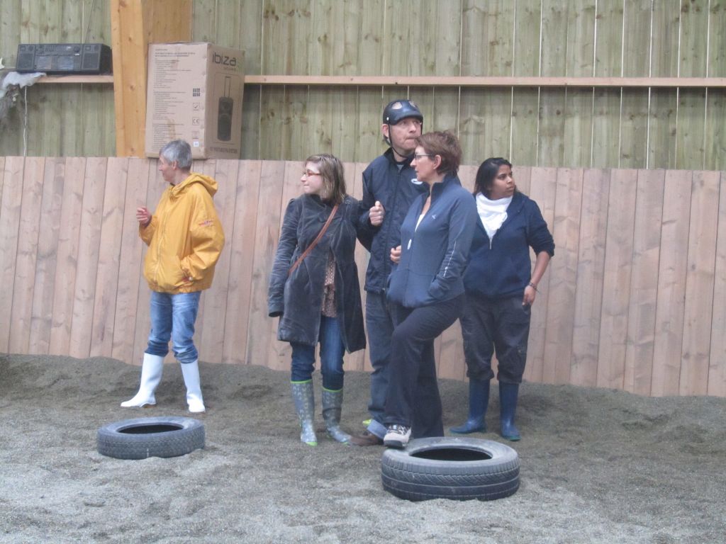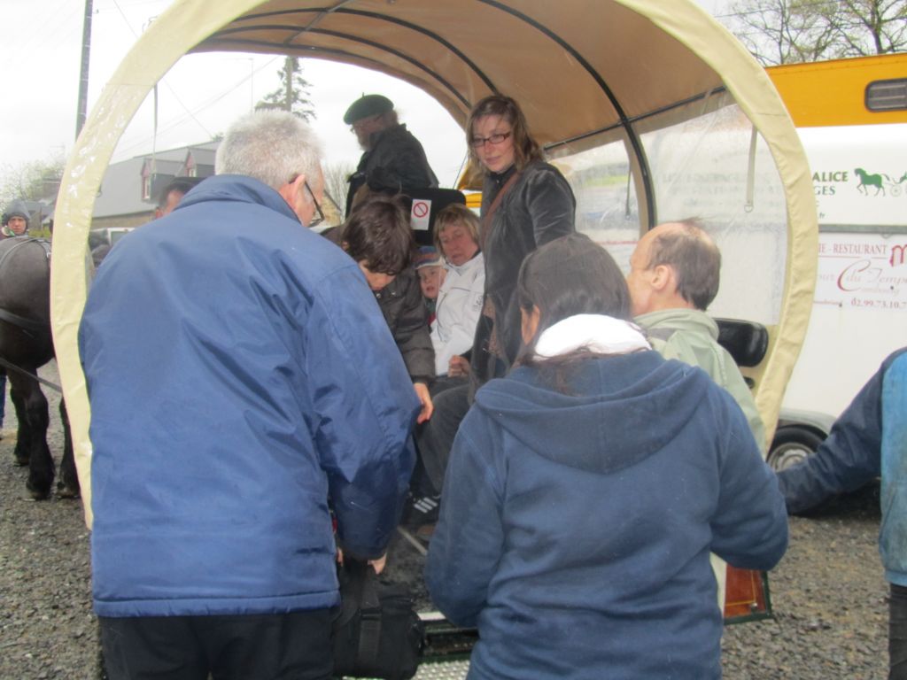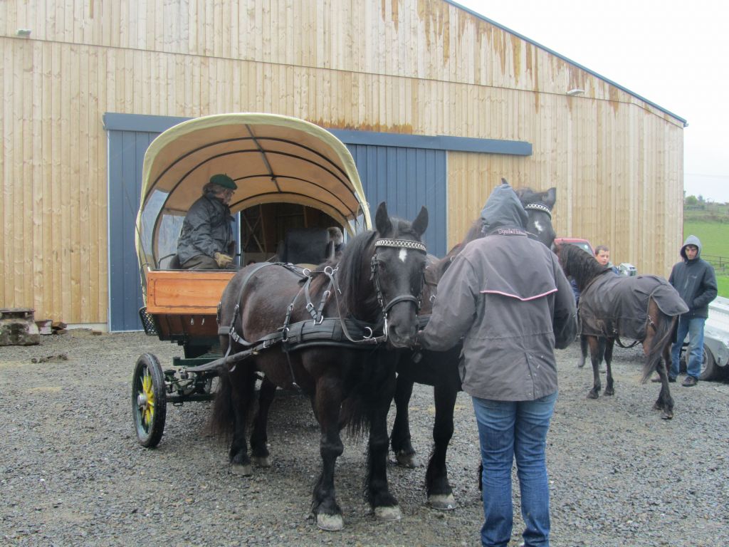 Décidément, le temps n'était pas encore de la partie, notre manège au moins a eu son utilité. L'association Equidicap m'avait sollicité en milieu d'année pour organiser une après-midi famille autour de plusieurs ateliers à cheval (parcours à poney, attelage, voltige et brossage). C'était une grande première pour nous et c'était l'occasion de mettre en valeur tout ce qui peut être proposé à poney auprès des personnes handicapées. Durant tout l'après-midi, environ 25 cavaliers ont pu naviguer autour des différentes activités avec un immense plaisir. J'étais chargée de proposer un poney en voltige; Madame étant en arrêt de travail, je me suis dit que Jet pouvait faire l'affaire mais à ma grand surprise, Jet n'était pas du tout coopératif, deux immenses mérens attachés à l'entrée du manège lui avaient fait perdre la tête. Madame a donc repris prématurément du service que Gwénola a admirablement bien gérée. Je la remercie vivement en passant ! Irène et Valérie ont pris en charge le parcours de maniabilité, du coup je me suis retrouvée pendant quelques temps spectatrice, ce qui est tellement rare... Dans une ambiance chaleureuse, les cavaliers ont pu découvrir plusieurs exercices à cheval sollicitant l'équilibre, la souplesse et l'adresse. L'attelage malheureusement s'est déroulé sous une pluie tenace. Je tiens à remercier vivement les familles ayant fait l'effort de se déplacer malgré le temps, l'association Equidicap pour sa parfaite organisation, et plus particulièrement Valérie, Irène, Nolwenn et Gwénola, ainsi que tous les jeunes de mon club venus me donner un coup de main: Flo, Nono, Violette et Océane ...