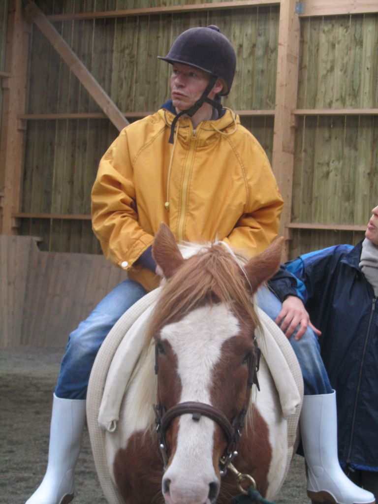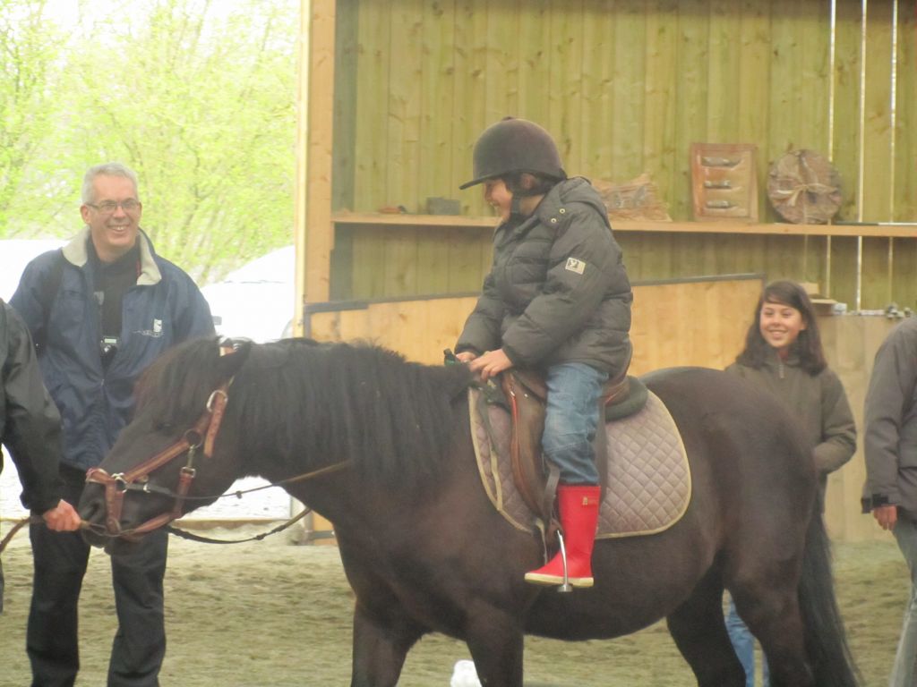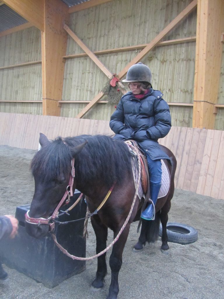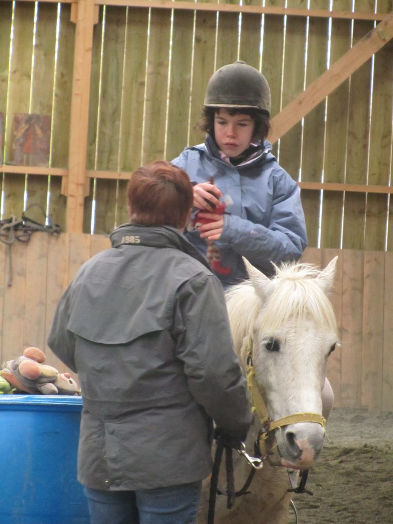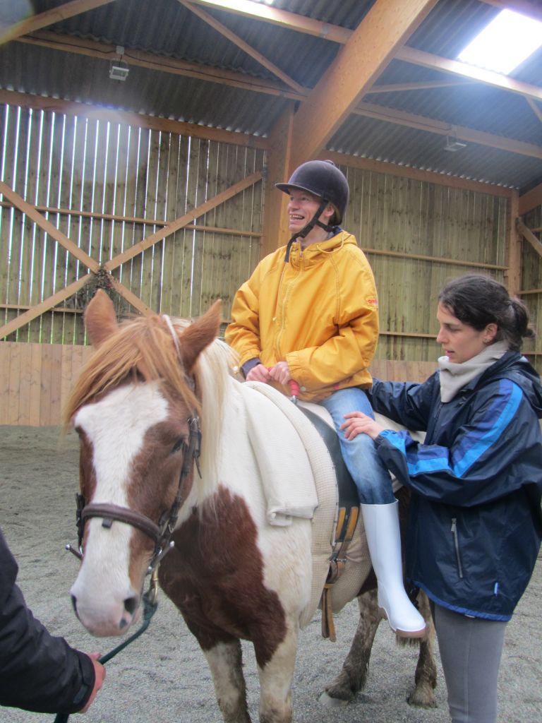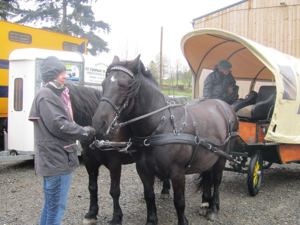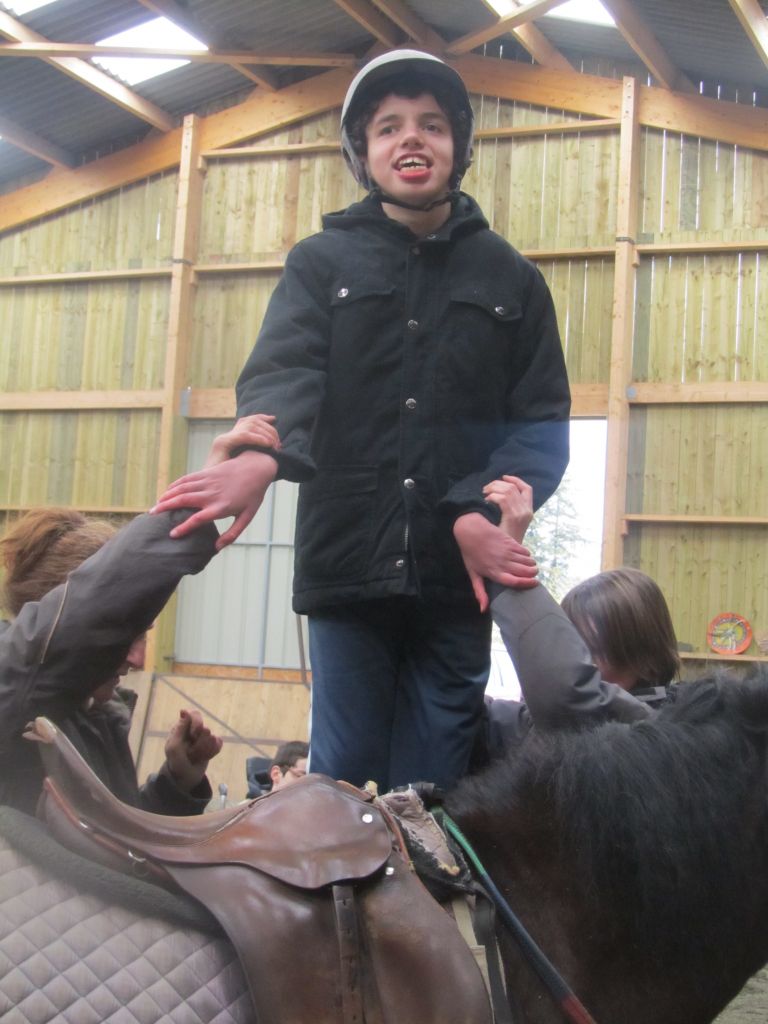 Décidément, le temps n'était pas encore de la partie, notre manège au moins a eu son utilité. L'association Equidicap m'avait sollicité en milieu d'année pour organiser une après-midi famille autour de plusieurs ateliers à cheval (parcours à poney, attelage, voltige et brossage). C'était une grande première pour nous et c'était l'occasion de mettre en valeur tout ce qui peut être proposé à poney auprès des personnes handicapées. Durant tout l'après-midi, environ 25 cavaliers ont pu naviguer autour des différentes activités avec un immense plaisir. J'étais chargée de proposer un poney en voltige; Madame étant en arrêt de travail, je me suis dit que Jet pouvait faire l'affaire mais à ma grand surprise, Jet n'était pas du tout coopératif, deux immenses mérens attachés à l'entrée du manège lui avaient fait perdre la tête. Madame a donc repris prématurément du service que Gwénola a admirablement bien gérée. Je la remercie vivement en passant ! Irène et Valérie ont pris en charge le parcours de maniabilité, du coup je me suis retrouvée pendant quelques temps spectatrice, ce qui est tellement rare... Dans une ambiance chaleureuse, les cavaliers ont pu découvrir plusieurs exercices à cheval sollicitant l'équilibre, la souplesse et l'adresse. L'attelage malheureusement s'est déroulé sous une pluie tenace. Je tiens à remercier vivement les familles ayant fait l'effort de se déplacer malgré le temps, l'association Equidicap pour sa parfaite organisation, et plus particulièrement Valérie, Irène, Nolwenn et Gwénola, ainsi que tous les jeunes de mon club venus me donner un coup de main: Flo, Nono, Violette et Océane ...